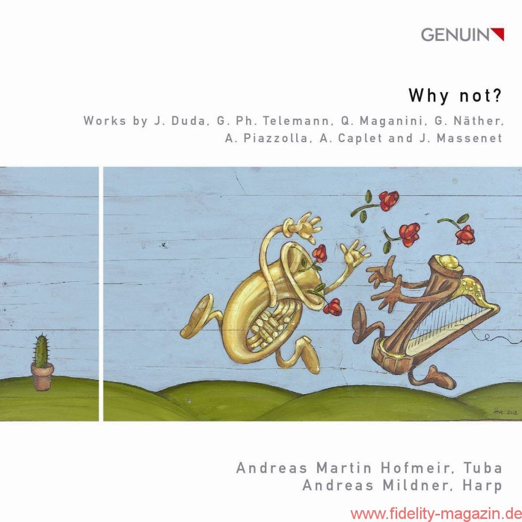 Es gibt aber noch eine zweite CD: mit dem weltweit vermutlich ersten Tuba-Harfen-Duo. Diese Kombination geht eigentlich gar nicht, mag man im ersten Moment denken – bis die 17 Stücke auf der CD Why not? erklingen. Neben Originalkompositionen des schon genannten Komponisten Duda finden sich hier auch Bearbeitungen von klassischen Stücken, eine Fantasie von Telemann zum Beispiel, ein Stück mit dem Titel „Nightclub 1960“ nach Astor Piazzolla und eine sehr verhaltene Meditation aus Jules Massenets Oper Thais. Andreas Hofmeir, der übrigens nicht nur Tubist der erfolgreichen Bavarian-Brass-Band LaBrassBanda ist (Anm. d. Red.: bis 2014), sondern auch ordentlicher Professor für Tuba am Mozarteum in Salzburg, spielt das mit so vielen warmen Tönen, weichem Ansatz und erstaunlicher Vielfalt, dass man dann letztlich doch zu dem Schluss kommt: Tuba und Harfe, warum eigentlich nicht?