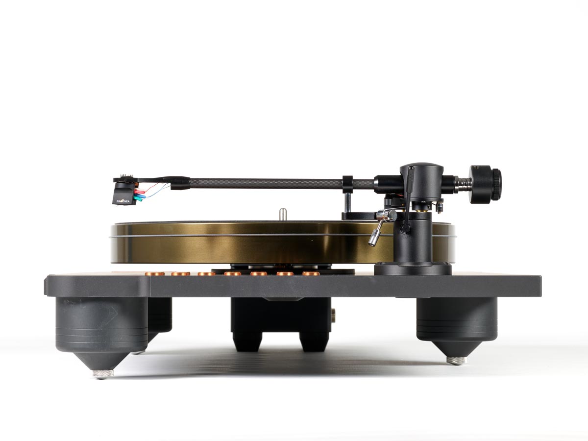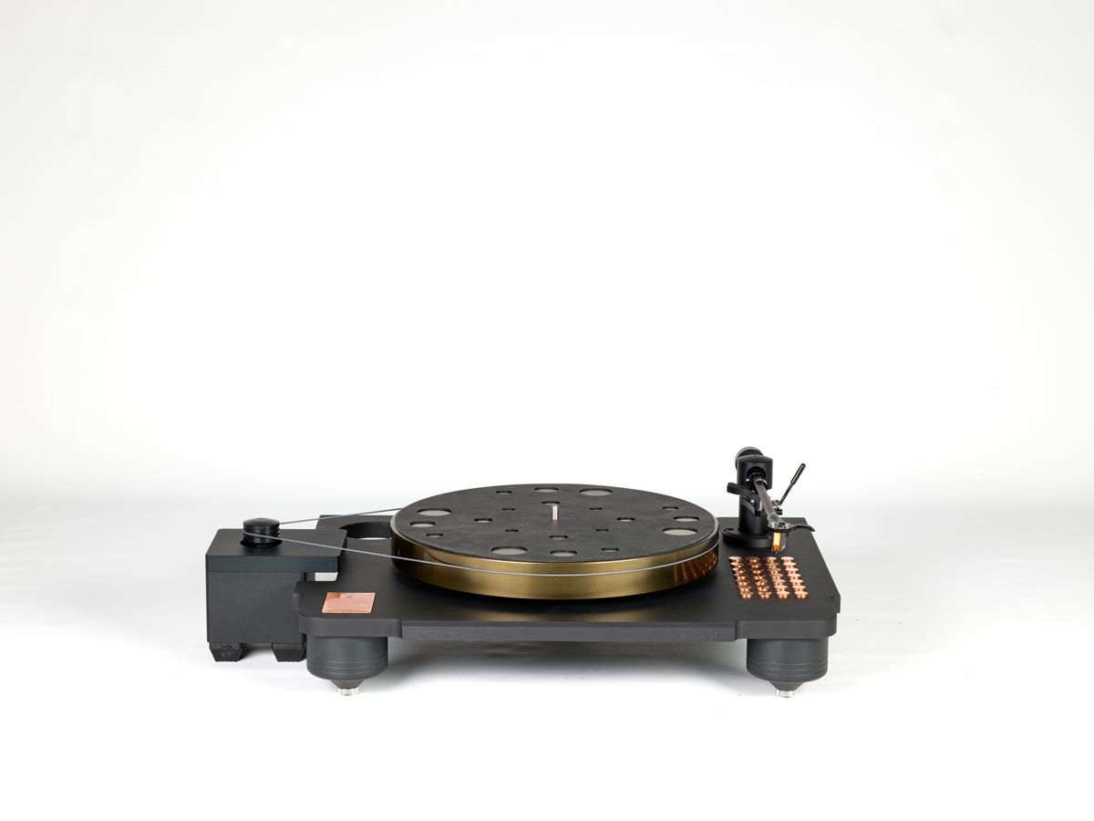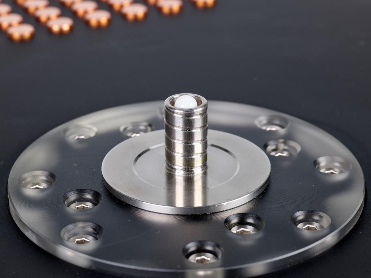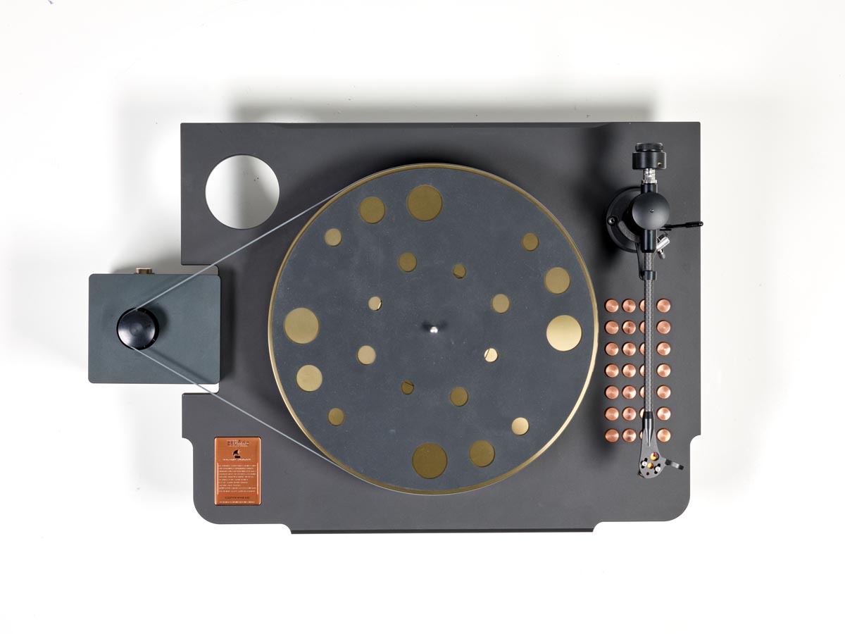 Beim Motor wird dagegen eine Idee von Nottingham Analogue aufgegriffen. Er ist gerade nur so stark, dass er den 5,5 Kilogramm schweren Plattenteller aus Aluminium mit konstanter Geschwindigkeit drehen kann. Der Kontakt zur Schallplatte erfolgt über eine mit zwanzig kreisförmigen Ausschnitten versehene Gummimatte. Will man den in „Bronze antik“ eloxierten Teller auf Nenndrehzahl bringen, muss man ihn mit einem Finger kurz anschieben. Ein schwarzer Rundriemen aus Silikon verbindet Teller und Motor. Die Geschwindigkeitsumschaltung – 33 und 45 Umdrehungen pro Minute stehen zur Verfügung – geschieht über Tipptasten am Gehäuse der Motorsteuerung, die seltsamerweise aber nicht über ein internes Netzteil die benötigte Niederspannung erzeugt. Sie wird über ein weiteres Versorgungsteil bereitgestellt, das dem eines Laptops sehr ähnlich sieht. Besondere Aufmerksamkeit gebührt dem Tellerlager und seiner Befestigung auf dem Chassis: Das invertierte Lager besteht aus einer Edelstahlachse, die auf einer Acrylplatte befestigt und über dämpfend wirkender Silikonringe mit dem Chassis verbunden ist; eine Bronzebuchse im Teller nimmt das Lager auf, während die Keramikkugel auf einem Teflonspiegel läuft.