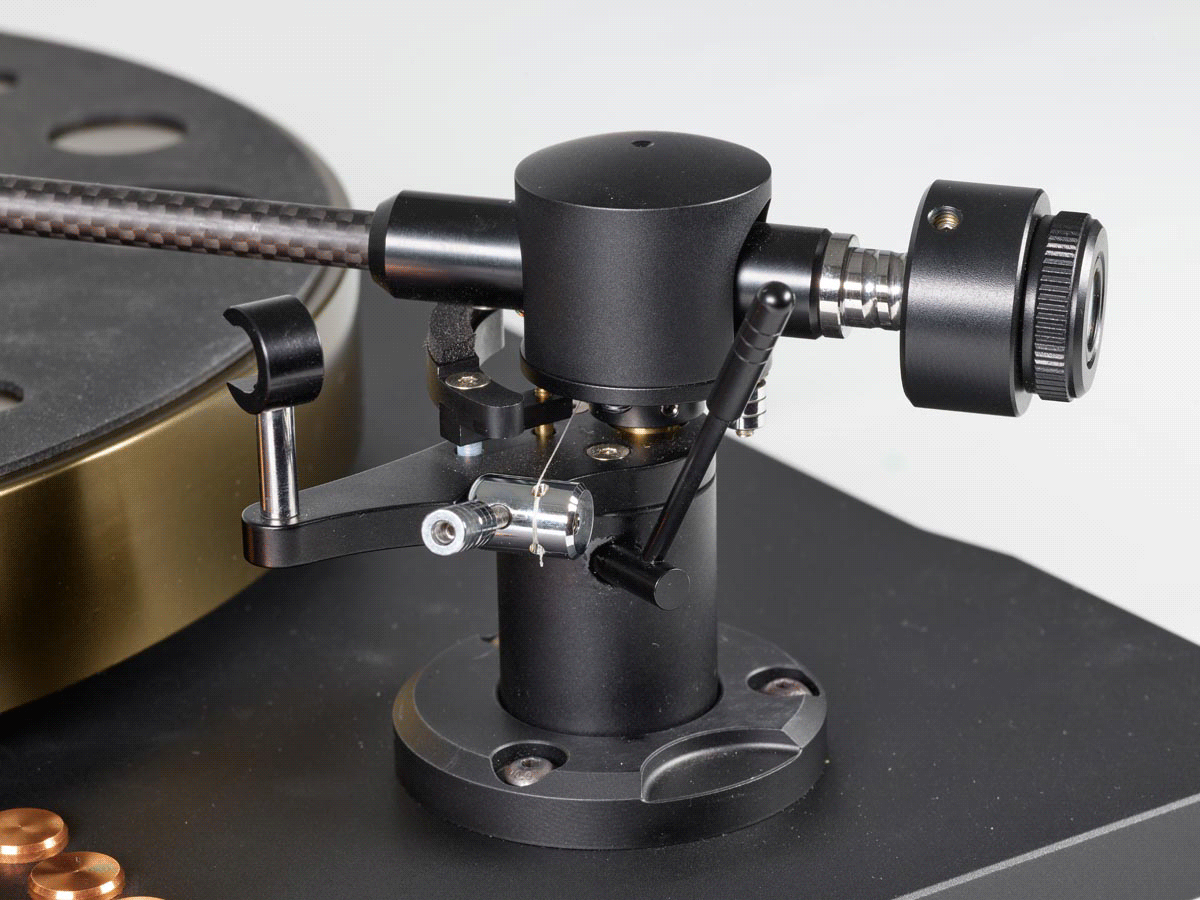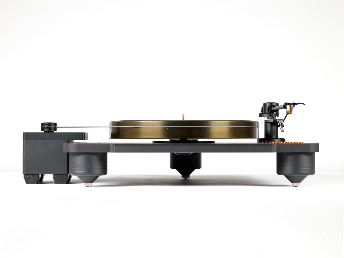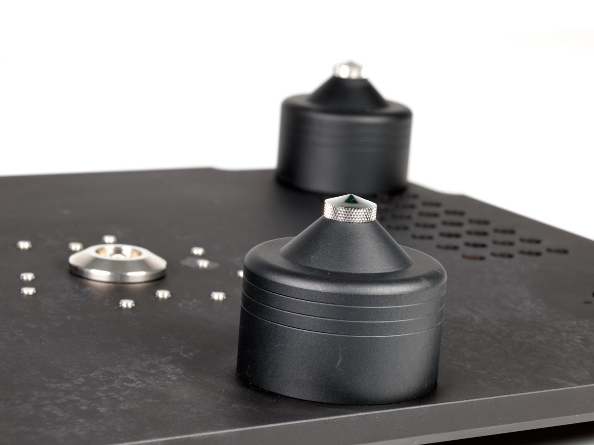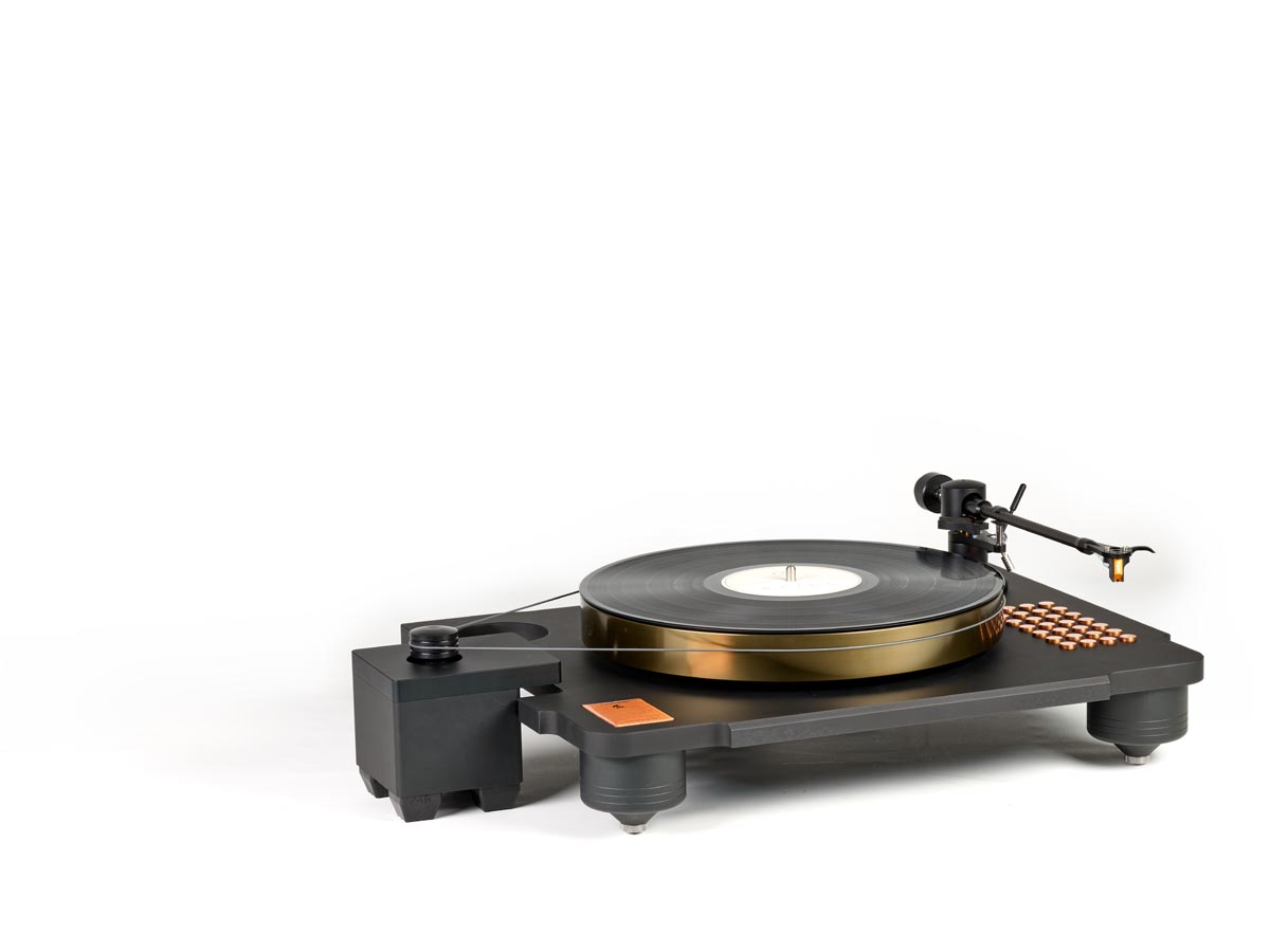 Beim Motor wird dagegen eine Idee von Nottingham Analogue aufgegriffen. Er ist gerade nur so stark, dass er den 5,5 Kilogramm schweren Plattenteller aus Aluminium mit konstanter Geschwindigkeit drehen kann. Der Kontakt zur Schallplatte erfolgt über eine mit zwanzig kreisförmigen Ausschnitten versehene Gummimatte. Will man den in „Bronze antik“ eloxierten Teller auf Nenndrehzahl bringen, muss man ihn mit einem Finger kurz anschieben. Ein schwarzer Rundriemen aus Silikon verbindet Teller und Motor. Die Geschwindigkeitsumschaltung – 33 und 45 Umdrehungen pro Minute stehen zur Verfügung – geschieht über Tipptasten am Gehäuse der Motorsteuerung, die seltsamerweise aber nicht über ein internes Netzteil die benötigte Niederspannung erzeugt. Sie wird über ein weiteres Versorgungsteil bereitgestellt, das dem eines Laptops sehr ähnlich sieht. Besondere Aufmerksamkeit gebührt dem Tellerlager und seiner Befestigung auf dem Chassis: Das invertierte Lager besteht aus einer Edelstahlachse, die auf einer Acrylplatte befestigt und über dämpfend wirkender Silikonringe mit dem Chassis verbunden ist; eine Bronzebuchse im Teller nimmt das Lager auf, während die Keramikkugel auf einem Teflonspiegel läuft.