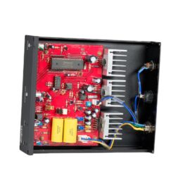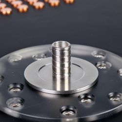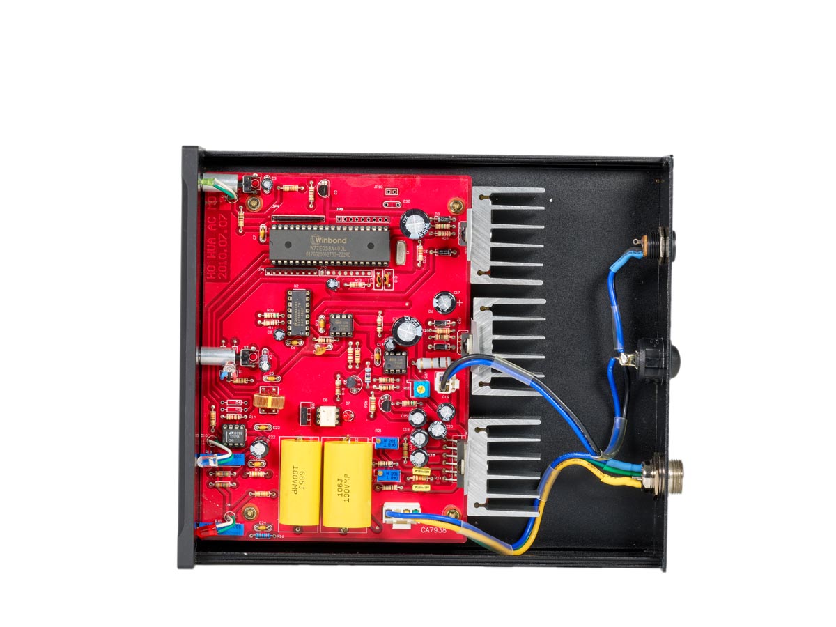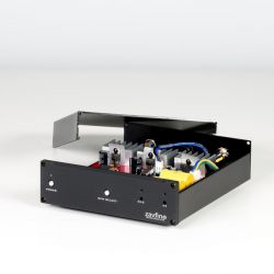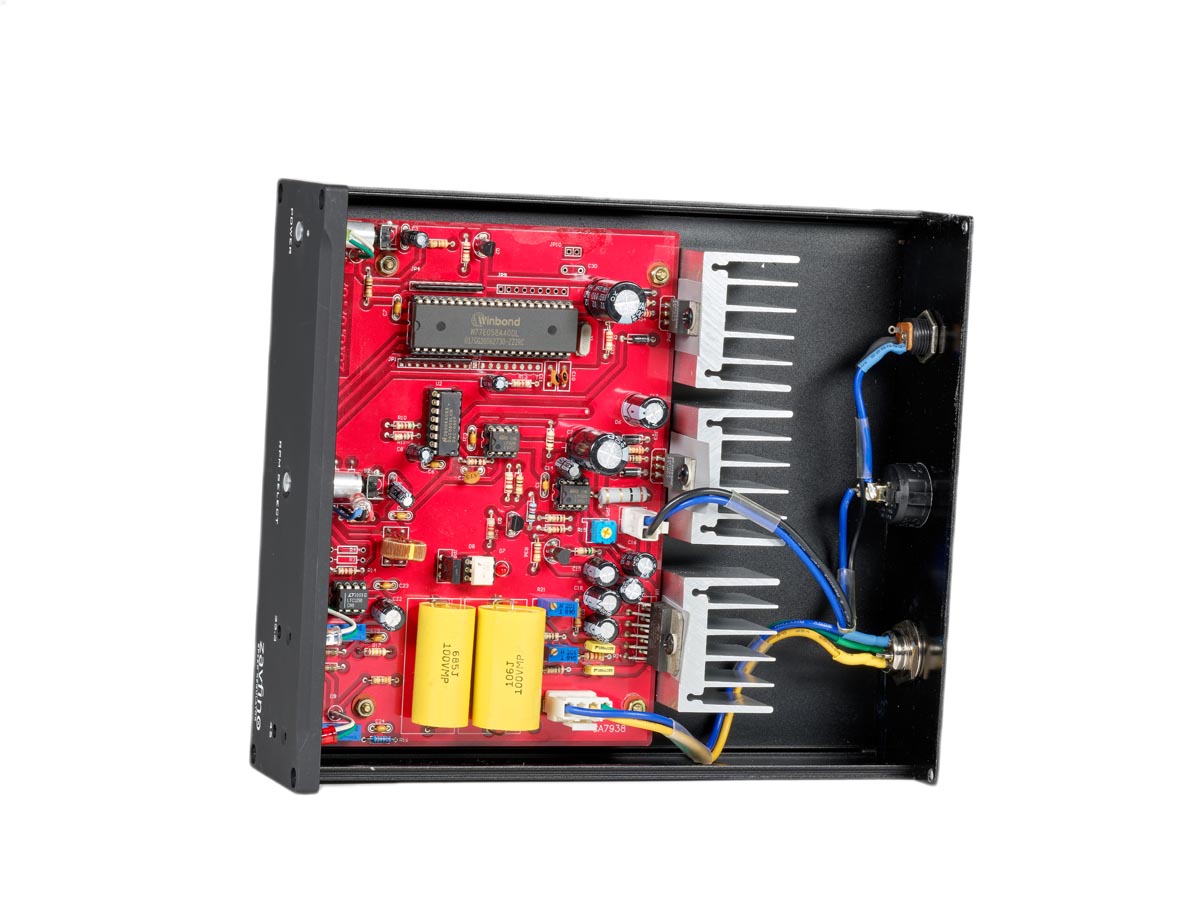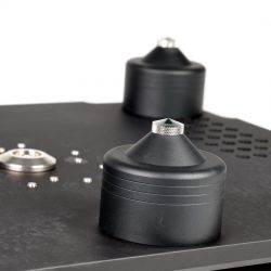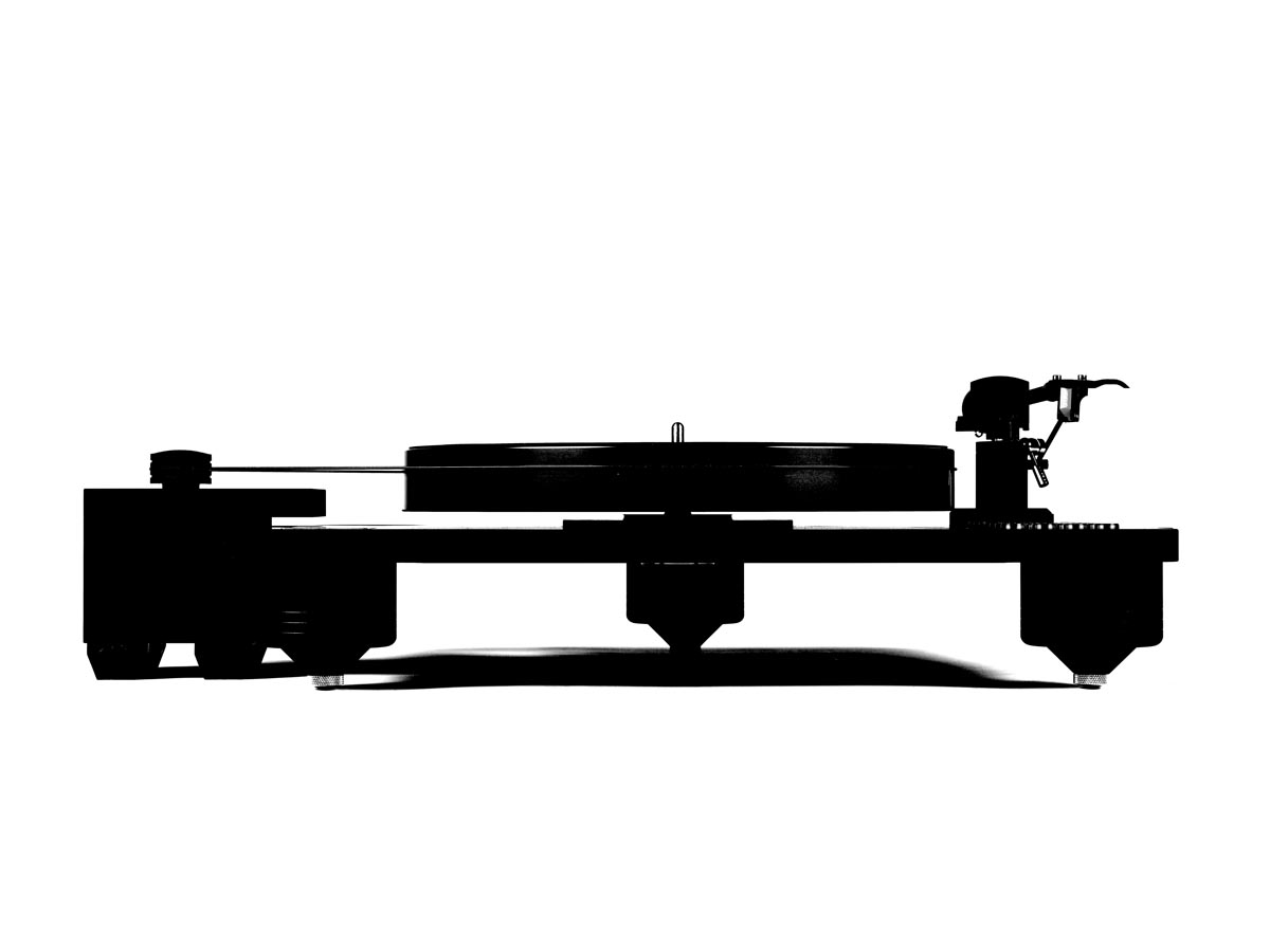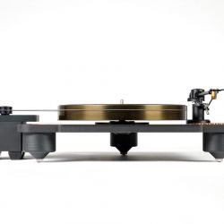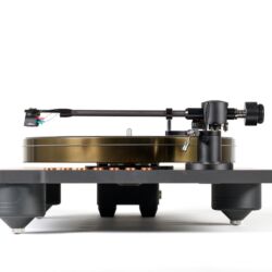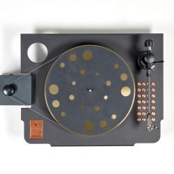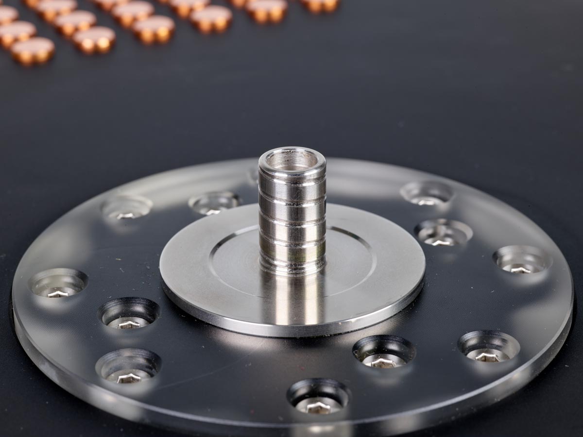 Beim Motor wird dagegen eine Idee von Nottingham Analogue aufgegriffen. Er ist gerade nur so stark, dass er den 5,5 Kilogramm schweren Plattenteller aus Aluminium mit konstanter Geschwindigkeit drehen kann. Der Kontakt zur Schallplatte erfolgt über eine mit zwanzig kreisförmigen Ausschnitten versehene Gummimatte. Will man den in „Bronze antik“ eloxierten Teller auf Nenndrehzahl bringen, muss man ihn mit einem Finger kurz anschieben. Ein schwarzer Rundriemen aus Silikon verbindet Teller und Motor. Die Geschwindigkeitsumschaltung – 33 und 45 Umdrehungen pro Minute stehen zur Verfügung – geschieht über Tipptasten am Gehäuse der Motorsteuerung, die seltsamerweise aber nicht über ein internes Netzteil die benötigte Niederspannung erzeugt. Sie wird über ein weiteres Versorgungsteil bereitgestellt, das dem eines Laptops sehr ähnlich sieht. Besondere Aufmerksamkeit gebührt dem Tellerlager und seiner Befestigung auf dem Chassis: Das invertierte Lager besteht aus einer Edelstahlachse, die auf einer Acrylplatte befestigt und über dämpfend wirkender Silikonringe mit dem Chassis verbunden ist; eine Bronzebuchse im Teller nimmt das Lager auf, während die Keramikkugel auf einem Teflonspiegel läuft.