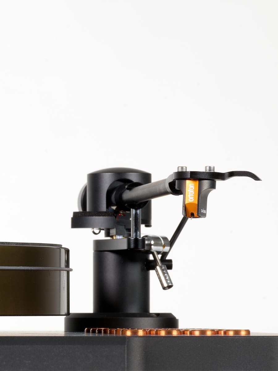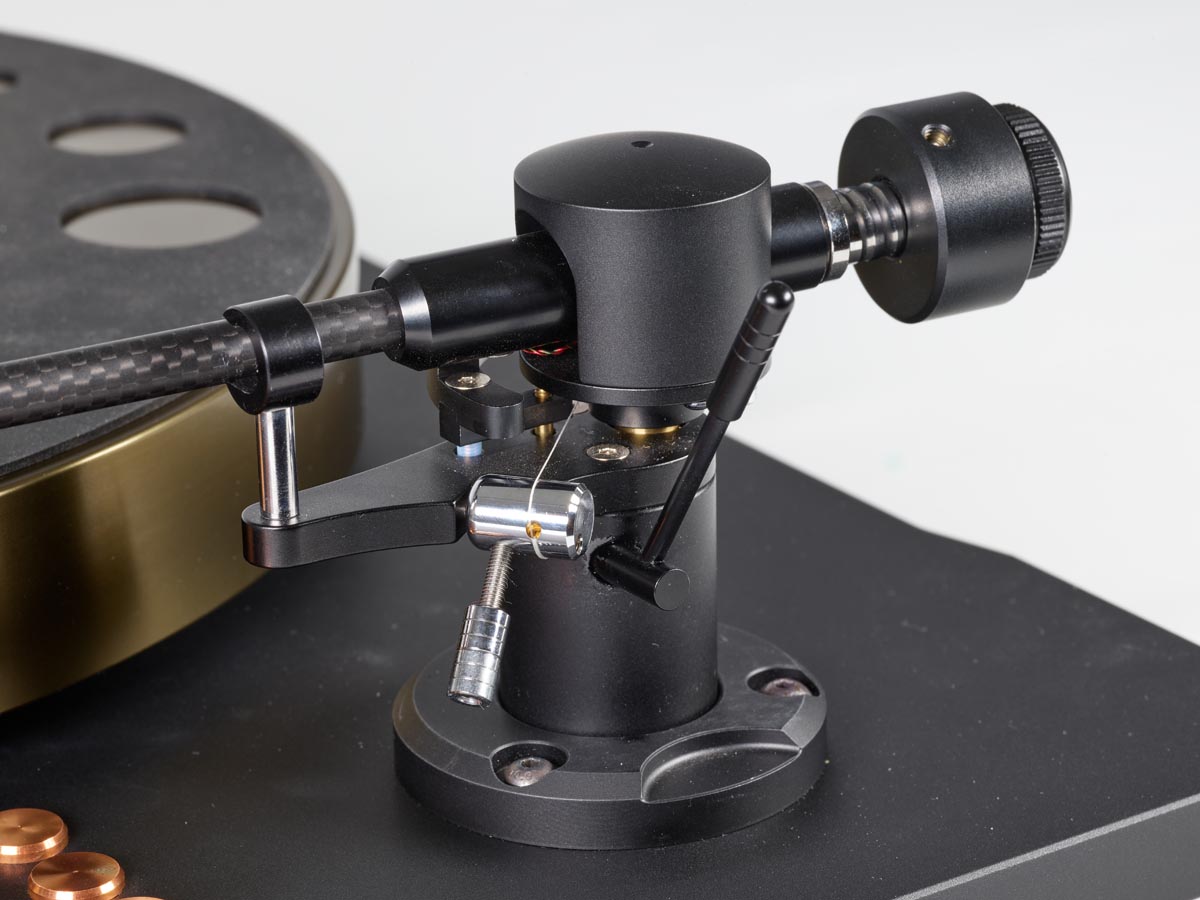 Der Copperhead X wird serienmäßig mit dem Tonarm Aeshna Carbon ausgeliefert. Auf den ersten Blick wirkt dieser eher unspektakulär; er hat es aber im wahrsten Sinne des Wortes in sich. Im Inneren des Carbonrohrs steckt ein weiteres Rohr aus Aluminium. Die Verwendung unterschiedlicher Materialien ist ein bekannter Trick, um die Resonanzen eines Tonarmrohrs zu minimieren. Unter der zylinderförmigen Lagerglocke befindet sich nicht – wie man zuerst meinen könnte – ein Einpunktlager. Hier hat man sich bei 1877 Phono etwas wirklich Besonderes einfallen lassen. Für die vertikalen Auslenkungen wird ein Messerschneidelager verwendet, während für die horizontalen Bewegungen konventionelle, ebenso leichtgängige wie spielfreie Kugellager ihren Dienst verrichten. Messerschneidelager stehen mitunter in dem Ruf, etwas heikel zu sein, da sie nur dann optimal funktionieren, wenn die beiden Schneiden gleichmäßig belastet werden. Das ist in der Variante, wie sie im Aeshna umgesetzt wird, kein Thema. Die Schneiden beziehungsweise ihre Widerlager sind magnetisch, ziehen sich deshalb gegenseitig an und ermöglichen so eine elegante Konstruktion ohne die bei Tonarmen mit Messerschneidelagern notwendige einstellbare Lateralbalance.