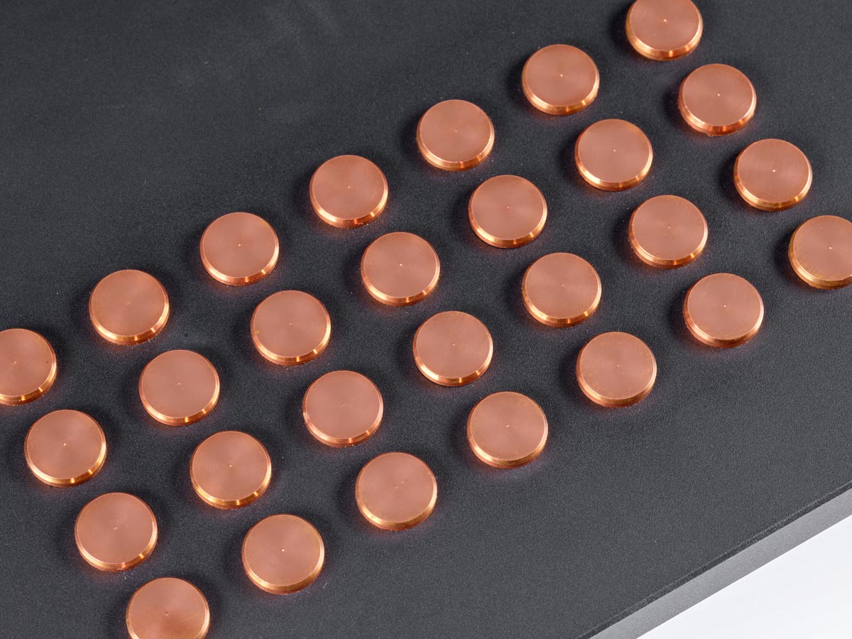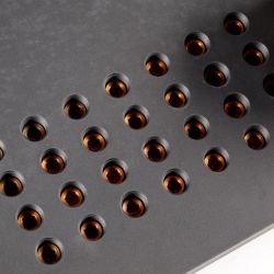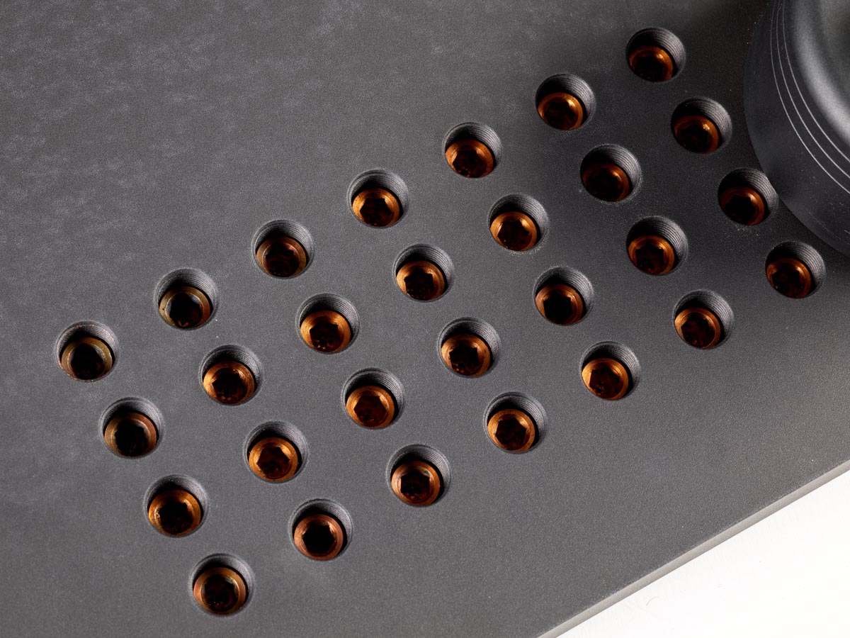 Bezüglich der Plattenspielerherstellung ist 1877 Phono also ein „Newcomer“, der aber nicht für sich in Anspruch nimmt, das sprichwörtliche Rad neu erfunden zu haben. Es hat beim Copperhead X eher den Anschein, als ob sich die Kanadier die Mitbewerber ganz genau angesehen und die ihrer Ansicht nach besten Ideen übernommen haben. So zeigt die Konstruktion des Copperheads Ähnlichkeiten mit Laufwerken von VPI. Das kann man an der rechteckigen Form des Laufwerks samt der separat davon auf der linken Seite stehenden Motoreinheit festmachen. Die Basis besteht im Gegensatz zu denen von VPI aus einer schwarz eloxierten, circa 1,6 Zentimeter starken Aluminiumplatte, deren vordere Ecken abgerundet sind. Augenfälligstes Merkmal sind aber die 28 unterhalb des Tonarms eingelassenen Kupferzylinder, die der Resonanzverminderung dienen sollen. Eine ebenfalls aus Kupfer gefertigte Plakette ziert die linke Seite; hier sind Hersteller und Modellname eingraviert. Hinten links befindet sich ein kreisförmiger Ausschnitt, der die Montage eines weiteren, 10,5 Zoll langen Tonarms ermöglicht. Die Aluminiumbasis steht auf drei höhenverstellbaren Spikes. Der Kunde muss daher ein gewisses Augenmerk auf die Stellfläche legen, auf der der Copperhead X zu stehen kommen soll. Sie darf durchaus größer ausfallen, denn das Motorgehäuse verbreitert die minimale Breite der Stellfläche auf 52 Zentimeter.