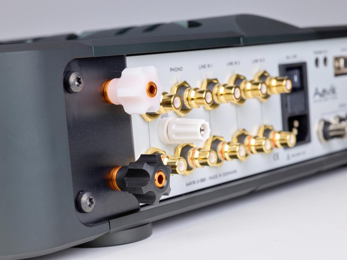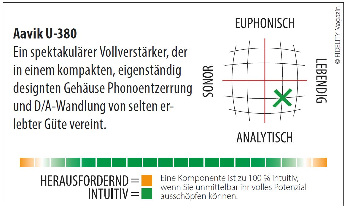 Die Phonostufe des ansonsten unsymmetrischen U-380 ist volldiskret symmetrisch erdfrei aufgebaut. Die Verstärkung obliegt bipolaren Transistoren in besonders rauscharmer (Aavik gibt enorme 94 dB Störgeräuschabstand an) BISS-Bauform. Børresen bevorzugt diesen Typ gegenüber Feldeffekt-Transistoren, denen er ein gedecktes Klangbild attestiert. Die Impedanz-Anpassung des U-380 bietet inklusive der Eckwerte 50 und 10 000 Ohm beeindruckende 18 Stufen. Dank des geschmeidigen Bedienkonzepts ist die Umschaltung im sprichwörtlichen Handumdrehen erledigt.