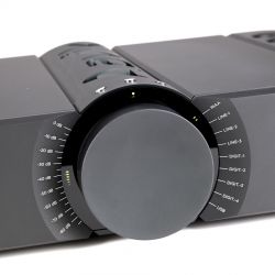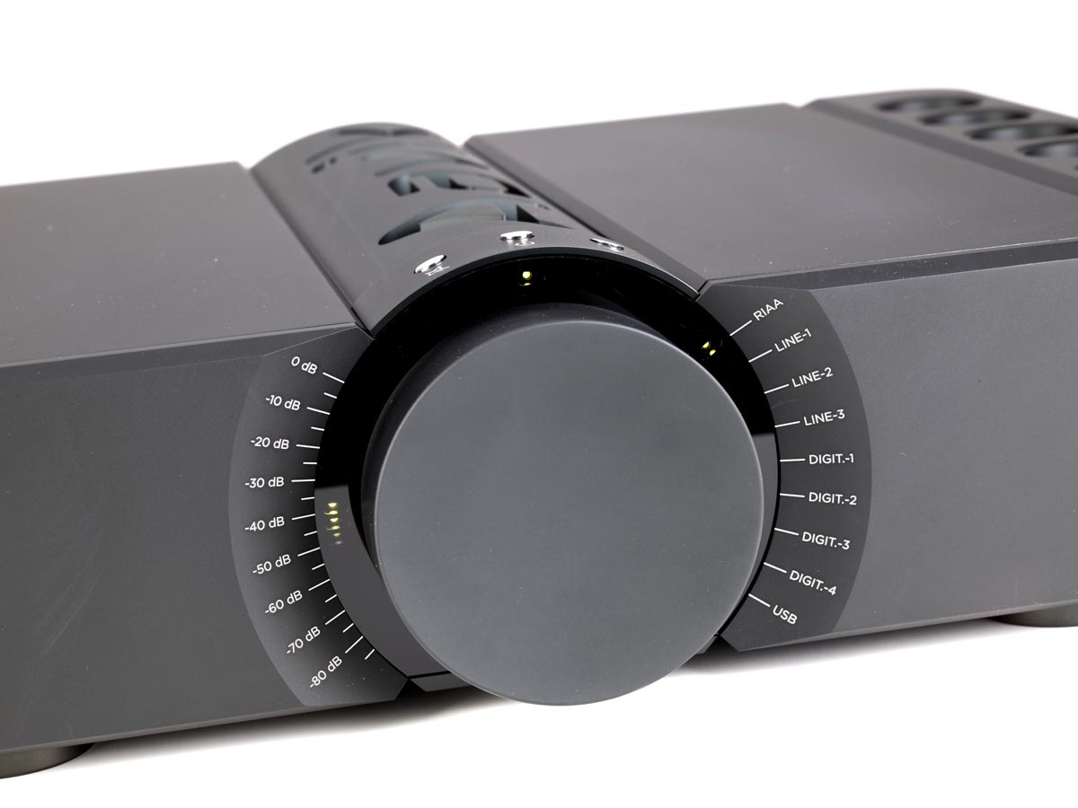 Frisch ausgepackt präsentiert sich der U-380 als knapp 17 Kilo schwere Audioskulptur. Auf dem obersten Brett meines Racks, wo er allein schon wegen des stolz über die ganze Gehäusetiefe präsentierten, CNC-gefrästen Markennamens hingehört, wirkt er, als entstamme er wahlweise dem Batcave oder Darth Vaders privatem Hörraum. Trotz zahlreicher Eingänge, einer potenten DAC-Sektion und einer anpassbaren Phonostufe sind auf den ersten Blick keinerlei Displays zu erkennen, die über den jeweiligen Betriebszustand informieren. Einzige Bedienelemente sind drei Druckknöpfe und ein großer Drehknopf – um nicht zu sagen: eine Drehscheibe, prominent mittig in der Front platziert. Sie wird eingefasst von einem Ring aus weißen LEDs – und da haben wir es, das Display. Der Drehgeber ist das Eingabegerät, über kurzen oder langen Druck auf die Knöpfe lässt sich zwischen Pegelregelung, Balance, Quellenwahl, Gain und Phono-Eingangsimpedanz umschalten. Das funktioniert gut, und man fühlt sich dabei ein wenig wie in einer Luxuslimousine – Stichwort i-Drive bzw. Command-Controller.