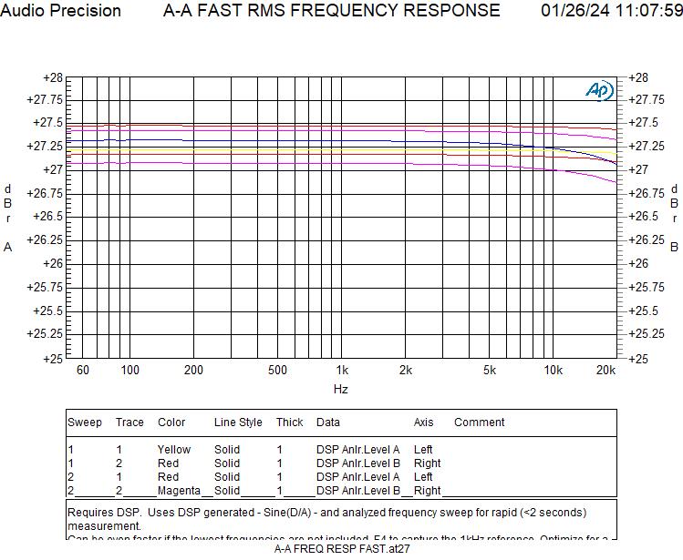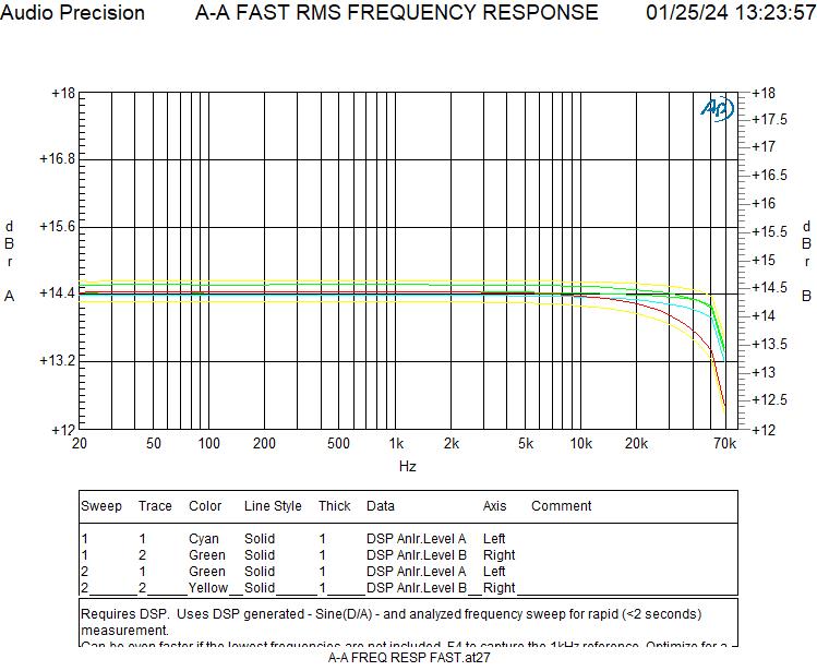 Hier einmal der Frequenzgang an einem rein ohmschen Messwiderstand 4 Ohm (blau) und an einem realen Lautsprecher (Celestion SL-6, 2-Wege) (grün). Die Veränderungen sind ausgesprochen gering, was den niedrigen Ausgangswiderstand von 0,01 Ohm bestätigt.