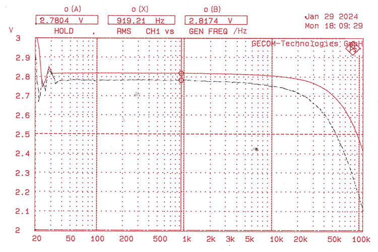 Hier der Frequenzgang bis 110 kHz mit 8 Ohm bzw. 2 Ohm Last bei 2,83 V Ausgangsspannung.