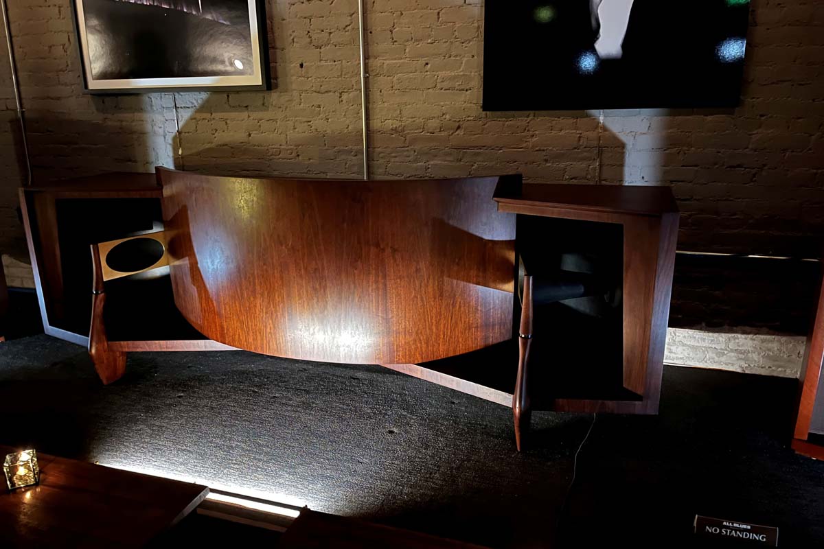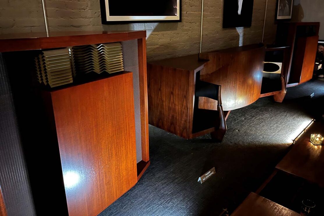 …und traue meinen Augen nicht, als ich an der Stirnwand eine seltene JBL Paragon sehe. Das hatte ich bis dato nur auf Bildern gesehen. Die Paragon, die 1957 auf den Markt kam und eines der markantesten Objekte des Audiodesigns überhaupt ist, wird von einem Paar imposanter JBL Hartsfield-Lautsprecher flankiert, die mit ihren goldfarbenen horizontalen „akustischen Linsen“-Lamellen für ihre Kompressions-Hochtöner unverkennbar sind. Bei der Elektronik handelt es sich um alte McIntosh- und Marantz-Röhrengeräte, darunter eine Mac MC275-Endstufe und ein legendärer Marantz 7C-Vorverstärker. In der DJ-Kabine sehe ich zwei alte EMT-Plattenspieler.