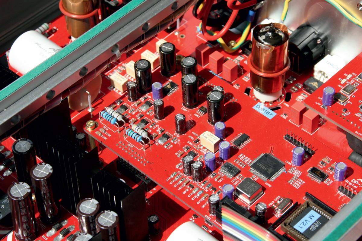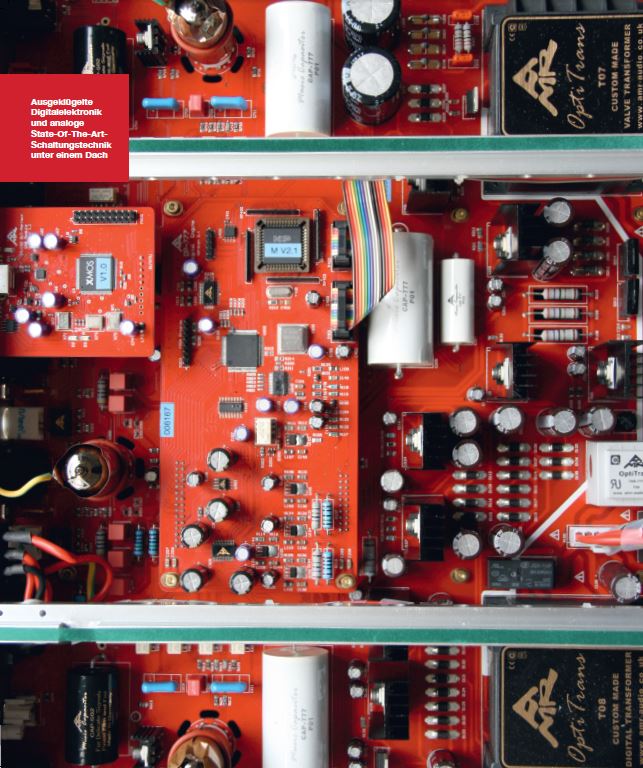 Der DP-777 begegnet diesem Problem auf überraschend unkonventionelle Weise. Er verwendet im HD-Digitaleingang – sozusagen als Video-Eingangsstufe – eine russische 6N11J-Hochfrequenz-Doppeltriode in extrem breitbandiger Schaltung, die auf Über-Alles-Gegenkopplung vollständig verzichtet. Das bewirkt eine perfekte, weil rückwirkungsfreie Entkopplung von digitaler Quelle und signalauswertender Elektronik im DP-777; entsprechend sauber und steilflankig präsentieren sich die SPDIF-Impulsketten. Spätestens seit Wadia-Zeiten weiß man um die klanglich fundamentale Bedeutung von Digitalfiltern, weshalb die meisten hochwertigen DACs denn auch hauseigene klangoptimierte Filter mitbringen. Beim DP-777 sind es gleich sechs: vier für den Betrieb mit dem 32-bit-Hi- Res-Wandler, zwei für den 16-bit- Classic-DAC. Natürlich bieten die umschaltbaren Filter viel Raum für Klangexperimente. Sie sind jedoch vornehmlich für spezielle Aufgabenstellungen vorgesehen oder ermöglichen den Direktvergleich unterschiedlicher Filter-Philosophien. Für die bei Digitalfiltern notwendige, nicht unerhebliche Rechenarbeit verwendet AMR ein Field Programmable Gate Array (FPGA), das unzählige nahezu beliebig verknüpfbare Logikbausteine enthält, beispielsweise als digitaler Signalprozessor (DSP) wie im DP-777. Um die volle Signalqualität des Digitalteils auch im Preamp-Betrieb zu erhalten, setzt AMR beim Lautstärkesteller des DP-777 ebenfalls auf eine eigenständige Lösung. Kleine Bauteilpakete mit Präzisionswiderständen, an Ort und Stelle geschaltet über besonders niederohmige Feldeffekttransistoren, erlauben nicht nur die Fernbedienung und perfekte Kanalgleichheit, sondern auch den verzerrungsfreien Signaltransfer bei geringen Lautstärken. Nach dem Pegelsteller beginnt dann die halbleiterfeie Zone: Hier geraten die Bauelemente so üppig, dass man den Signalweg ebenso genüsslich wie problemlos auf den Fotos verfolgen kann. Im Abschirmbecher verpackt, thront hier pro Kanal jeweils eine russische Doppeltriode vom Typ 6N1 PEV, wobei das eine System verstärkt, das andere als niederohmiger Kathodenfolger-Ausgangstreiber arbeitet. Angesichts dieser Konfiguration stellt sich die berechtigte Frage, wie wohl der symmetrische XLRAusgang angesteuert wird. Hier setzt AMR-Mastermind Thorsten Lösch auf einen bei vielen Profi-Mischpulten angewendeten Trick: Der invertierende Anschluss (Pin 3) ist über einen Festwiderstand mit dem der Ausgangsimpedanz identischen Wert nach Masse geschaltet. Obwohl es sich hierbei nicht um ein echtes, symmetrisches Ausgangssignal handelt, bleibt bei symmetrischen Eingängen die Gleichtakt- und damit die Störunterdrückung im Wesentlichen erhalten.