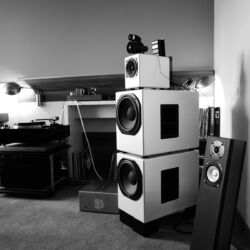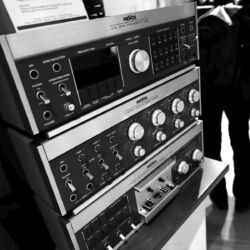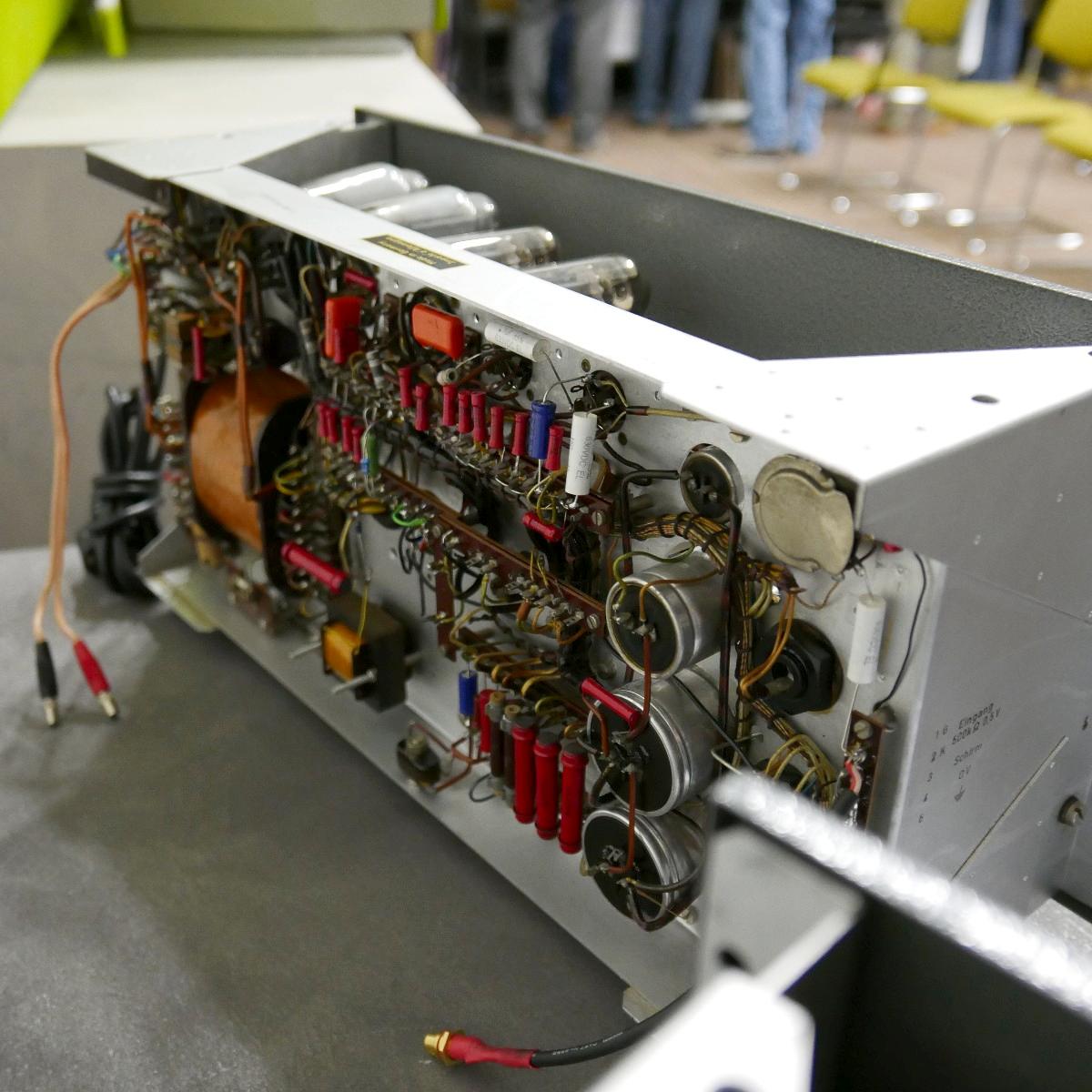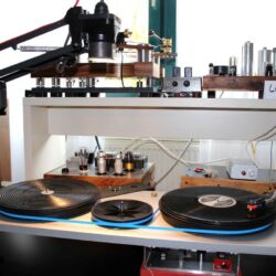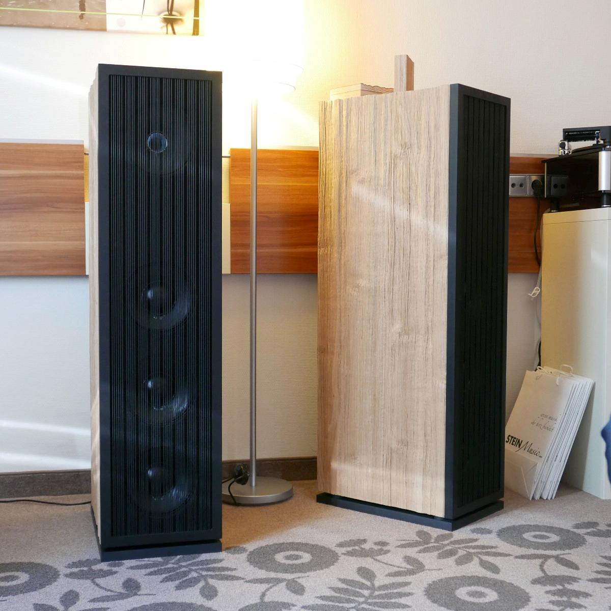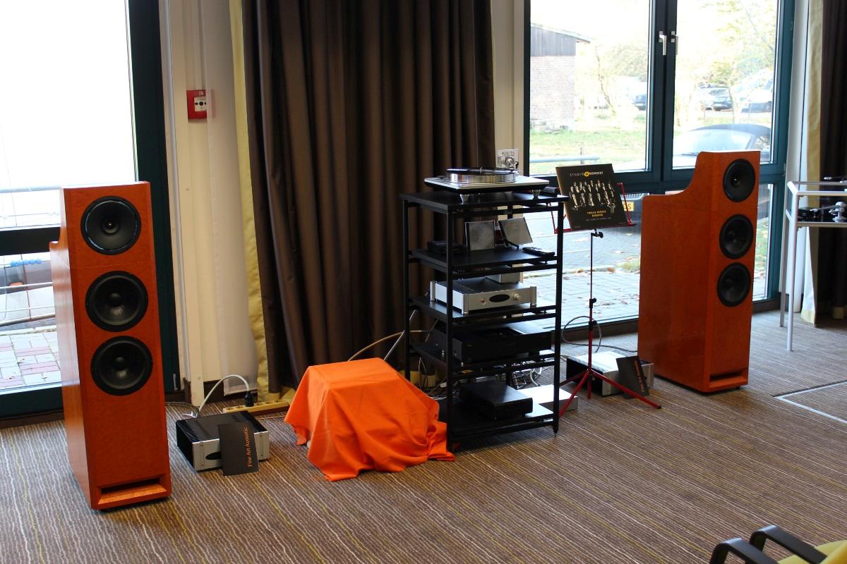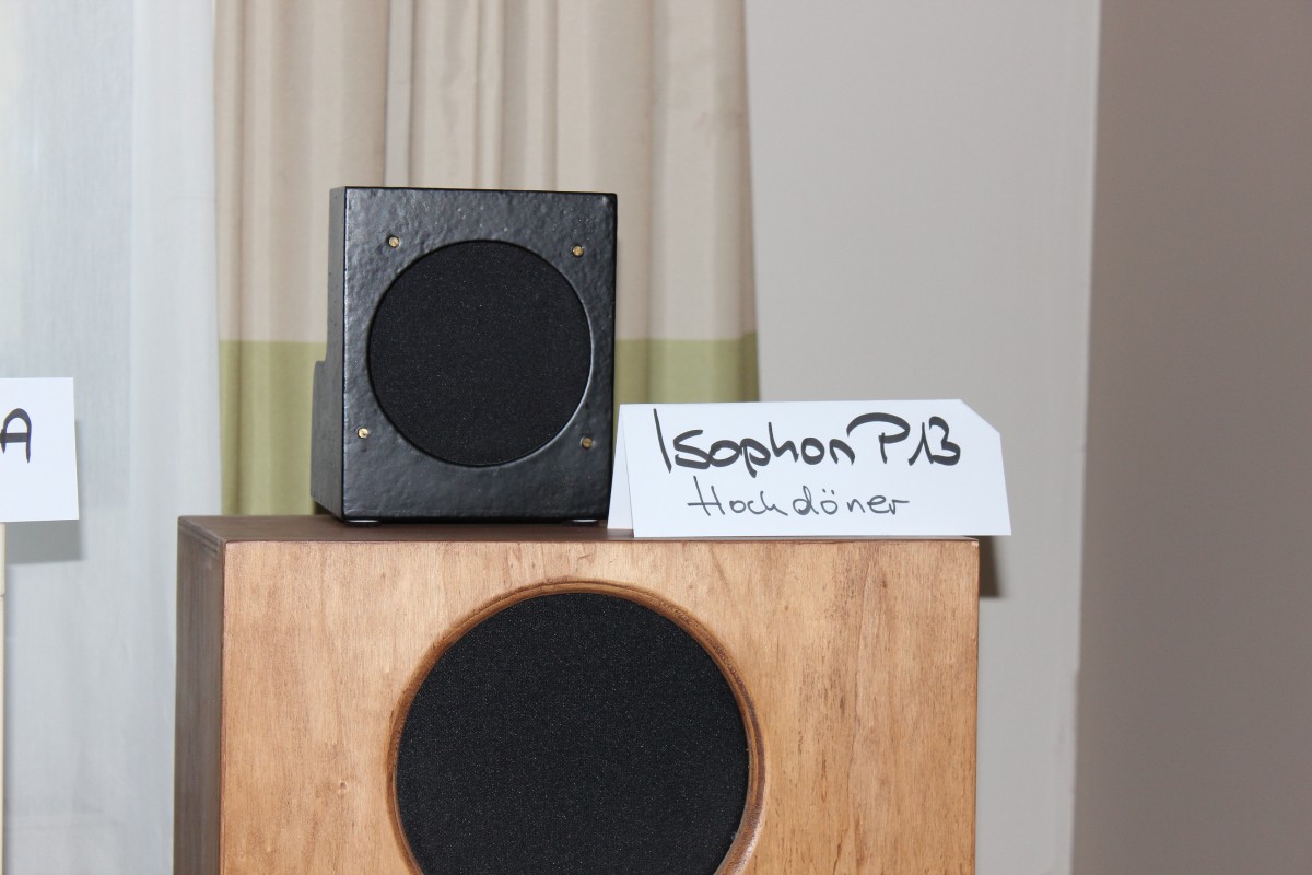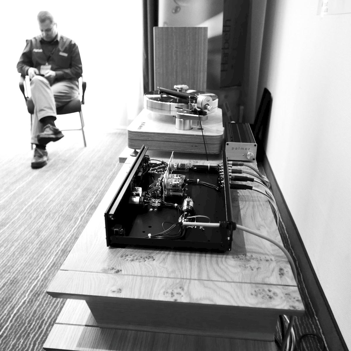 Sonntags klangen erwartungsgemäß viele Installationen noch besser, weil sie warm- und eingespielt waren, trotzdem hatten einige professionelle Besucher sichtlich Mühe, dem Geschehen unmittelbar zu folgen. Herauszuheben ist bezüglich des Klangs Martina Schöner, die mit eigenen modularen Lautsprechern und Elektronik von Joachim Gerhard angereist war. Und natürlich mit ihrer wundervollen Garrard-Weiterentwicklung 501. Ebenso wie Thomas Fast, dessen mit Klangschälchen vollgepfropfte Vorführungen der kleinen Kiso-Lautsprecher immer ausgesprochen dynamisch vorwärts marschieren, und Croft in Verbindung mit Harbeth bei Input-Audio, wo auch sehr tiefe Impulse noch druckvoll wiedergegeben wurden. Ähnlich auf den Punkt tönte es auch bei SWS-Audio mit Feickert-Laufwerk und Geithain-Monitoren. Kompromisslos und brutal gingen die Euphonic Architects mit einem im Wortsinn betonierten Basshorn inklusive Monitoren in PA-Optik zu Werke. Dass es dort trotz gehobener Lautstärke und nicht gerade betontem Wohlfühlsound trotzdem einen Heidenspaß machte, dürfte nicht zuletzt an der hervorragenden Quellenlage gelegen haben: Nebeneinander standen dort ein EMT-Laufwerk, ein sehr rarer Ulysses und eine Studer-Bandmaschine und sorgten für starke Begehrlichkeiten bei den zahlreichen Vintage-Jüngern.