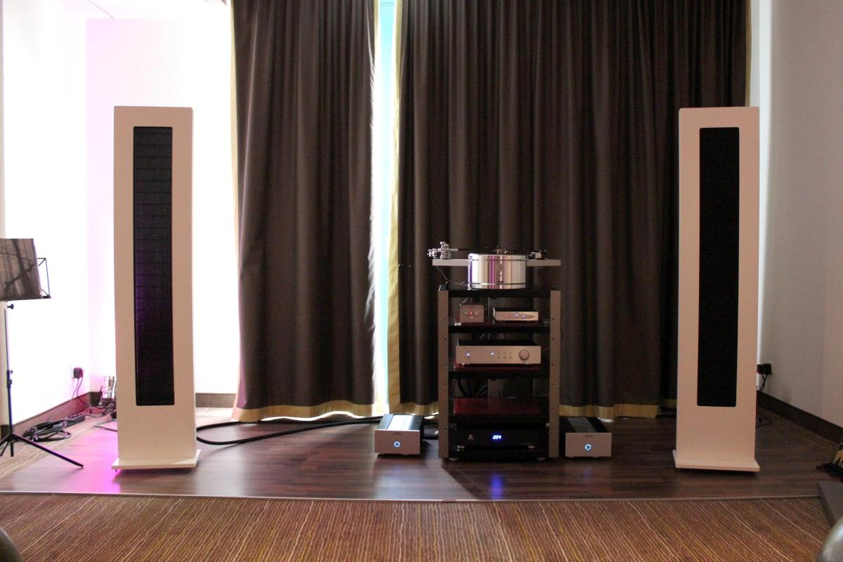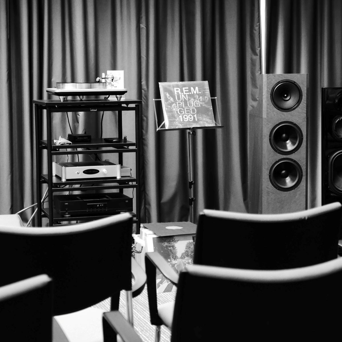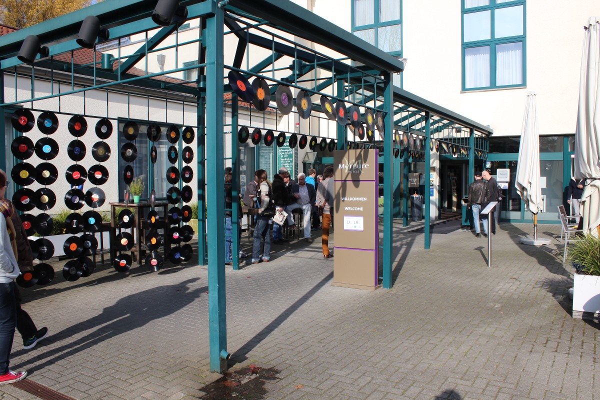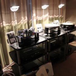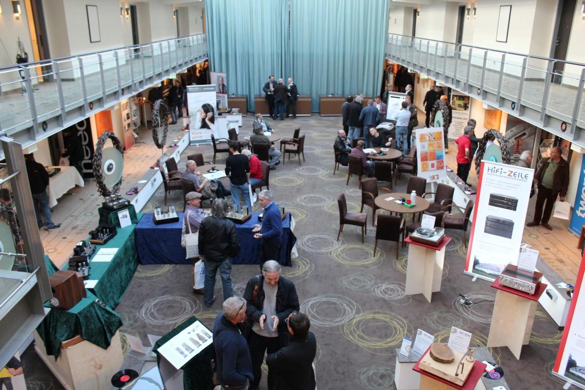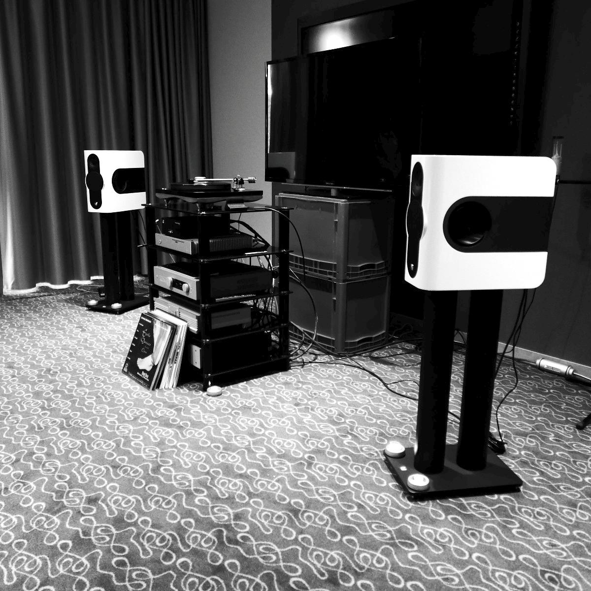 Gar nicht vorgeführt wurde im Raum von Live Act, ToneTool und Steinmusic. Unglücklicherweise ging Dieter Molitor beim Aufbau ein Chassis flöten, wofür auf die Schnelle keine Ersatz aufzutreiben war. Aber manchmal wohnt so einem Unglück auch etwas Positives inne: Am Samstag entwickelte sich das Hotelzimmer zu einen Diskussionsforum und Kompetenzzentrum mit universeller Ausrichtung: DEinformer-Reiniger, Raumtuning, Plattenspielerantriebe, Lautsprecherkonstruktion und –entwicklung, Schuhe, Literaturkritik – egal welches Thema, hier fand man mindestens einen sachkundigen Ansprechpartner bzw. Kombattanten. Außerdem gab es dort Espresso schneller als an der Hotelbar, deren Besuch bisweilen dem Gefangensein in einer sehr trockenen Zeitschleife glich. Am Ende konnte man es aber doch auch positiv als Lernprozess betrachten: An der Mercure-Bar ist es nicht wie sonst ausreichend, einfach stumm dazusitzen und durstig dreinzuschauen, man muss schon auf sich aufmerksam machen (Winkelemente und Rufzeichen reichen). Andererseits hatte das Barpersonal aber auch alle Hände voll zu tun und bisweilen absurd weite Wege für eine Tasse Kaffee zurückzulegen. Schon nahte der Samstagabend inklusive Nacht, über die wir aus Rücksicht auf den unversehrten Ruf aller Involvierten, den dunklen Mantel des Schweigens breiten wollen.