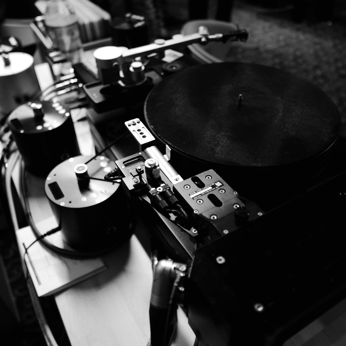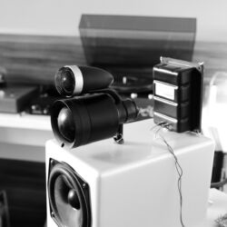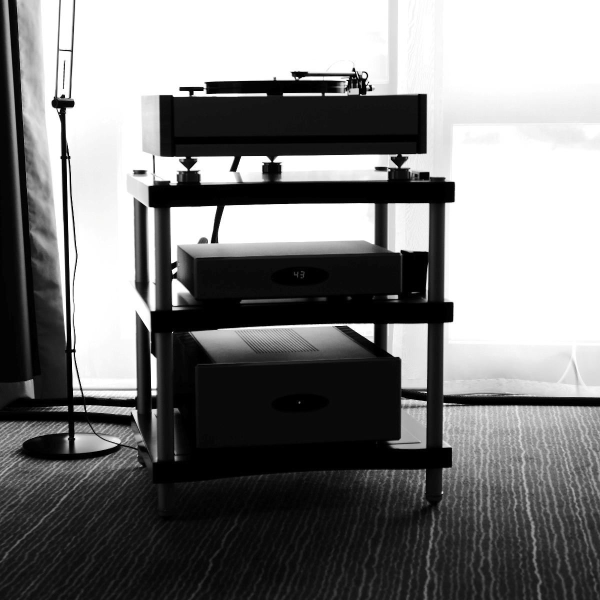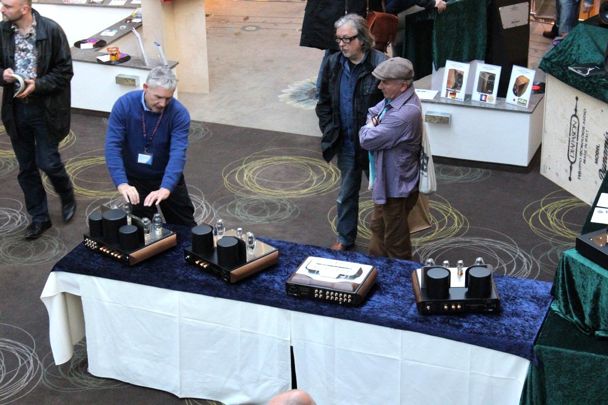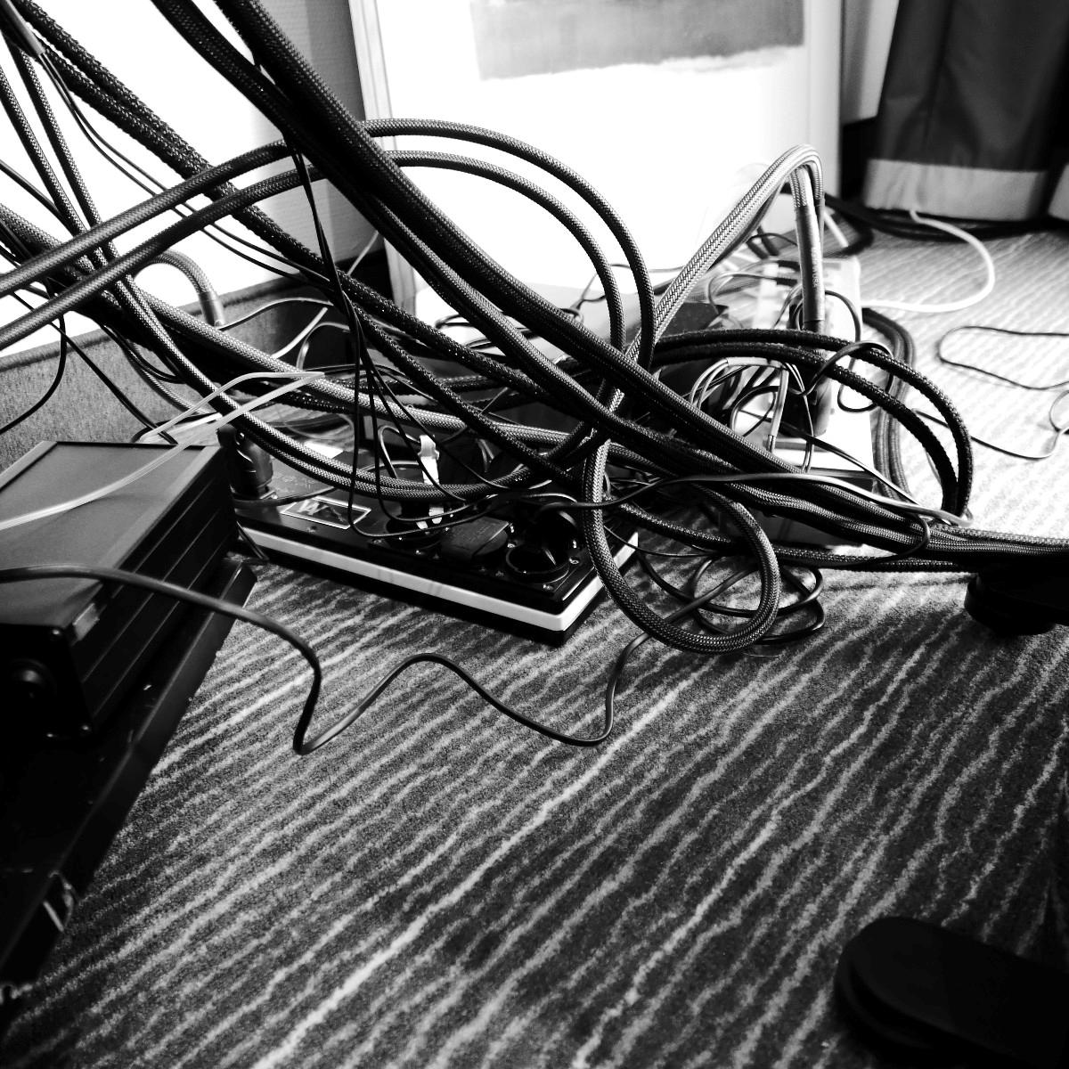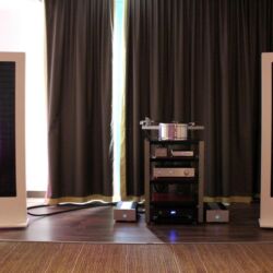 Gar nicht vorgeführt wurde im Raum von Live Act, ToneTool und Steinmusic. Unglücklicherweise ging Dieter Molitor beim Aufbau ein Chassis flöten, wofür auf die Schnelle keine Ersatz aufzutreiben war. Aber manchmal wohnt so einem Unglück auch etwas Positives inne: Am Samstag entwickelte sich das Hotelzimmer zu einen Diskussionsforum und Kompetenzzentrum mit universeller Ausrichtung: DEinformer-Reiniger, Raumtuning, Plattenspielerantriebe, Lautsprecherkonstruktion und –entwicklung, Schuhe, Literaturkritik – egal welches Thema, hier fand man mindestens einen sachkundigen Ansprechpartner bzw. Kombattanten. Außerdem gab es dort Espresso schneller als an der Hotelbar, deren Besuch bisweilen dem Gefangensein in einer sehr trockenen Zeitschleife glich. Am Ende konnte man es aber doch auch positiv als Lernprozess betrachten: An der Mercure-Bar ist es nicht wie sonst ausreichend, einfach stumm dazusitzen und durstig dreinzuschauen, man muss schon auf sich aufmerksam machen (Winkelemente und Rufzeichen reichen). Andererseits hatte das Barpersonal aber auch alle Hände voll zu tun und bisweilen absurd weite Wege für eine Tasse Kaffee zurückzulegen. Schon nahte der Samstagabend inklusive Nacht, über die wir aus Rücksicht auf den unversehrten Ruf aller Involvierten, den dunklen Mantel des Schweigens breiten wollen.