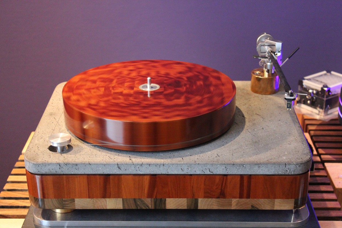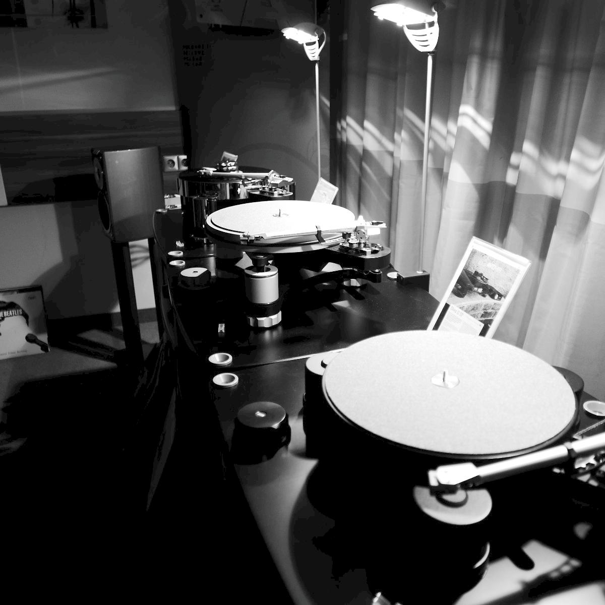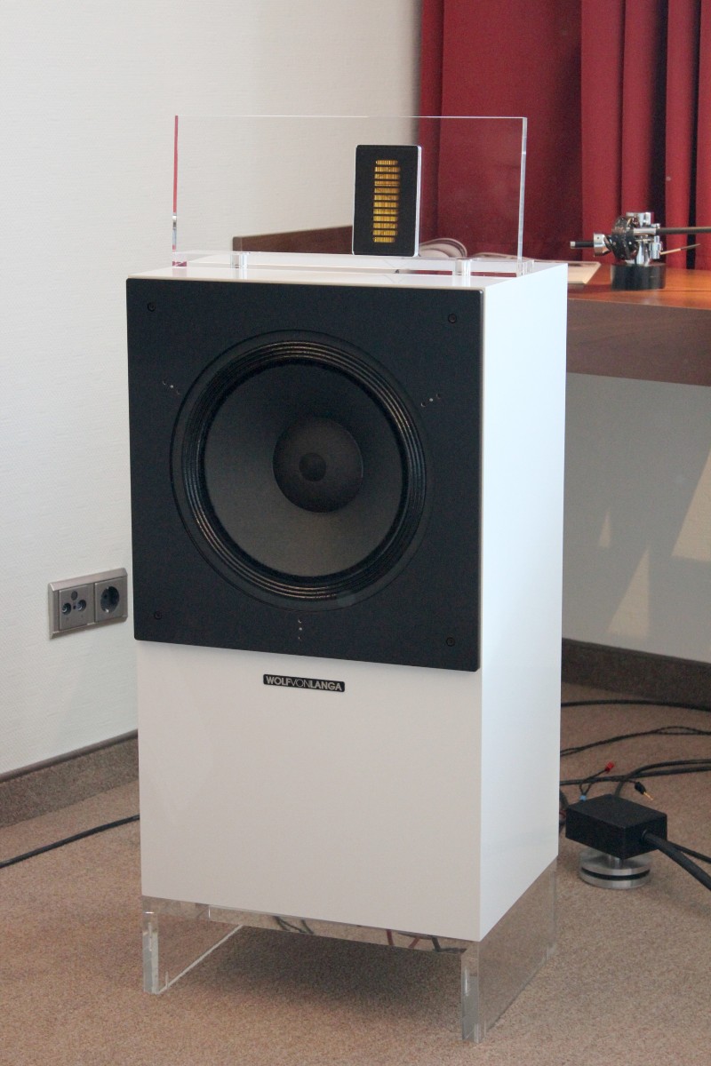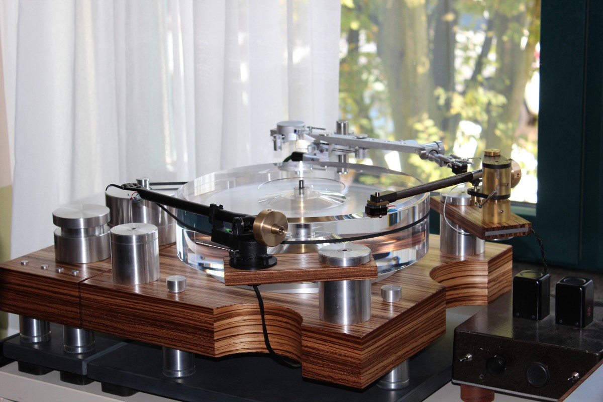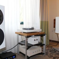 Linearer, aber beileibe nicht langweiliger klang es bei WOD-Audio, wo erstmals ein Bergmann-Laufwerk vorgestellt wurde, auf dem sich bis zur vier Arme montieren lassen. Wir Analog-Nerds mögen so etwas selbstverständlich, aber dem zurückhaltenden Design des Sleipner tut das unter Umständen nicht gut. Sehr schön, sowohl gestalterisch wie klanglich, war auch ein PTP-Laufwerk, basierend auf einem Lenco-Boliden, das an Manger-Wandlern sehr klar und transparent aufspielte. Etwas ganz Besonders hatte Genuin-Audio im Gepäck: Ein von Grund auf neu entwickeltes und sehr raumgreifendes Subchassis-Laufwerk namens Drive inklusive Einpunkt-Karbontonarm und getuntem 103-System Sting. Der von Helmut Thiele entworfene Dreher verfügt über einen eingebauten Entzerrer und geplant ist sogar eine integrierte Vorstufe, damit könne man eine ganz kurze Kette aus Plattenspieler und Aktivlautsprechern realisieren, schwärmt Vertriebseigner Thomas Wendt. An Perreaux-Elektronik und mit den ebenfalls brandneuen Pulse-Lautsprechern konnte man bei Genuin ein betont knackiges und sauberes Klangbild genießen. Etwas wolkiger und ätherischer, aber nichtsdestoweniger reizvoll ging es gegenüber bei Sperling und Silberstatic/Audreal zur Sache, daneben im Raum von Aura-HiFi aber dafür umso handfester mit Hörnern von Avantgarde Acoustic – durchaus eindrucksvoll, aber nichts für Zartbesaitete. Gewohnt feingeistig und perfekt ausgewogen klang es erneut und trotz des eigentlich zu kleinen Raumes bei Acapella – mühevolle Resonanzkontrolle aller beteiligten Gerätschaften zahlt sich eben doch aus. Eine ebenso über alle Zweifel erhabene Vorführung konnte auch Wolf von Langa auf die Beine stellen.