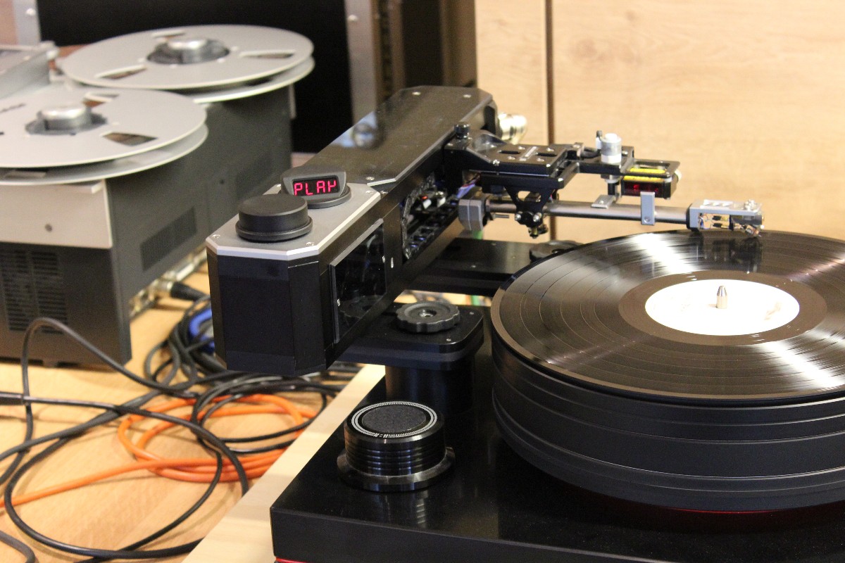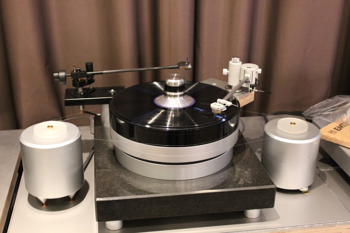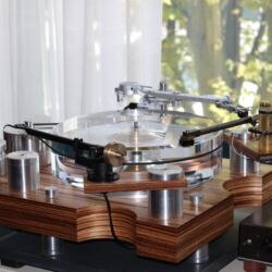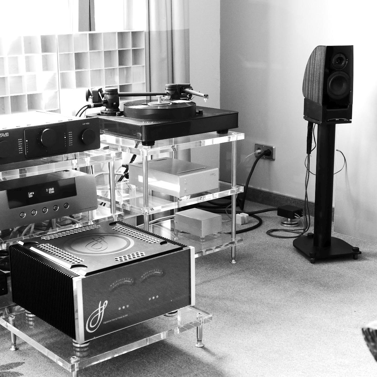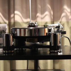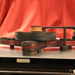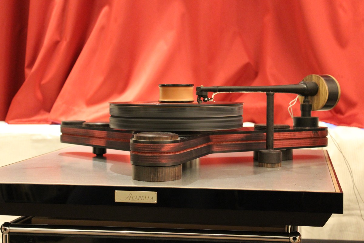 Linearer, aber beileibe nicht langweiliger klang es bei WOD-Audio, wo erstmals ein Bergmann-Laufwerk vorgestellt wurde, auf dem sich bis zur vier Arme montieren lassen. Wir Analog-Nerds mögen so etwas selbstverständlich, aber dem zurückhaltenden Design des Sleipner tut das unter Umständen nicht gut. Sehr schön, sowohl gestalterisch wie klanglich, war auch ein PTP-Laufwerk, basierend auf einem Lenco-Boliden, das an Manger-Wandlern sehr klar und transparent aufspielte. Etwas ganz Besonders hatte Genuin-Audio im Gepäck: Ein von Grund auf neu entwickeltes und sehr raumgreifendes Subchassis-Laufwerk namens Drive inklusive Einpunkt-Karbontonarm und getuntem 103-System Sting. Der von Helmut Thiele entworfene Dreher verfügt über einen eingebauten Entzerrer und geplant ist sogar eine integrierte Vorstufe, damit könne man eine ganz kurze Kette aus Plattenspieler und Aktivlautsprechern realisieren, schwärmt Vertriebseigner Thomas Wendt. An Perreaux-Elektronik und mit den ebenfalls brandneuen Pulse-Lautsprechern konnte man bei Genuin ein betont knackiges und sauberes Klangbild genießen. Etwas wolkiger und ätherischer, aber nichtsdestoweniger reizvoll ging es gegenüber bei Sperling und Silberstatic/Audreal zur Sache, daneben im Raum von Aura-HiFi aber dafür umso handfester mit Hörnern von Avantgarde Acoustic – durchaus eindrucksvoll, aber nichts für Zartbesaitete. Gewohnt feingeistig und perfekt ausgewogen klang es erneut und trotz des eigentlich zu kleinen Raumes bei Acapella – mühevolle Resonanzkontrolle aller beteiligten Gerätschaften zahlt sich eben doch aus. Eine ebenso über alle Zweifel erhabene Vorführung konnte auch Wolf von Langa auf die Beine stellen.