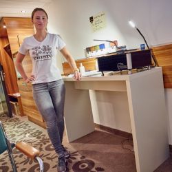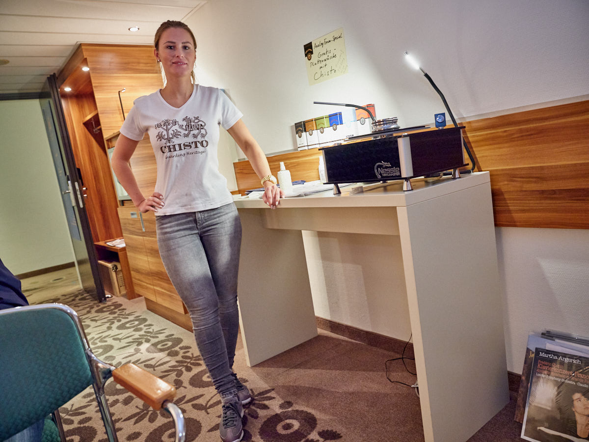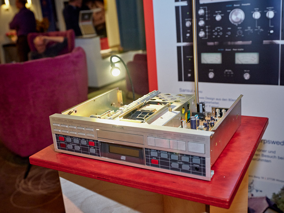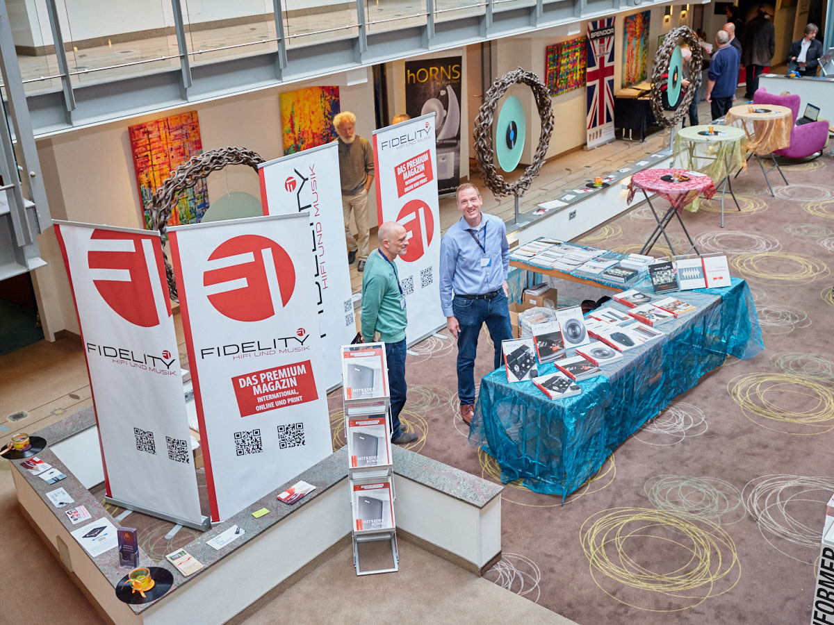 In der Eingangshalle des Mercure-Hotels bot sich am späten Freitagnachmittag das übliche Bild geschäftiger Aussteller zwischen Rollwägen mit Schallplatten und Equipment, der FIDELITY-Stand war schon so gut wie fertig. Schnell bestückten wir (Thorsten Schilke, Ingo Schulz, meinereiner) ihn mit kostbaren FIDELITY-Exemplaren – historisch und aktuell – sowie mit ausgesuchten Buchobjekten aus unseren reichhaltigen Veröffentlichungen. Tagwerk erledigt, Zeit für den ersten Absacker des Wochenendes bei Ultraudio: süßer Wein aus Plastikbechern, Reed Muse 1C, gute Musik – alles wie gehabt. Lautsprecher mit DIY-Charme aus dem Klang-&-Ton-Kosmos, unbeschaltete Sica-Breitbänder in einer Hornkonstruktion, die, nun ja, interessant klangen, aber auch ein wenig widerspenstig, ich möchte sagen, mutig.