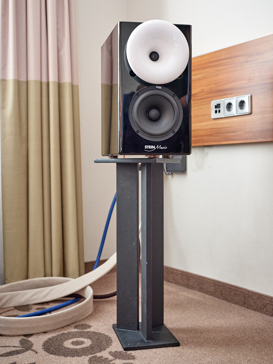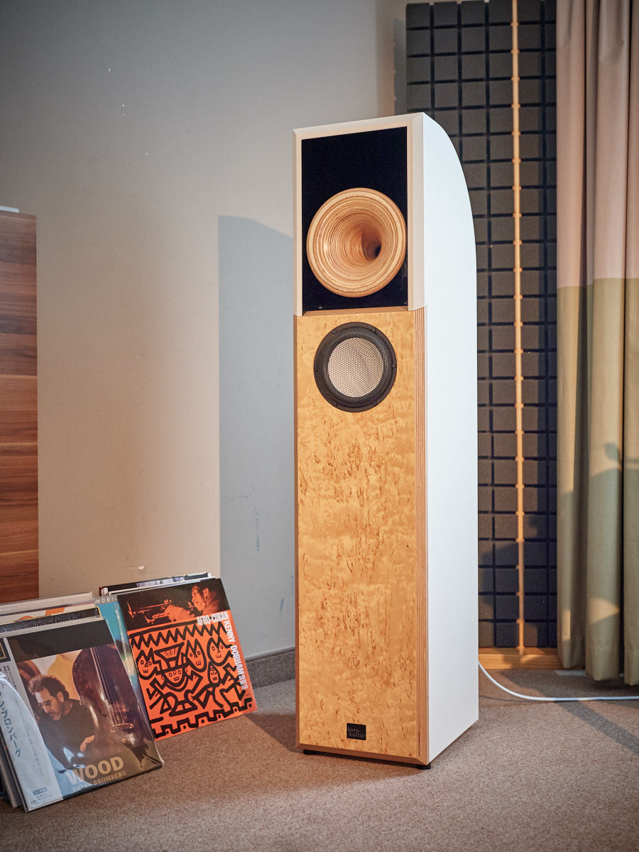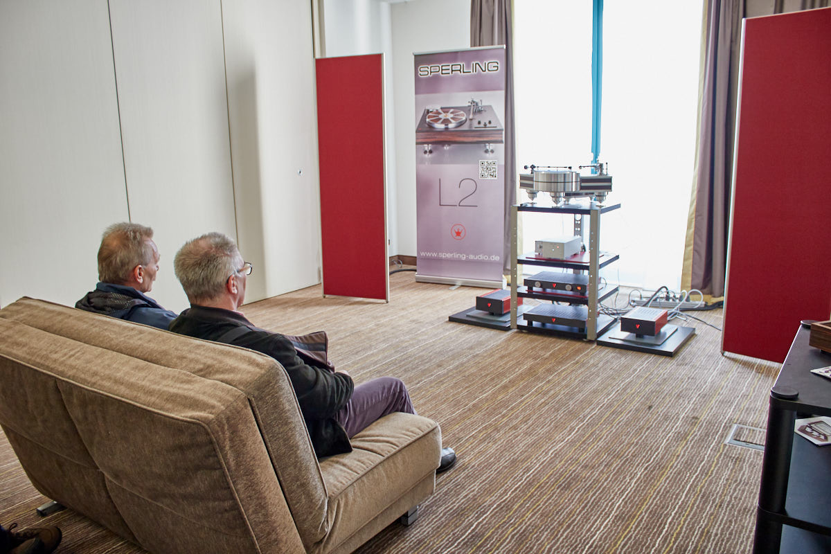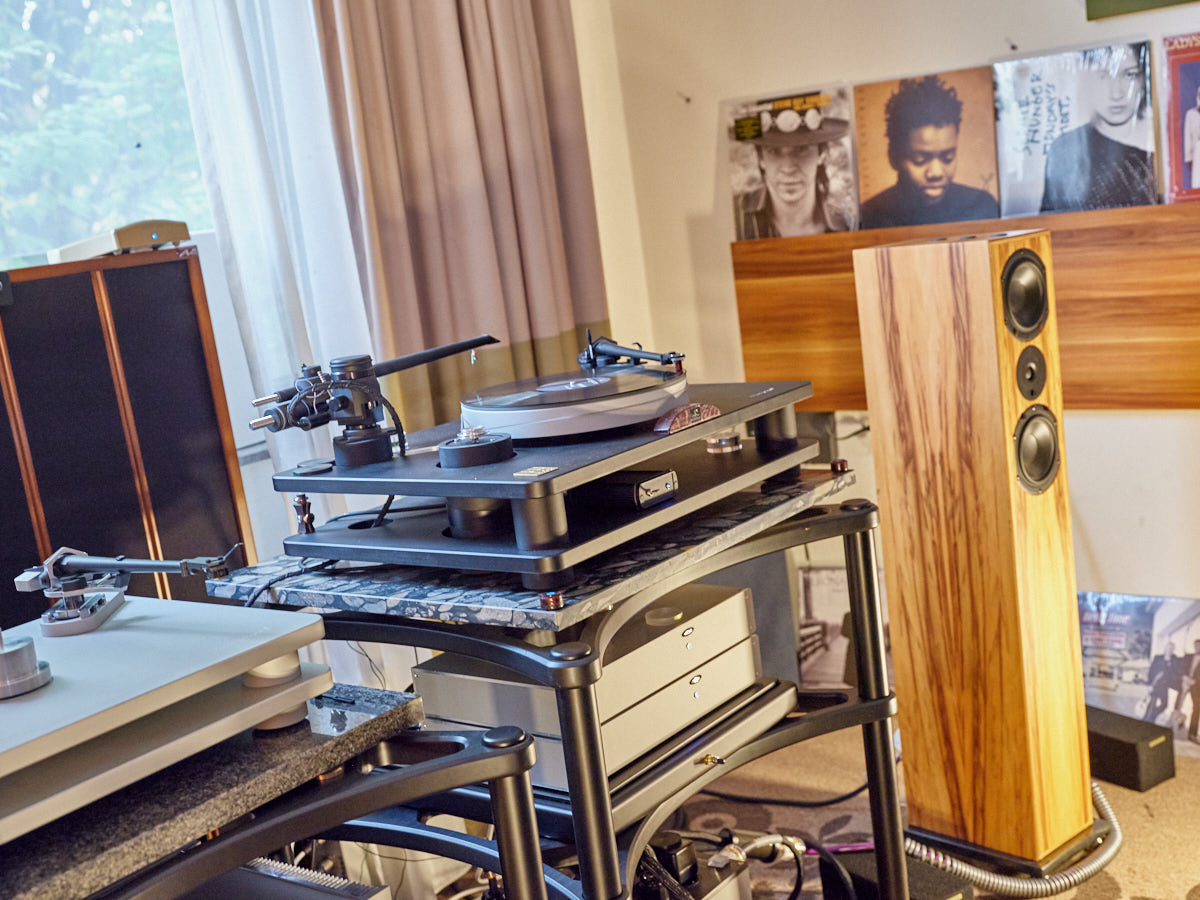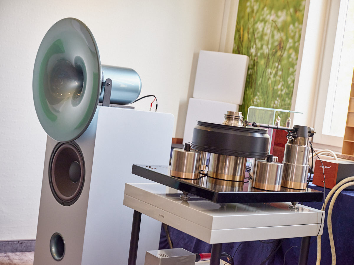 Lignolab machte mit dynamischem Bass und vierzelligem Hochtonhorn einen bodenständigen Eindruck, obwohl es sich um eine extrem waghalsige, digital entzerrte Konstruktion mit offenem Mini-Verstärker vor dem Horn handelt. Dass so etwas auf dem Analog Forum überhaupt erlaubt ist! Klang aber schön stämmig. Endlich war auch bei ToneTool die Tür auf, wo mir schon im Vorjahr ein Gratis-Kaffee versprochen wurde. Hatte ich aber zwischenzeitlich vergessen, Holger Wilhelm, der Erbauer der wundervollen ToneTool-Laufwerke, war so freundlich, mich daran zu erinnern. Dort gab es gleich zwei Premieren zu feiern: Zum einen war das erste Hana-ML-Abtastsystem Europas zu sehen und natürlich zu hören und ein an Fäden schwebend dreipunktgelagerter Einpunkttonarm (oder so) von Studo spielte weltweit an diesem Tag in diesem Raum zum ersten Mal – spektakulär! Zu diesem Zeitpunkt mit Lautsprechern von Lautsprung, die mir auch im letzten Jahr schon aufgefallen waren. Bei einem späteren Besuch fanden sich auf den Stativen kleine Zweiwege-Lautsprecher Bobby-S von Stein Music. Niedliche ventilierte Kisten mit getuntem Hochtonhorn und gewaltigem Klang, daran konnten auch die Audreal-Monos nichts ändern. Die selbstverständlich, man muss das immer dazu sagen, gemessen an ihrem Preis, Großes zu leisten imstande sind.