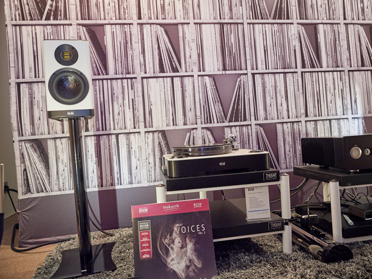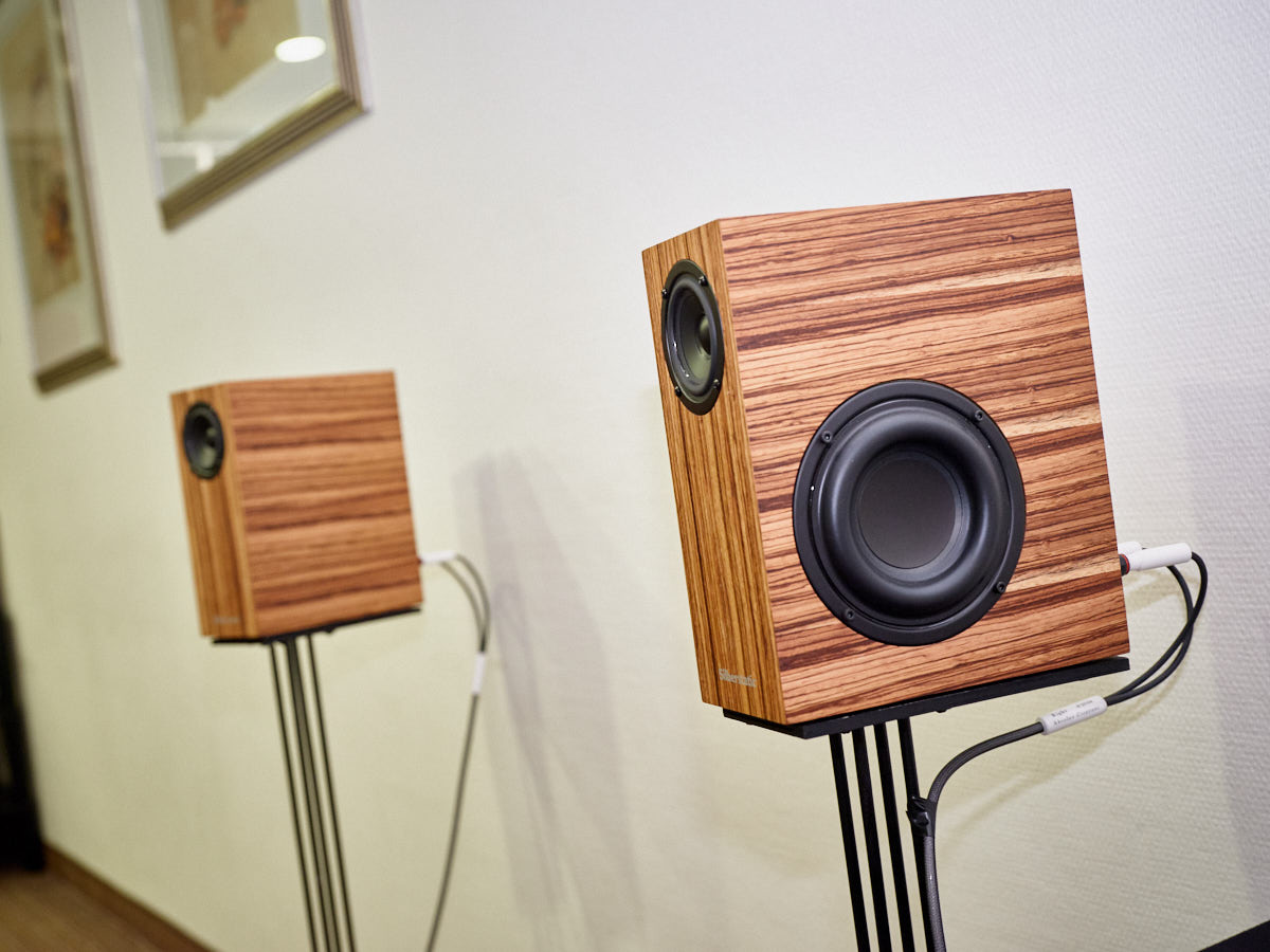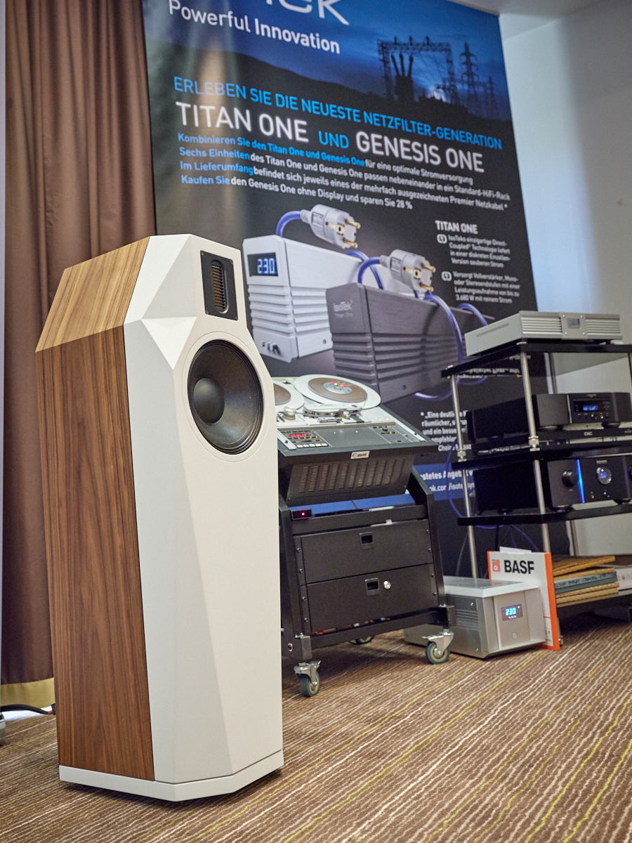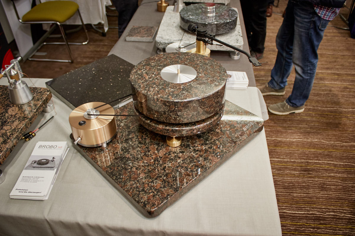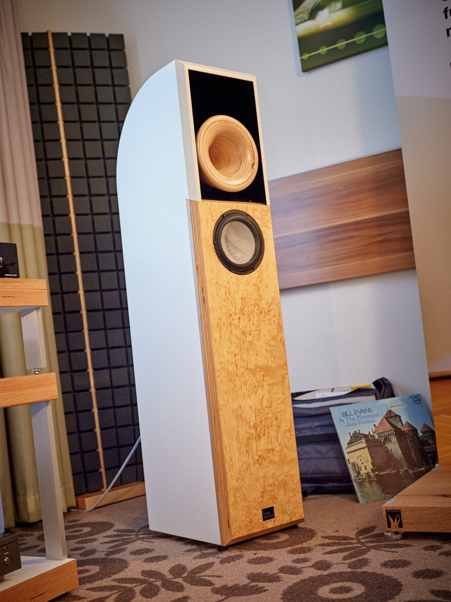 Lignolab machte mit dynamischem Bass und vierzelligem Hochtonhorn einen bodenständigen Eindruck, obwohl es sich um eine extrem waghalsige, digital entzerrte Konstruktion mit offenem Mini-Verstärker vor dem Horn handelt. Dass so etwas auf dem Analog Forum überhaupt erlaubt ist! Klang aber schön stämmig. Endlich war auch bei ToneTool die Tür auf, wo mir schon im Vorjahr ein Gratis-Kaffee versprochen wurde. Hatte ich aber zwischenzeitlich vergessen, Holger Wilhelm, der Erbauer der wundervollen ToneTool-Laufwerke, war so freundlich, mich daran zu erinnern. Dort gab es gleich zwei Premieren zu feiern: Zum einen war das erste Hana-ML-Abtastsystem Europas zu sehen und natürlich zu hören und ein an Fäden schwebend dreipunktgelagerter Einpunkttonarm (oder so) von Studo spielte weltweit an diesem Tag in diesem Raum zum ersten Mal – spektakulär! Zu diesem Zeitpunkt mit Lautsprechern von Lautsprung, die mir auch im letzten Jahr schon aufgefallen waren. Bei einem späteren Besuch fanden sich auf den Stativen kleine Zweiwege-Lautsprecher Bobby-S von Stein Music. Niedliche ventilierte Kisten mit getuntem Hochtonhorn und gewaltigem Klang, daran konnten auch die Audreal-Monos nichts ändern. Die selbstverständlich, man muss das immer dazu sagen, gemessen an ihrem Preis, Großes zu leisten imstande sind.
