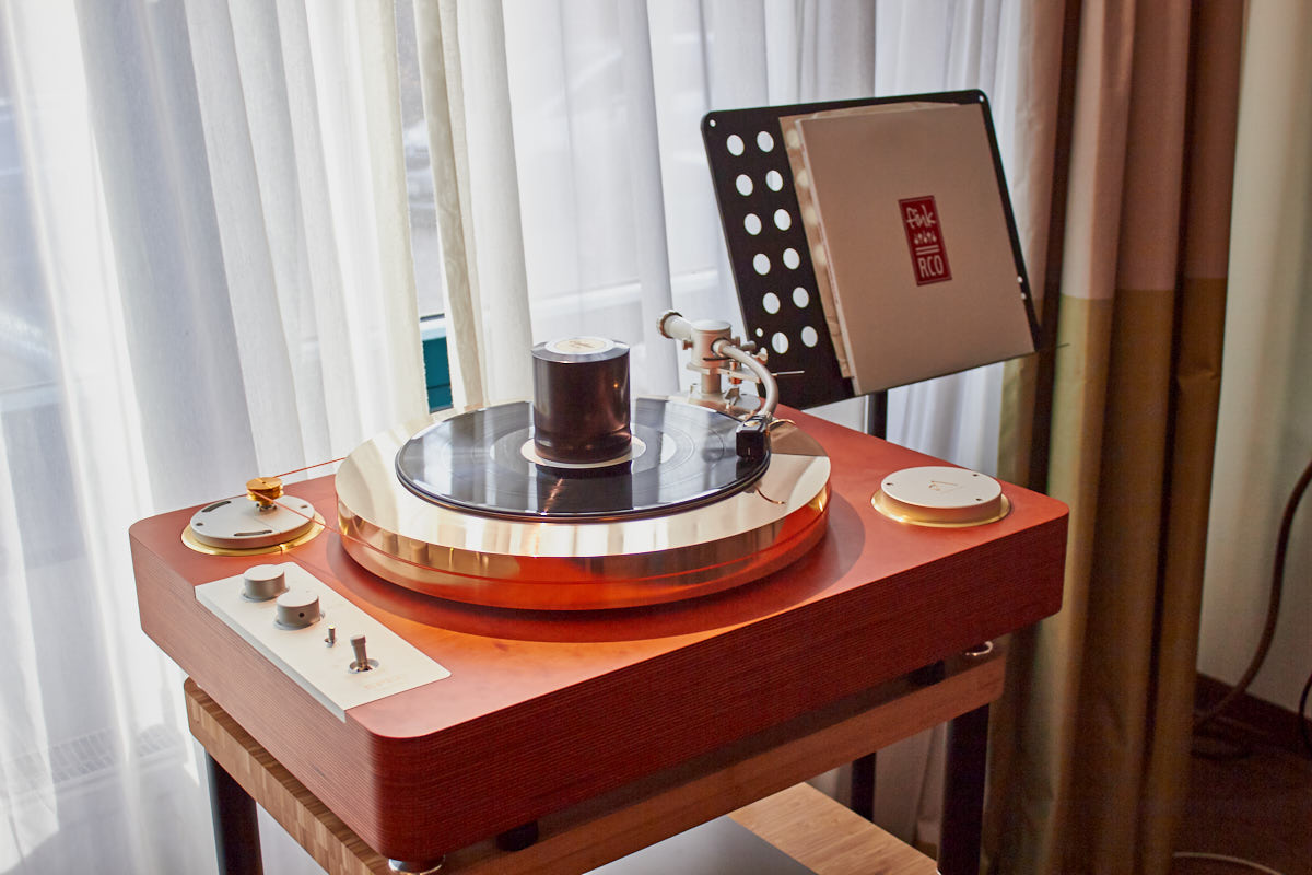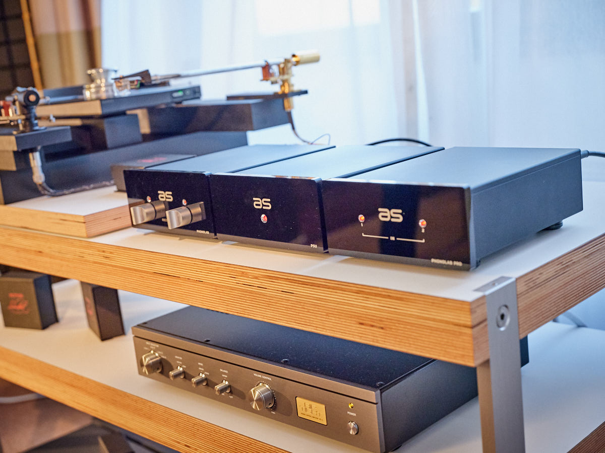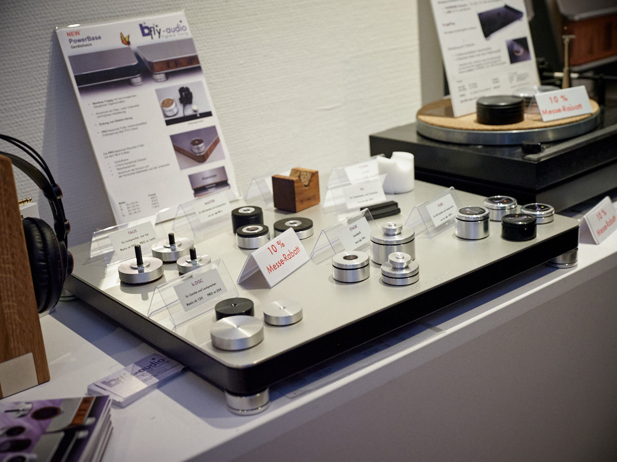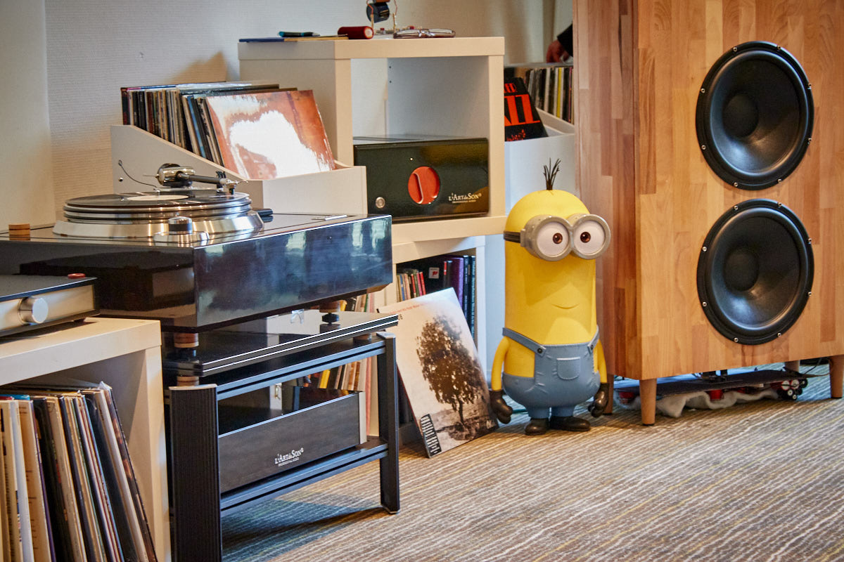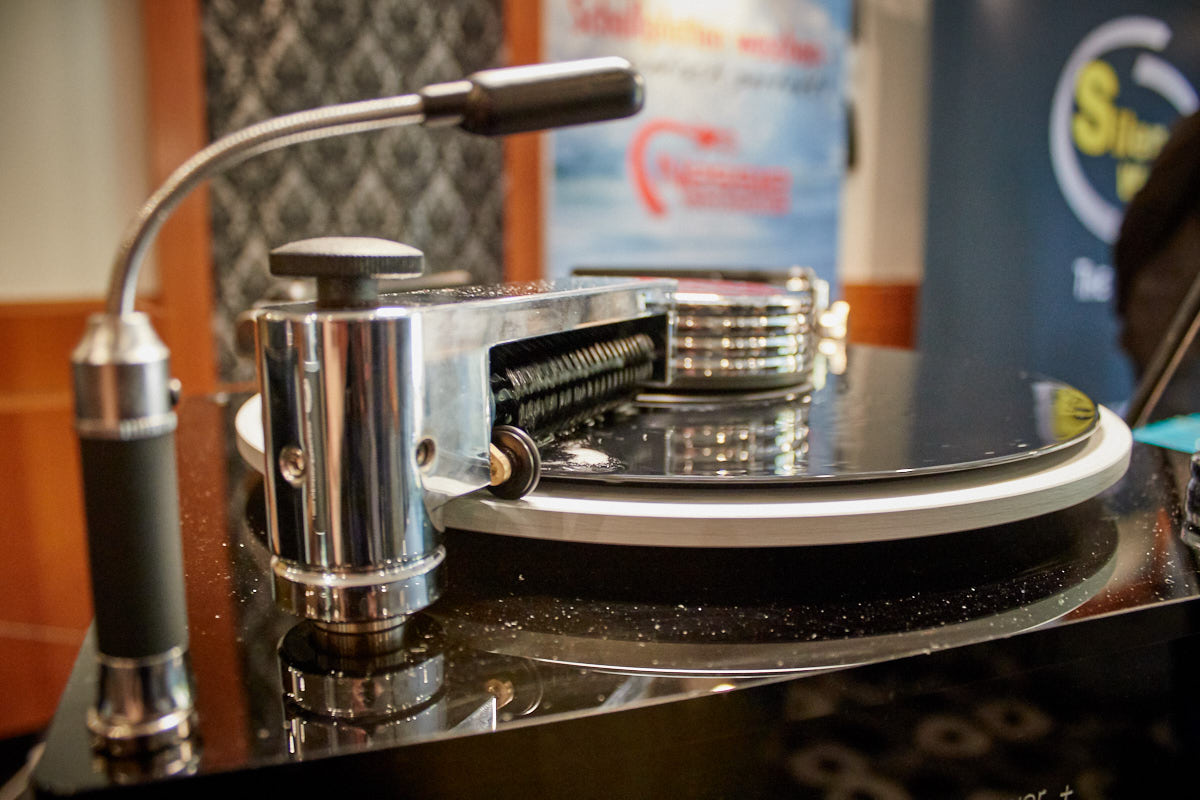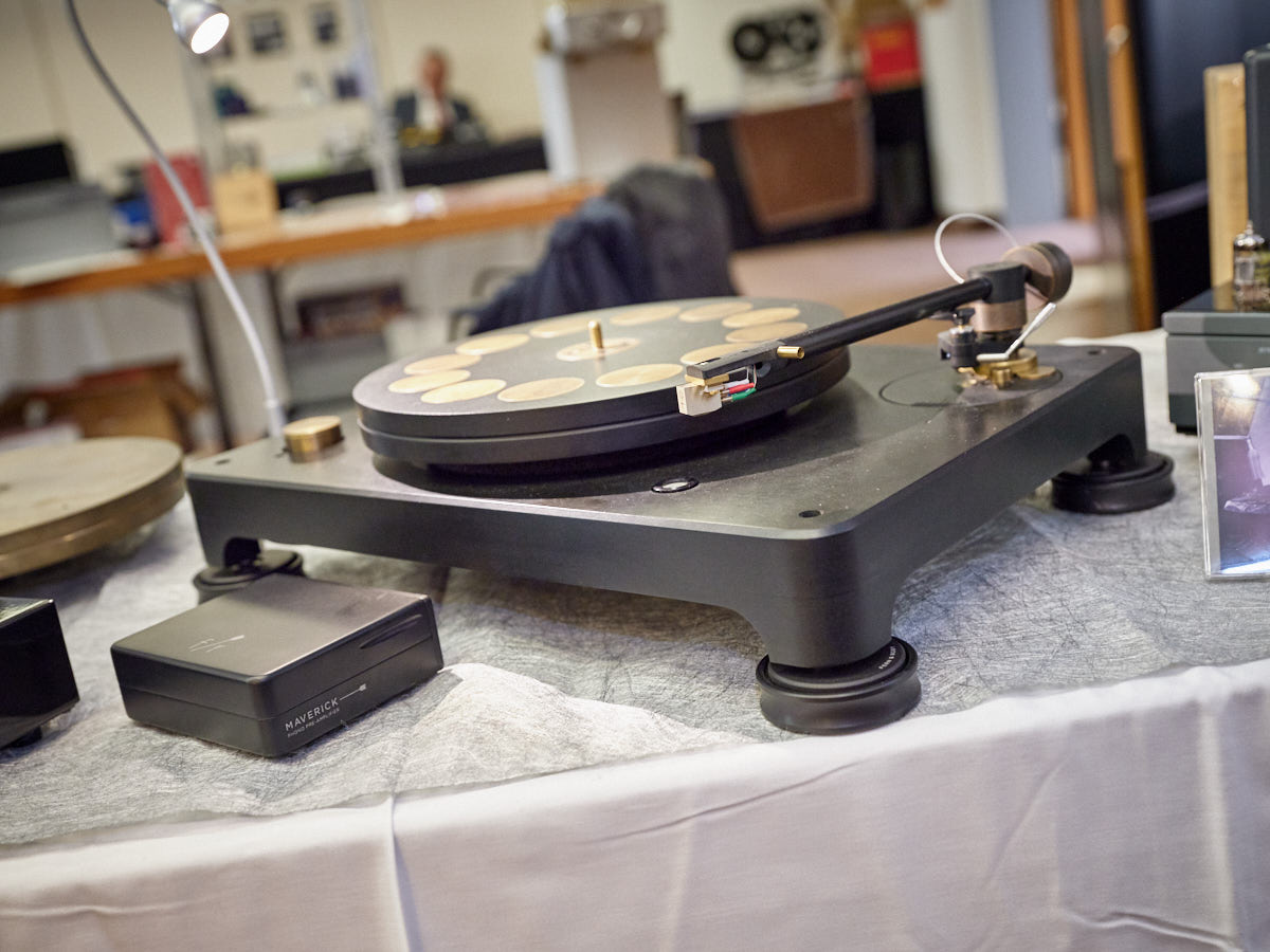 Lignolab machte mit dynamischem Bass und vierzelligem Hochtonhorn einen bodenständigen Eindruck, obwohl es sich um eine extrem waghalsige, digital entzerrte Konstruktion mit offenem Mini-Verstärker vor dem Horn handelt. Dass so etwas auf dem Analog Forum überhaupt erlaubt ist! Klang aber schön stämmig. Endlich war auch bei ToneTool die Tür auf, wo mir schon im Vorjahr ein Gratis-Kaffee versprochen wurde. Hatte ich aber zwischenzeitlich vergessen, Holger Wilhelm, der Erbauer der wundervollen ToneTool-Laufwerke, war so freundlich, mich daran zu erinnern. Dort gab es gleich zwei Premieren zu feiern: Zum einen war das erste Hana-ML-Abtastsystem Europas zu sehen und natürlich zu hören und ein an Fäden schwebend dreipunktgelagerter Einpunkttonarm (oder so) von Studo spielte weltweit an diesem Tag in diesem Raum zum ersten Mal – spektakulär! Zu diesem Zeitpunkt mit Lautsprechern von Lautsprung, die mir auch im letzten Jahr schon aufgefallen waren. Bei einem späteren Besuch fanden sich auf den Stativen kleine Zweiwege-Lautsprecher Bobby-S von Stein Music. Niedliche ventilierte Kisten mit getuntem Hochtonhorn und gewaltigem Klang, daran konnten auch die Audreal-Monos nichts ändern. Die selbstverständlich, man muss das immer dazu sagen, gemessen an ihrem Preis, Großes zu leisten imstande sind.
