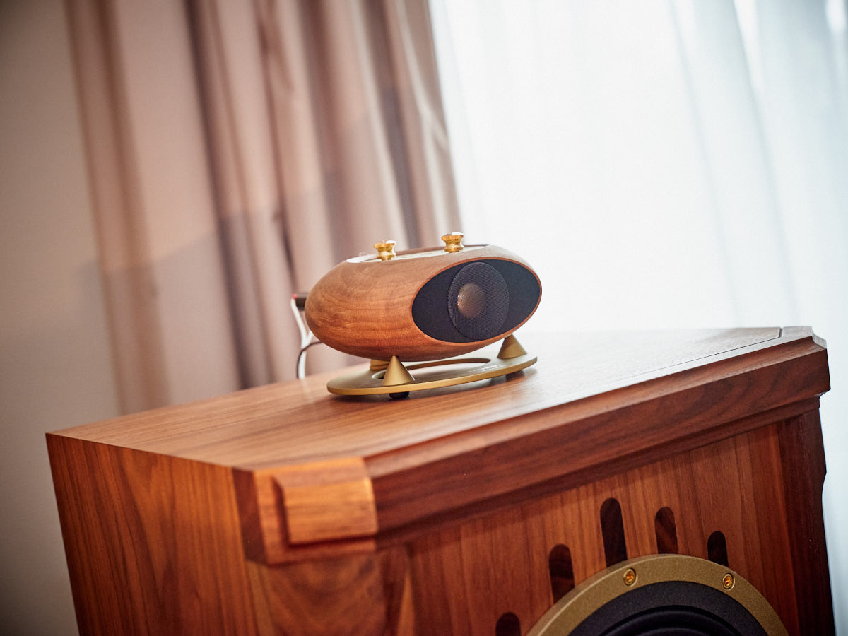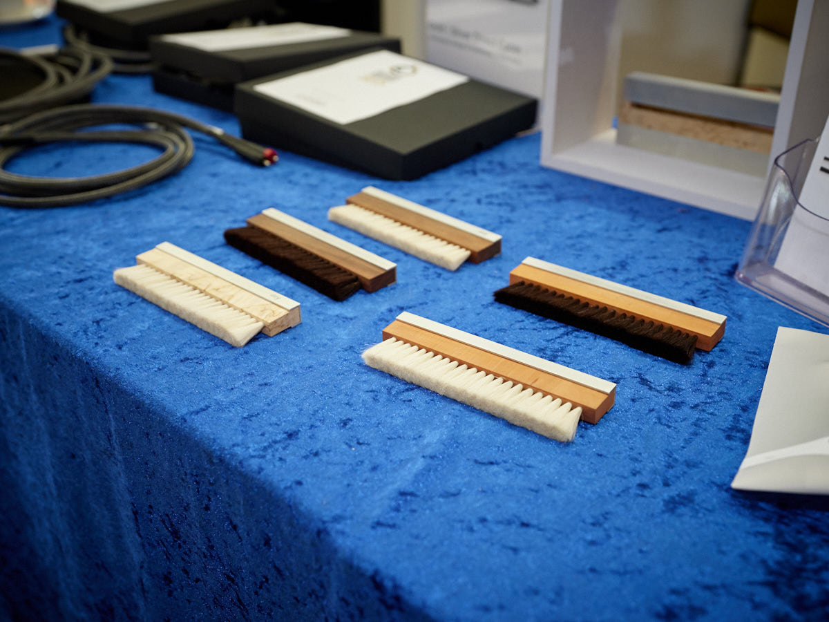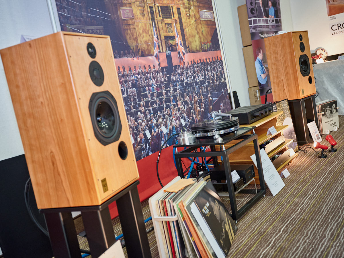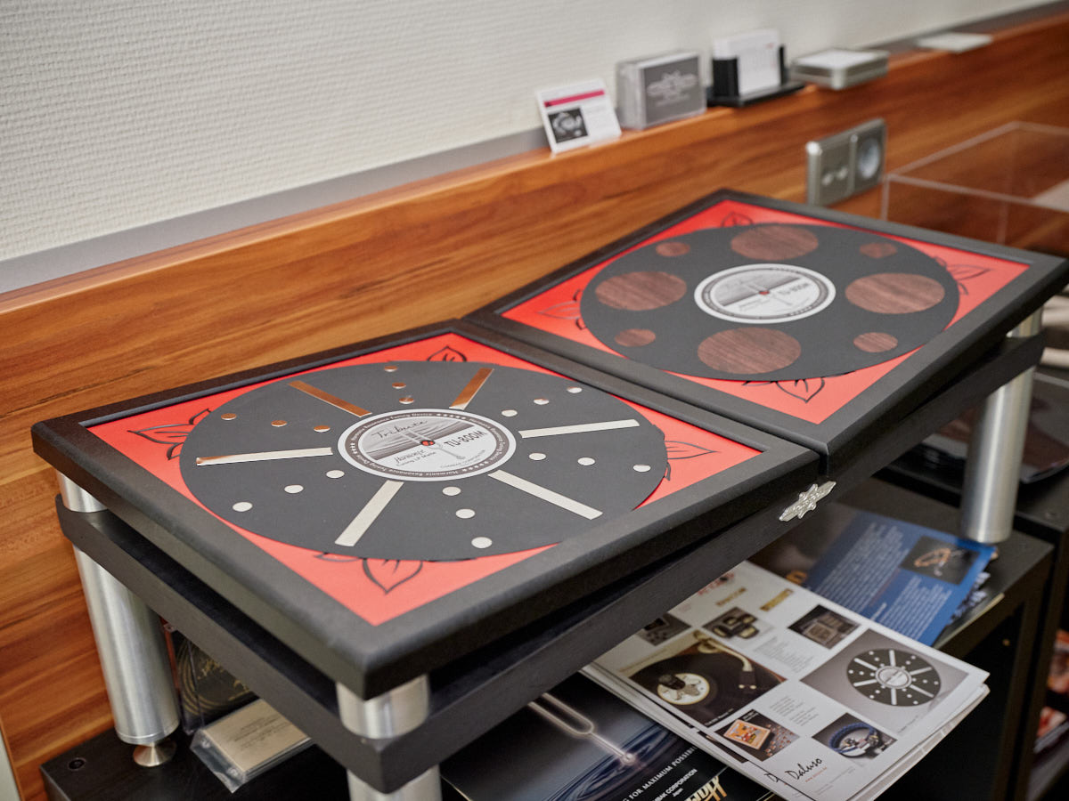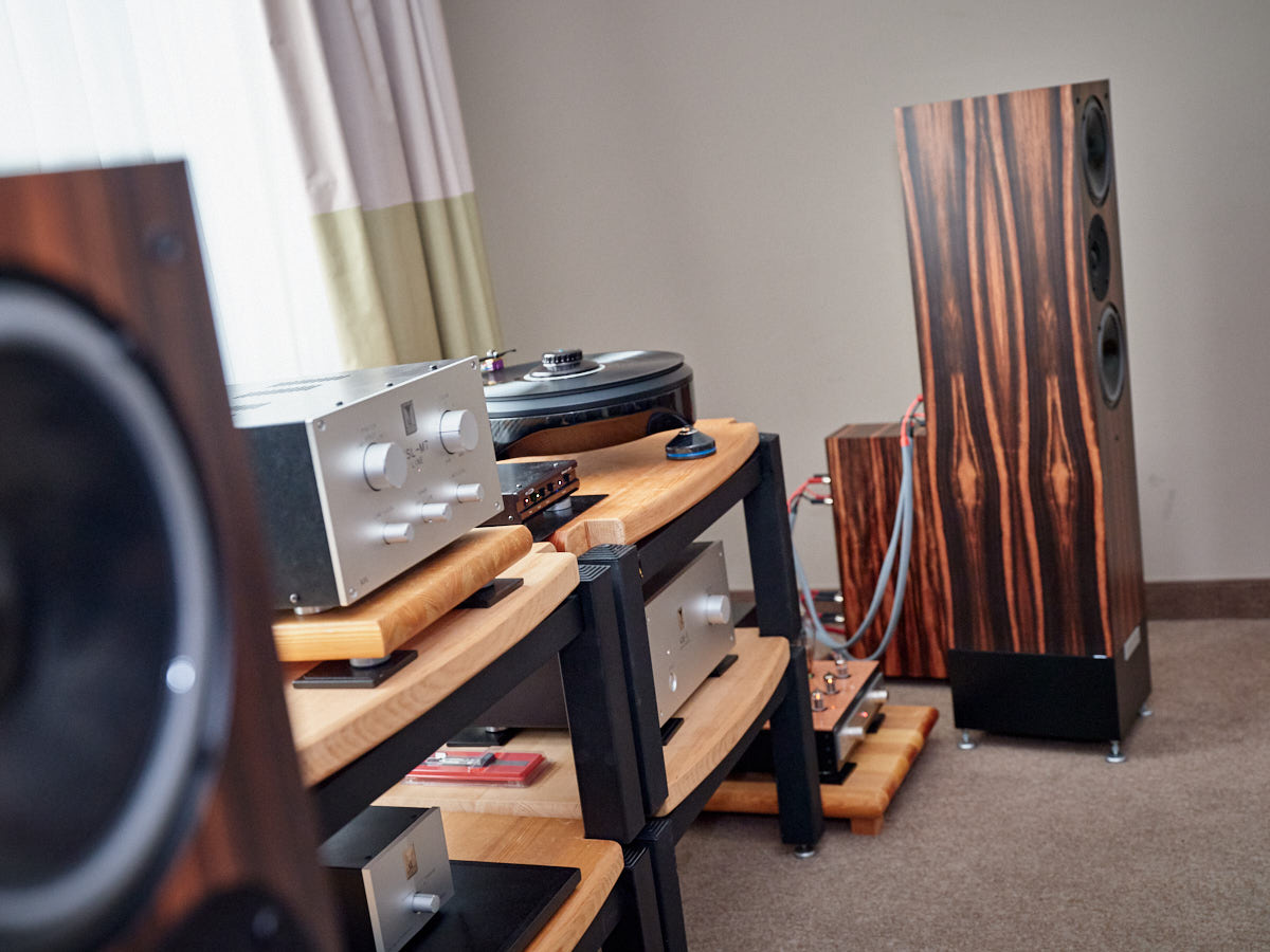 Lignolab machte mit dynamischem Bass und vierzelligem Hochtonhorn einen bodenständigen Eindruck, obwohl es sich um eine extrem waghalsige, digital entzerrte Konstruktion mit offenem Mini-Verstärker vor dem Horn handelt. Dass so etwas auf dem Analog Forum überhaupt erlaubt ist! Klang aber schön stämmig. Endlich war auch bei ToneTool die Tür auf, wo mir schon im Vorjahr ein Gratis-Kaffee versprochen wurde. Hatte ich aber zwischenzeitlich vergessen, Holger Wilhelm, der Erbauer der wundervollen ToneTool-Laufwerke, war so freundlich, mich daran zu erinnern. Dort gab es gleich zwei Premieren zu feiern: Zum einen war das erste Hana-ML-Abtastsystem Europas zu sehen und natürlich zu hören und ein an Fäden schwebend dreipunktgelagerter Einpunkttonarm (oder so) von Studo spielte weltweit an diesem Tag in diesem Raum zum ersten Mal – spektakulär! Zu diesem Zeitpunkt mit Lautsprechern von Lautsprung, die mir auch im letzten Jahr schon aufgefallen waren. Bei einem späteren Besuch fanden sich auf den Stativen kleine Zweiwege-Lautsprecher Bobby-S von Stein Music. Niedliche ventilierte Kisten mit getuntem Hochtonhorn und gewaltigem Klang, daran konnten auch die Audreal-Monos nichts ändern. Die selbstverständlich, man muss das immer dazu sagen, gemessen an ihrem Preis, Großes zu leisten imstande sind.