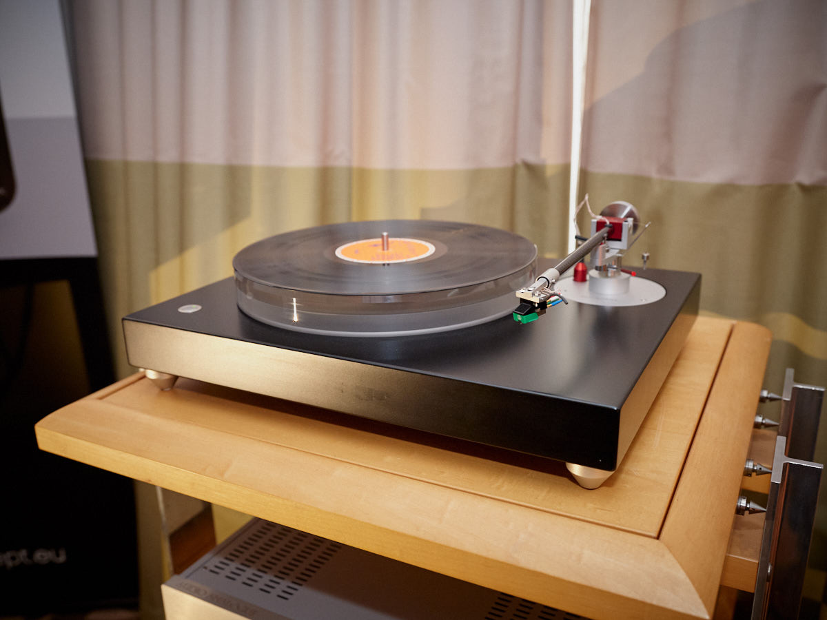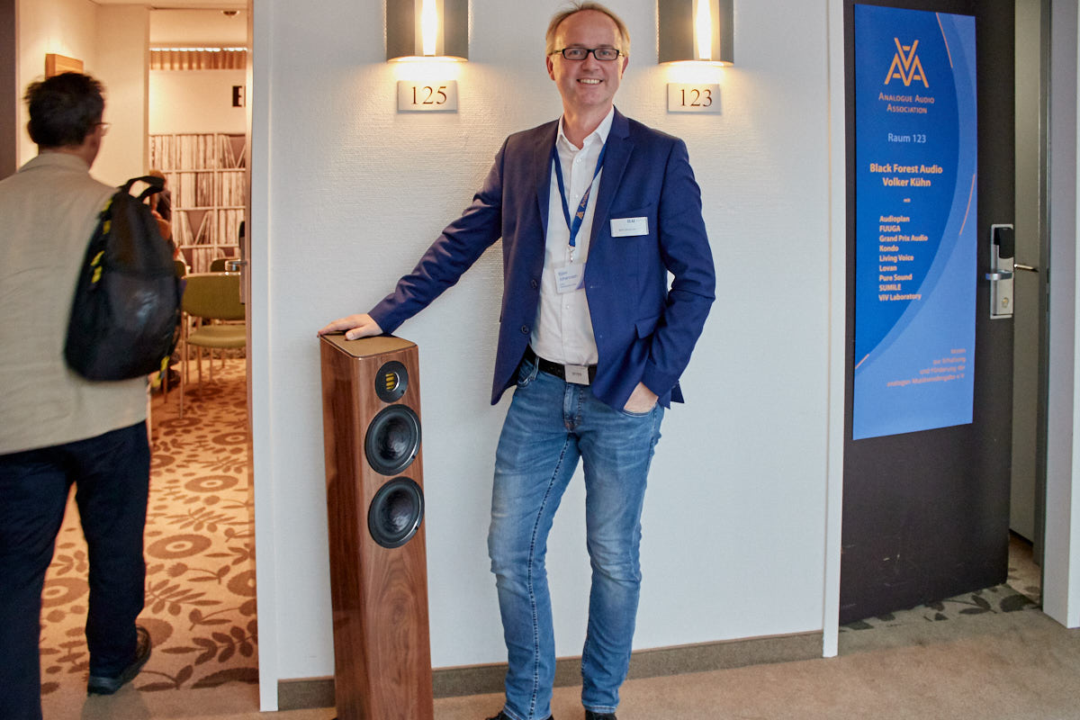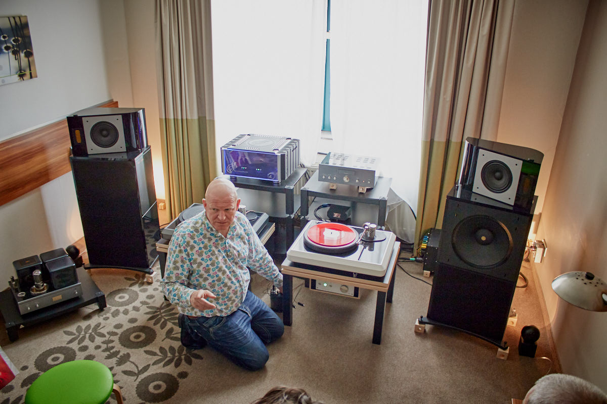 Am nächsten Morgen des ersten offiziellen Messetages war vom Tohuwabohu des Vorabends fast nichts mehr zu sehen, wenngleich es nicht alle Aussteller schafften, ihre Türen pünktlich um zehn Uhr zu öffnen. Zwei oder drei Haribo-Schnecken später stand ich im Raum von Black Forest Audio und sah Volker Kühn über die Schulter, der letzte Hand an sein Setup aus Kondo und Living Voice legte. Interessant, weil neu, war die Kette insbesondere an ihrem vorderen Ende, wo ein Monaco-Dreher im Carbon-Monocoque von Grand Prix Audio nach dieser Einleitung wohl was tat? Genau, er drehte Einführungsrunden. Ein unheimlich schlichtes Laufwerk, das durch den beigestellten Rigid-Float-Arm noch puristischer wirkt. „Weniger ist mehr – und so wenig wie dieses Jahr hatte ich noch nie.“, scherzte das HiFi-Urgestein Volker Kühn gutgelaunt. „Der hat gut lachen, mit einer Kette, die wie von einem anderen Stern klingt.“, dachte ich, wobei ich möglicherweise den letzten Teil des Satzes laut aussprach, was Volker Kühns beipflichtendes Nicken erklären würde. Hier könnte ich den ganzen Samstag verbringen, ohne mich zu langweilen, obwohl die überwiegend klassische Plattenauswahl meine alternative musikalische Qualifikation vor große Herausforderungen stellt.