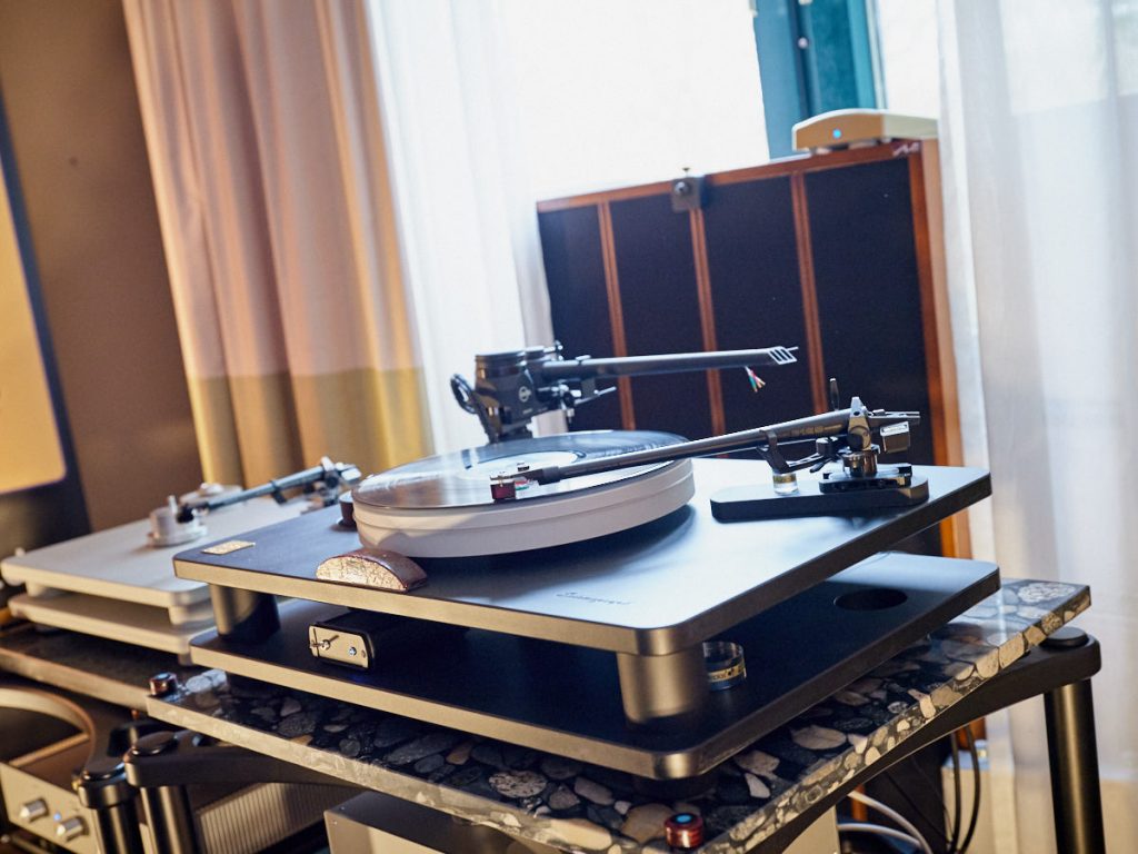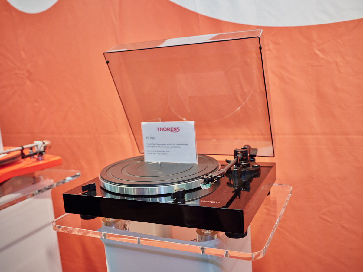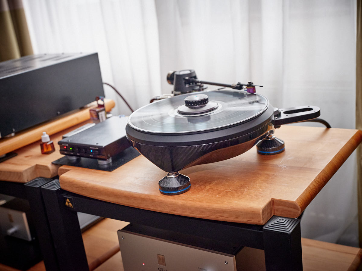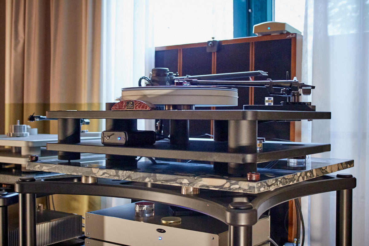 Am nächsten Morgen des ersten offiziellen Messetages war vom Tohuwabohu des Vorabends fast nichts mehr zu sehen, wenngleich es nicht alle Aussteller schafften, ihre Türen pünktlich um zehn Uhr zu öffnen. Zwei oder drei Haribo-Schnecken später stand ich im Raum von Black Forest Audio und sah Volker Kühn über die Schulter, der letzte Hand an sein Setup aus Kondo und Living Voice legte. Interessant, weil neu, war die Kette insbesondere an ihrem vorderen Ende, wo ein Monaco-Dreher im Carbon-Monocoque von Grand Prix Audio nach dieser Einleitung wohl was tat? Genau, er drehte Einführungsrunden. Ein unheimlich schlichtes Laufwerk, das durch den beigestellten Rigid-Float-Arm noch puristischer wirkt. „Weniger ist mehr – und so wenig wie dieses Jahr hatte ich noch nie.“, scherzte das HiFi-Urgestein Volker Kühn gutgelaunt. „Der hat gut lachen, mit einer Kette, die wie von einem anderen Stern klingt.“, dachte ich, wobei ich möglicherweise den letzten Teil des Satzes laut aussprach, was Volker Kühns beipflichtendes Nicken erklären würde. Hier könnte ich den ganzen Samstag verbringen, ohne mich zu langweilen, obwohl die überwiegend klassische Plattenauswahl meine alternative musikalische Qualifikation vor große Herausforderungen stellt.