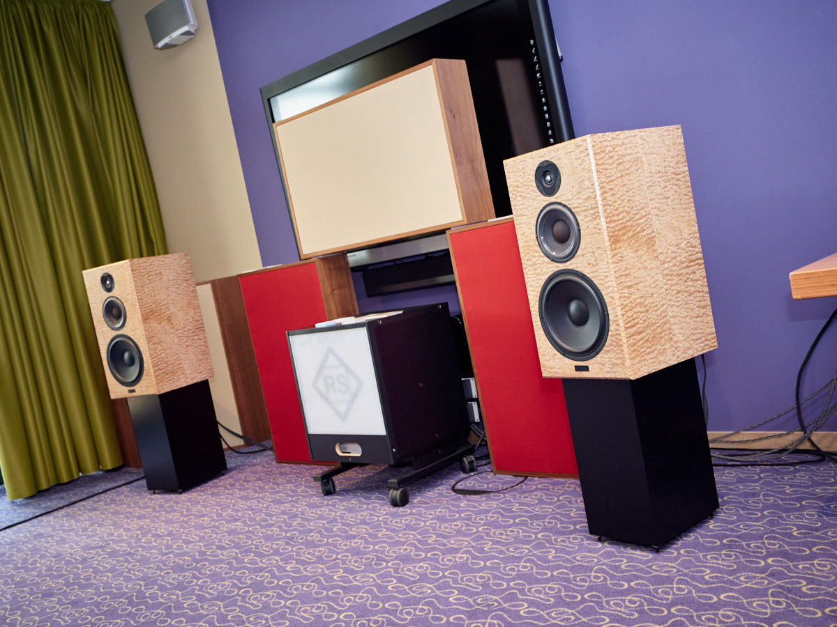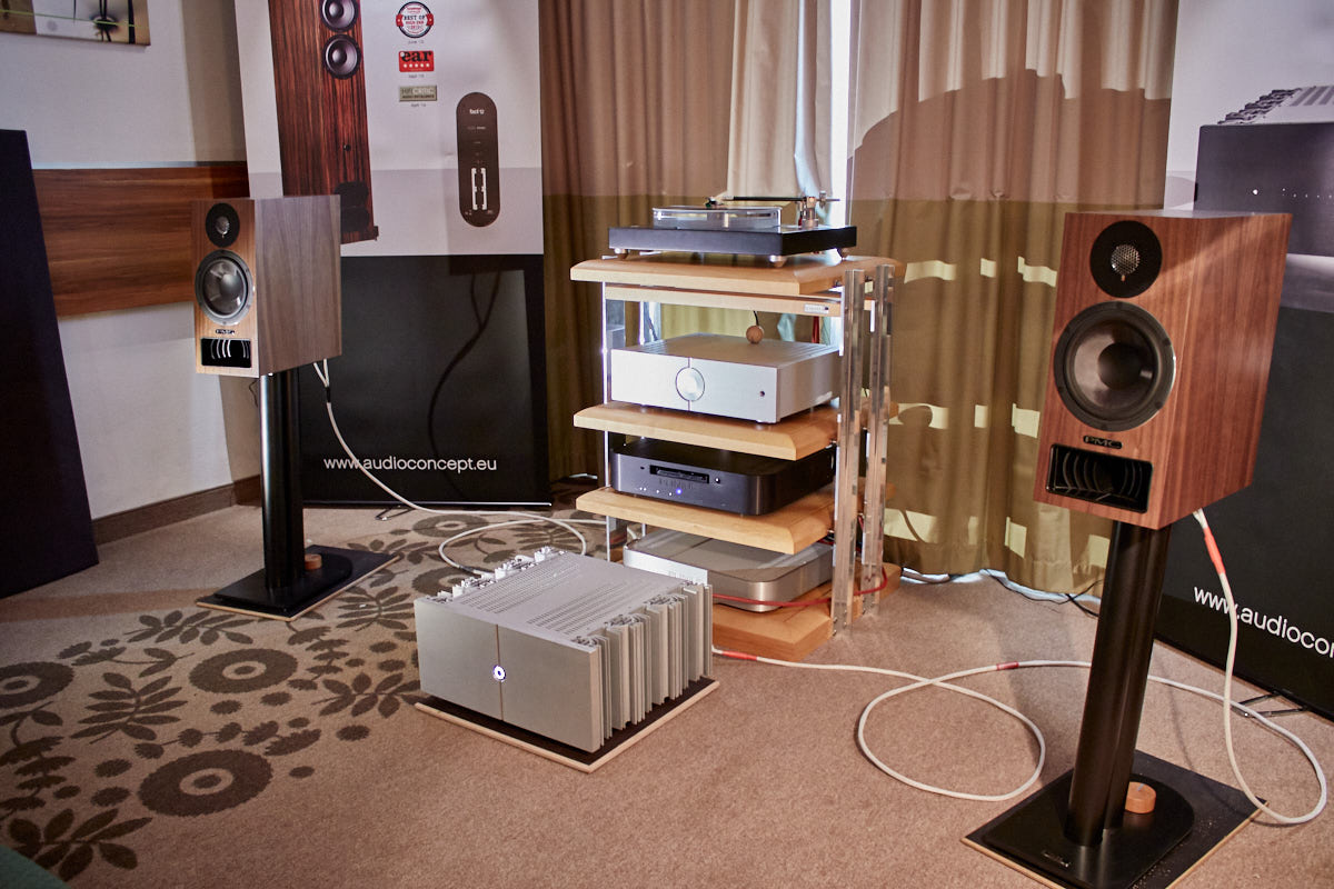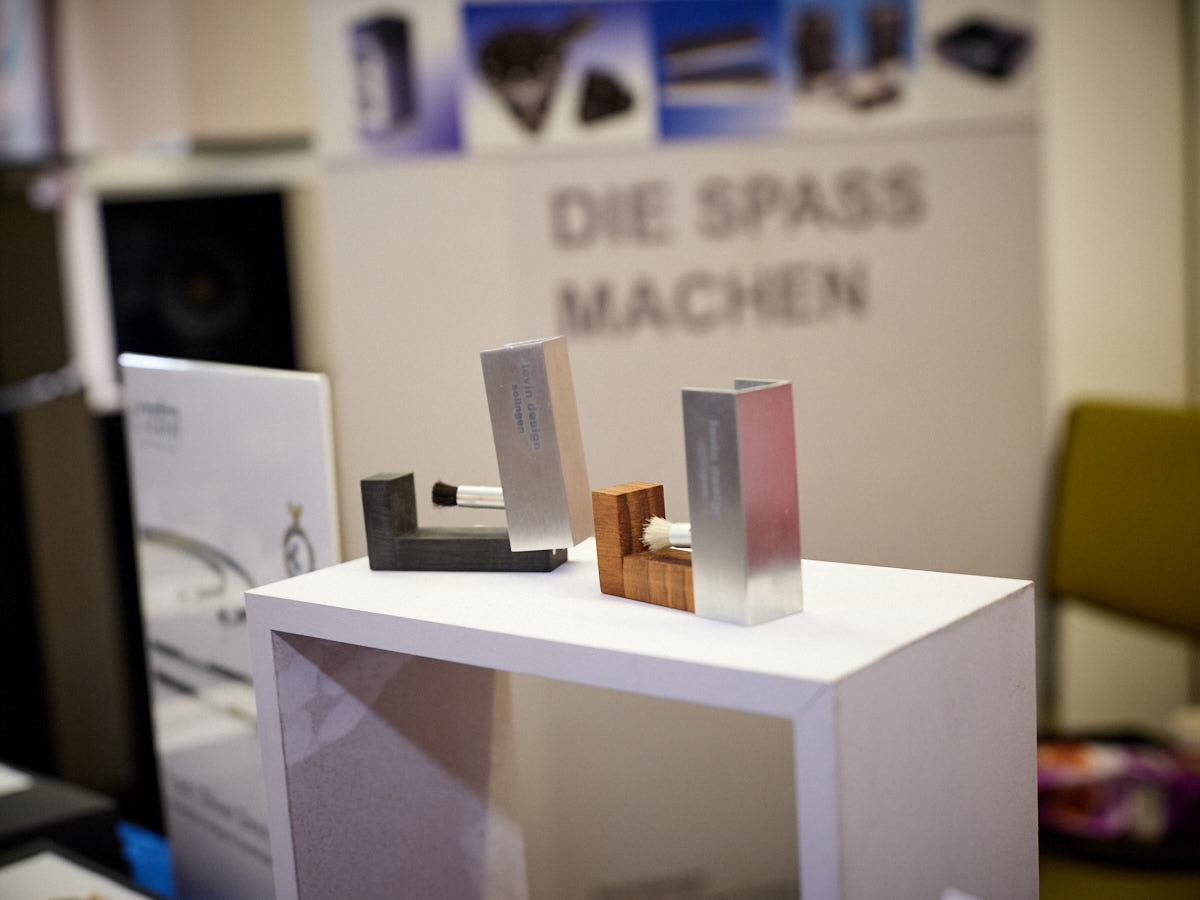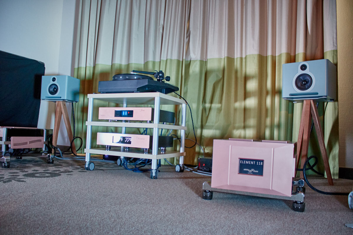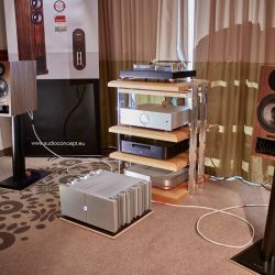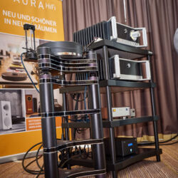 Im ersten Raum des Ganges fand sich wie üblich Acapella, die dieses Jahr mit der vergleichsweise zierlichen Harlekin vorführten, was in Anbetracht der Raumgröße sicher keine schlechte Idee war. Gehört habe ich sie jedoch nicht, obwohl ich den Raum zwei- oder dreimal besuchte, hatte ich immer das Pech (bzw. das Glück) ein cleveres, kleines, in seine eigene Standfläche integriertes System namens LaMusika zu hören. Eine Komposition, möchte ich fast sagen, aus Holz und Metall für Sideboards oder ähnliche Stellflächen, die wie bereits erwähnt ihr eigenes Rack mitbringt: zwei kleine Monitore mit Breitbändern nach vorne und oben, die fest in ein Trägerprofil von etwa zwei Meter Länge integriert sind, dazwischen hat z. B. ein Plattenspieler Platz, darunter befindet sich noch ein Einschubfach mit CD-Receiver – fertig ist die wohlklingende Designanlage. Klasse Idee, kompromisslos umgesetzt.