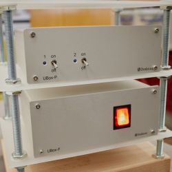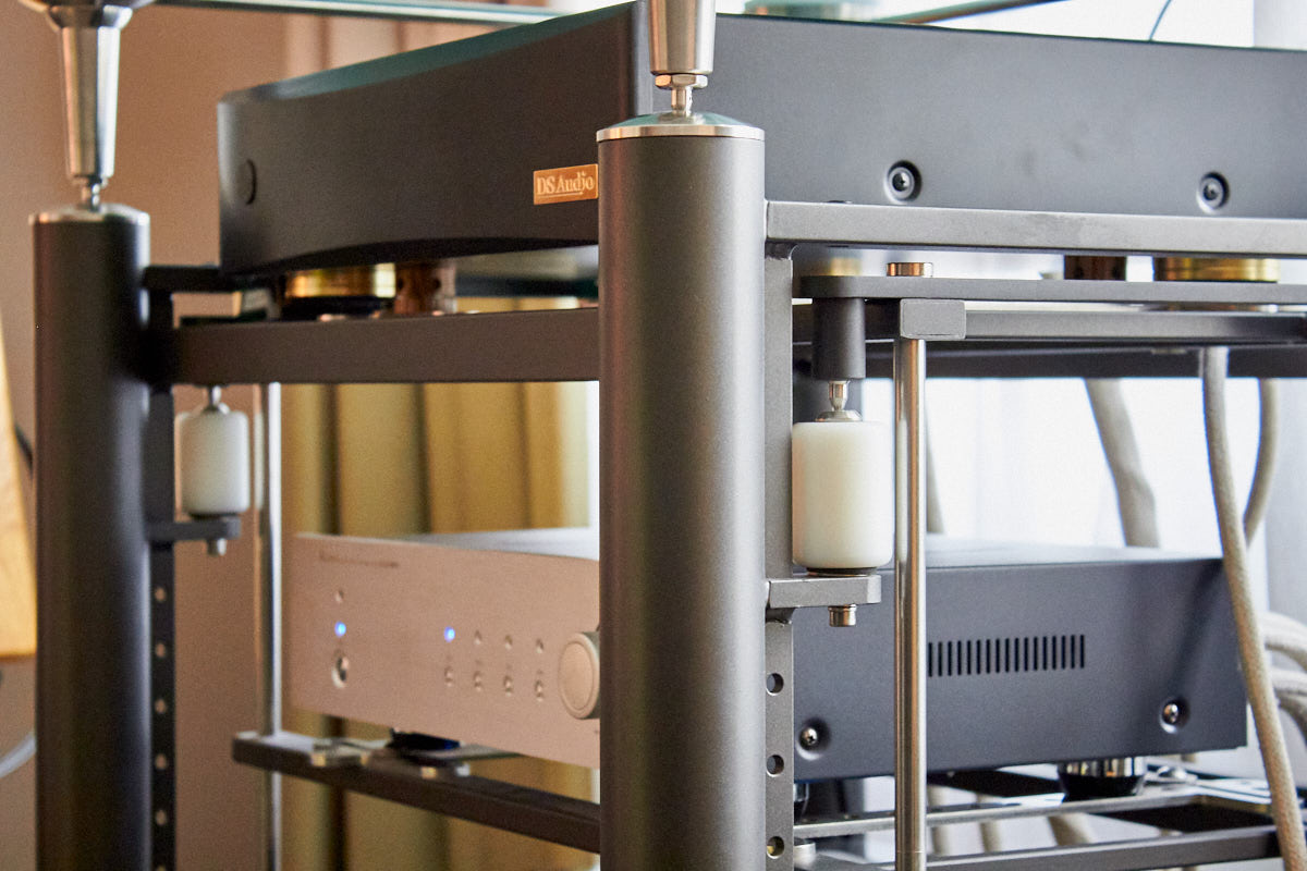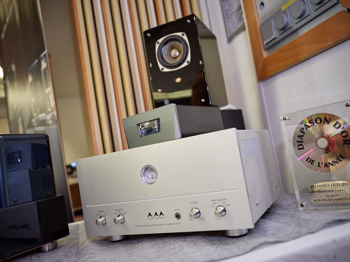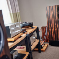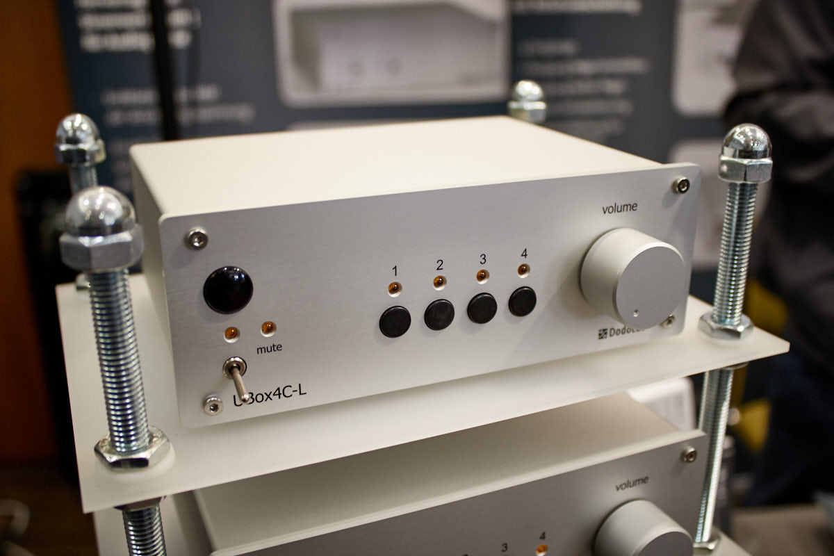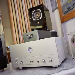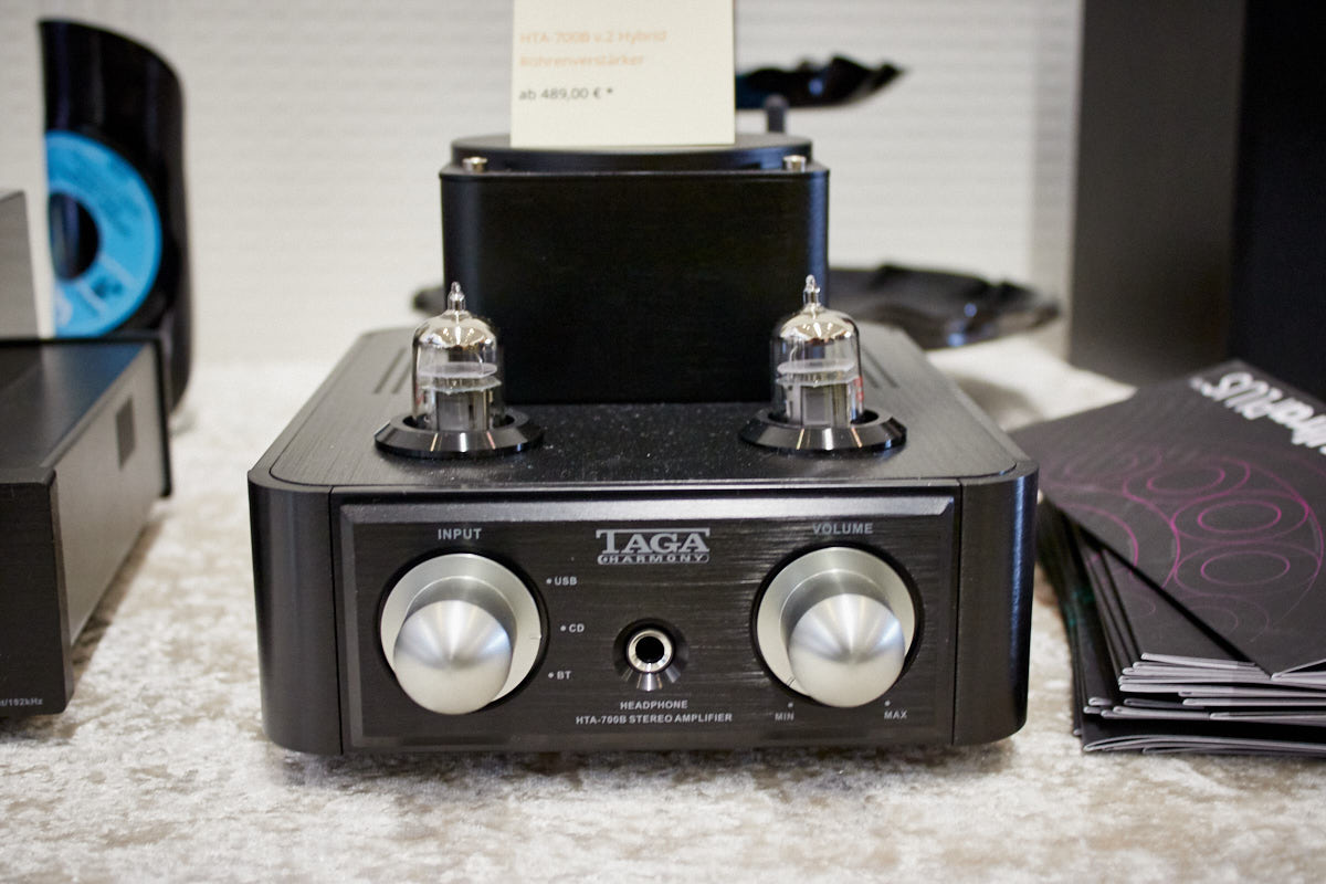 Im ersten Raum des Ganges fand sich wie üblich Acapella, die dieses Jahr mit der vergleichsweise zierlichen Harlekin vorführten, was in Anbetracht der Raumgröße sicher keine schlechte Idee war. Gehört habe ich sie jedoch nicht, obwohl ich den Raum zwei- oder dreimal besuchte, hatte ich immer das Pech (bzw. das Glück) ein cleveres, kleines, in seine eigene Standfläche integriertes System namens LaMusika zu hören. Eine Komposition, möchte ich fast sagen, aus Holz und Metall für Sideboards oder ähnliche Stellflächen, die wie bereits erwähnt ihr eigenes Rack mitbringt: zwei kleine Monitore mit Breitbändern nach vorne und oben, die fest in ein Trägerprofil von etwa zwei Meter Länge integriert sind, dazwischen hat z. B. ein Plattenspieler Platz, darunter befindet sich noch ein Einschubfach mit CD-Receiver – fertig ist die wohlklingende Designanlage. Klasse Idee, kompromisslos umgesetzt.