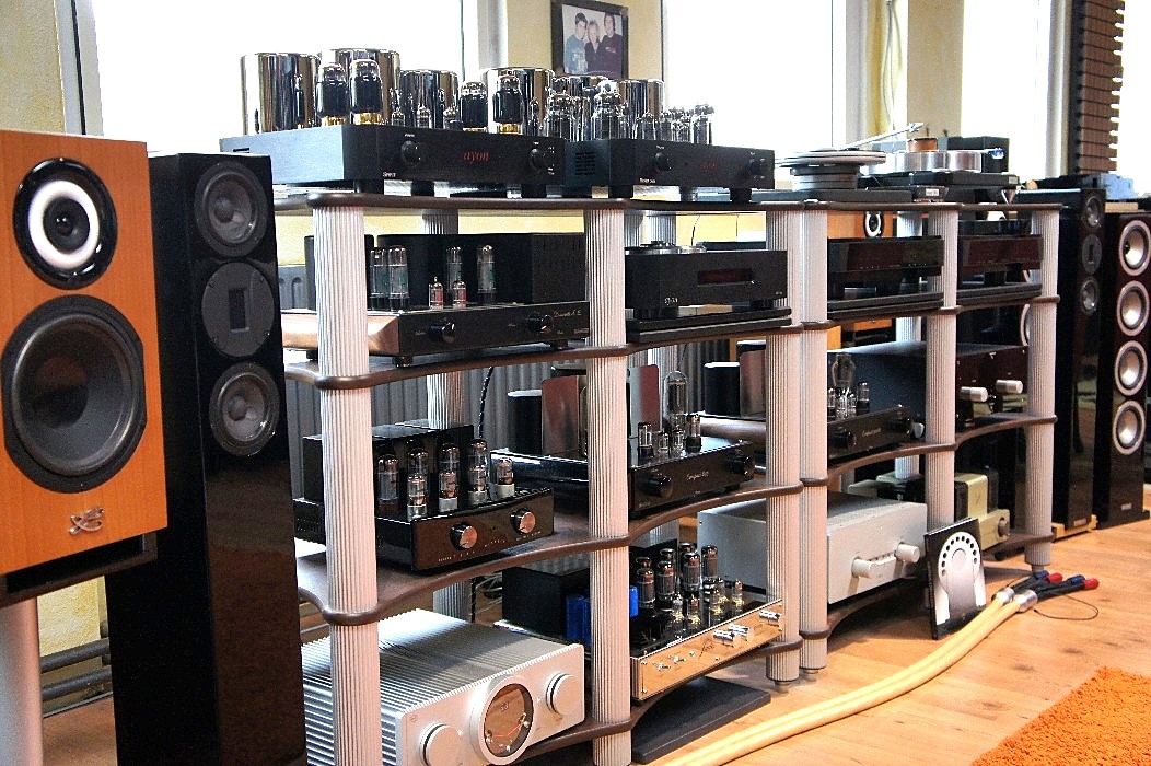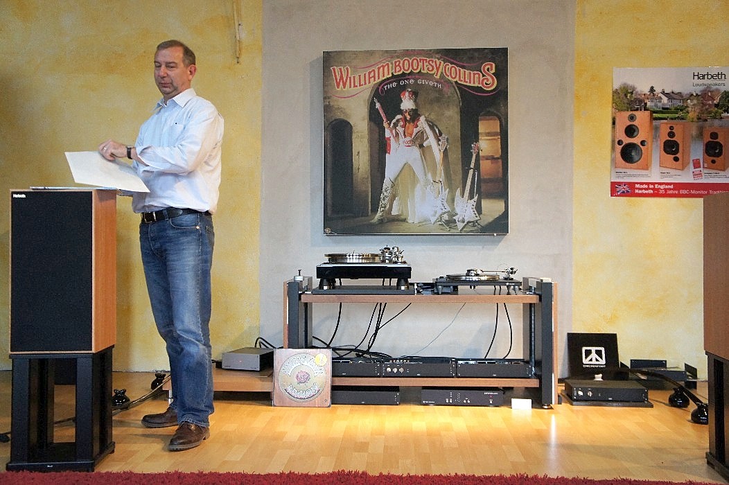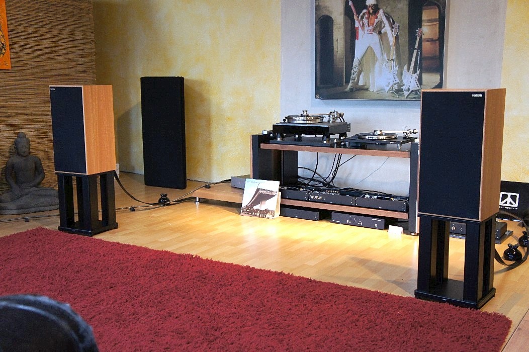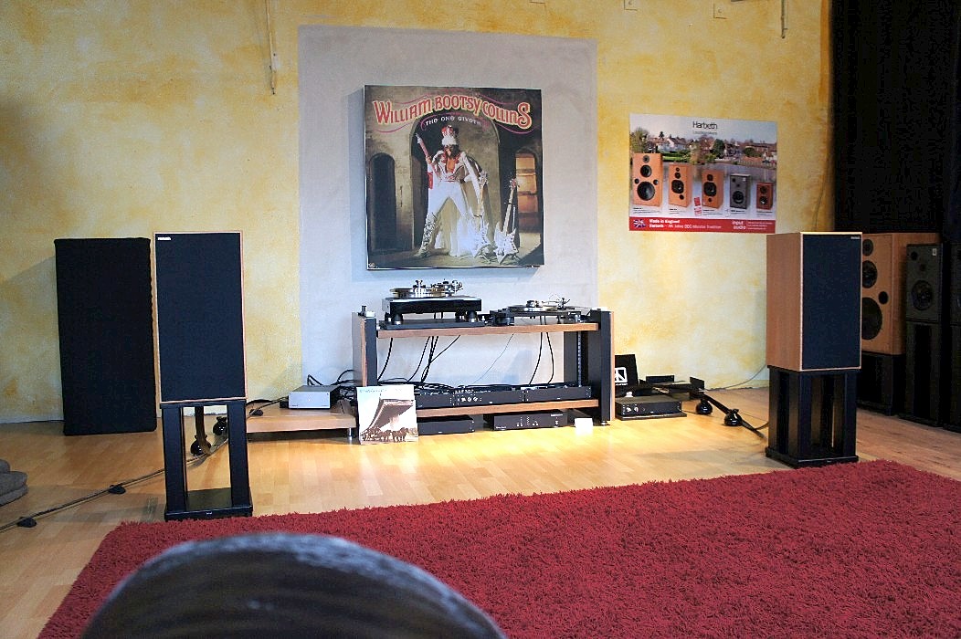 Gehört wurden folgende Harbeth-Modelle: Monitor 30.1 (ein echtes Wahnsinnsteil!), Monitor 40.1, Super HL5, 7ES3. Zur Verkabelung waren Tellurium Q Ultra Black und Tellurium Q Graphite im Einsatz, außerdem die Netzleiste von Vibex.? Die Geräte wurden in einem Finite Elemente Emperor Aktiv Rack platziert, gespielt wurde wenig audiophiles Material, stattdessen sehr viel Musik!