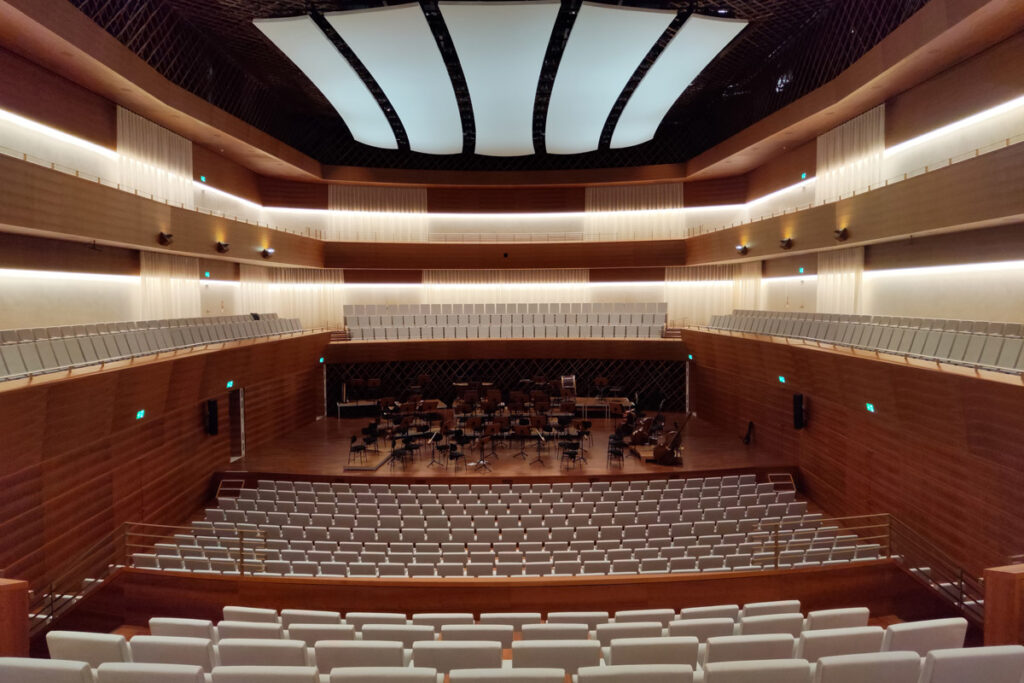 Aber wie ist er nun, der große Saal? Hinter der Bühne, denn damit fange ich immer an, ist alles bestens. Die Garderoben befinden sich auf der gleichen Etage wie die Bühne, die Gänge sind weit, die Türen breit. Die Bühne ist licht und flexibel, das Raumgefühl bestens, da die Mischung aus Exposition und Geborgenheit stimmt. Die fast 1100 Plätze sind fast nur vor dem Orchester und seitlich auf zwei Rängen angeordnet.