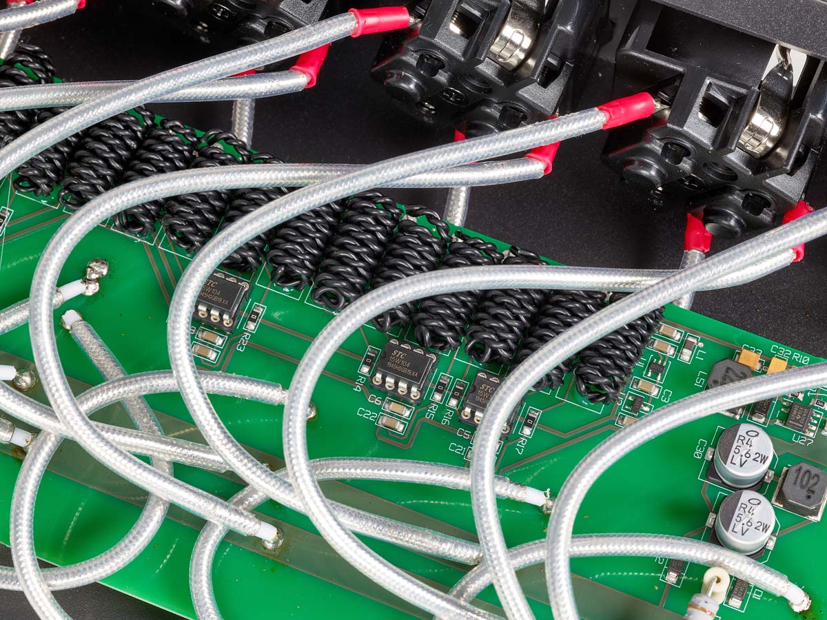 Das Fundament des A2 bilden ein massiver Block aus verschiedenen lackierten Hölzern (Deckel und Front) sowie ein dünner Aluminiumrahmen für Boden und Rückwand. Der Stromverteiler ruht auf vier Füßen, die an die Darkz-Serie des Herstellers erinnern. Im Inneren – ebenfalls auf Darkz-artigen Basen – verbirgt sich eine große Platine mit überraschend wenigen Bauteilen und einigen Leiterbahnen. Die rückwärtigen Steckdosen sind nicht direkt aufgelötet, sondern stellen den Kontakt zur Leiterplatte über zahlreiche kurze Strippen unterschiedlicher Stärken her. Allen Kabeln ist gemein, dass sie ineinander verdrillt sind oder sogar mit gewundenen dünneren Käbelchen ummantelt wurden – jedes Detail dieser filigranen Detailarbeit wird übrigens direkt vor Ort in Aalborg gefertigt. Unerwünschte mechanische Schwingungen werden über die hervorragenden Füße abgeleitet, während praktisch nichts an der Konstruktion magnetisch ist. Entsprechend wenig Angriffsfläche gibt es für elektromagnetische Felder. Das Vermeiden direkter Kontakte zwischen den Bauteilen leistet ein Übriges. Resonanzterminierung im und am Gehäuse: Check!