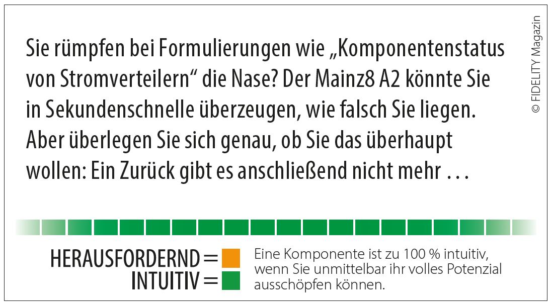 Sie rümpfen bei Formulierungen wie „Komponentenstatus von Stromverteilern“ die Nase? Der Mainz8 A2 könnte Sie in Sekundenschnelle überzeugen, wie falsch Sie liegen. Aber überlegen Sie sich genau, ob Sie das überhaupt wollen: Ein Zurück gibt es anschließend nicht mehr …