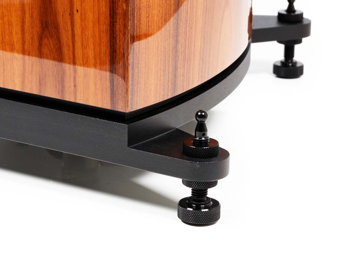 Der Schein trügt. Die vier verstellbaren Füße der Enigma dienen lediglich zum Ausbalancieren. Das Gewicht des Lautsprechers ruht auf einem einzigen großen zentralen Spike.