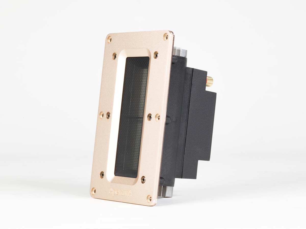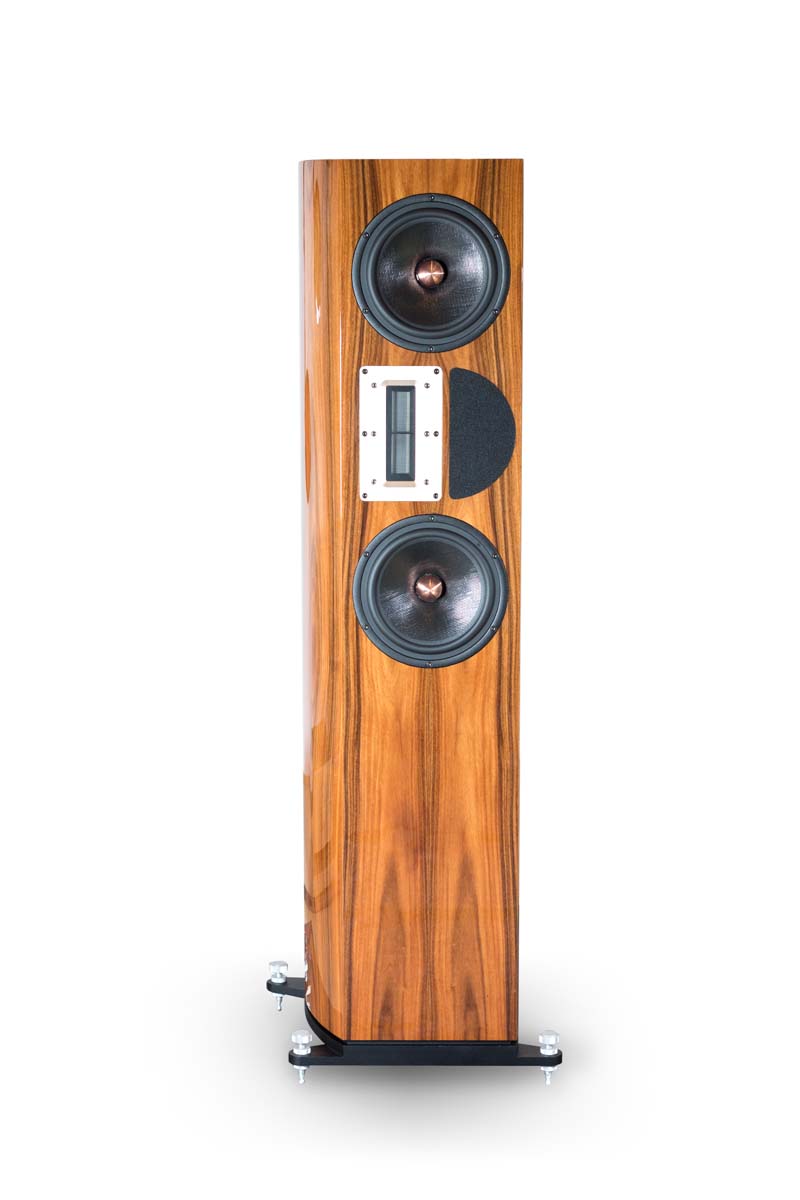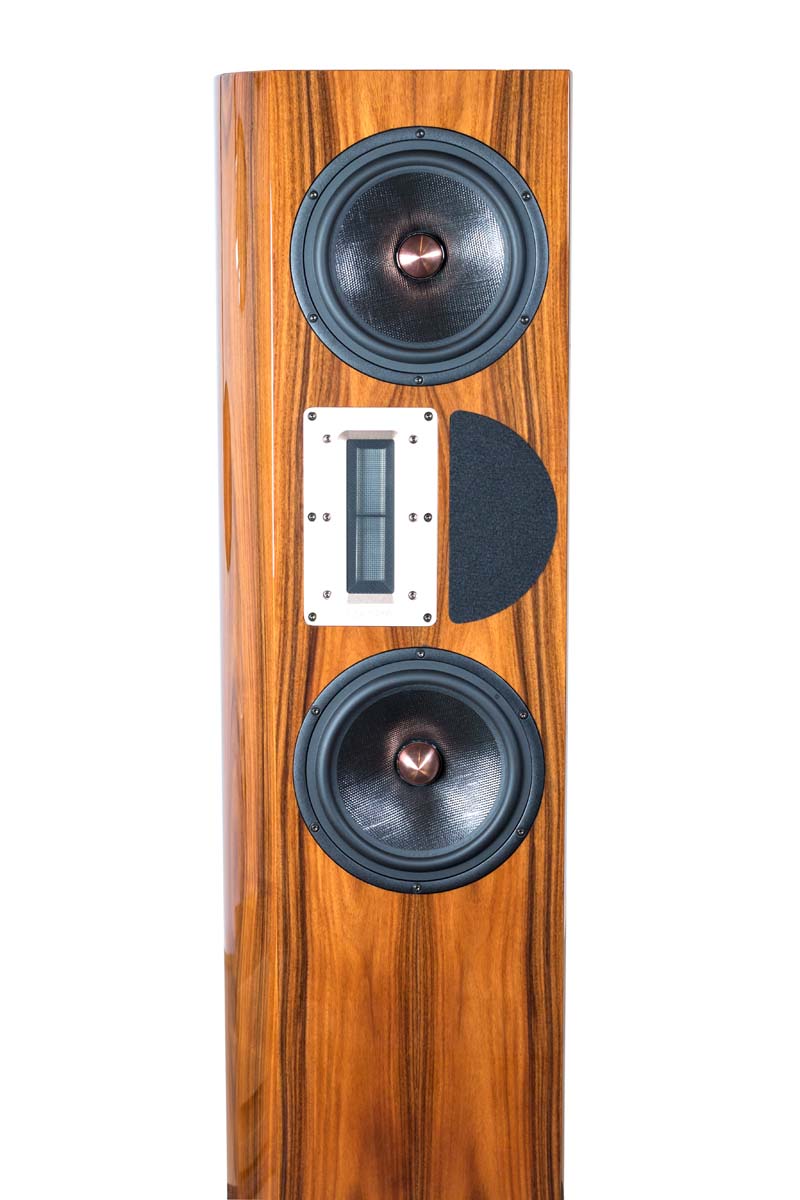 Mit dem Bändchen aus chinesischer Fertigung, das auf Apertura-Order mit einem anderen als dem serienmäßigen Übertrager ausgestattet wird, gelingt es, einen sehr fein zeichnenden, niemals spitzen oder harten Hochtonbereich zu realisieren. Daneben ist ein rund ein Zentimeter dicker, halbkreisförmiger Filz-Absorber in die Front eingelassen, der die Frequenz-Abrisskante des Bändchens entschärft.