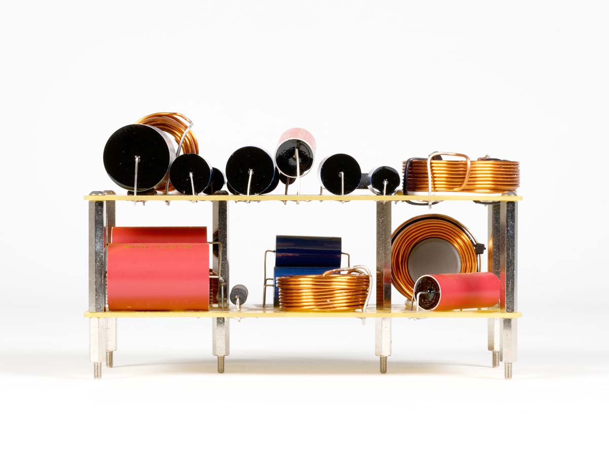 Die Zwei-Platinen-Weiche, unter anderem bestückt mit großen Jantzen-Kondensatoren und Vishay-Widerständen, wird auf die Treiber des Zweiwege-Systems individuell abgestimmt.