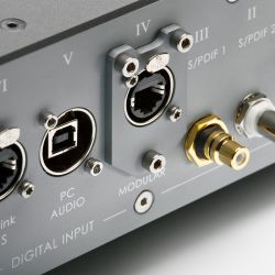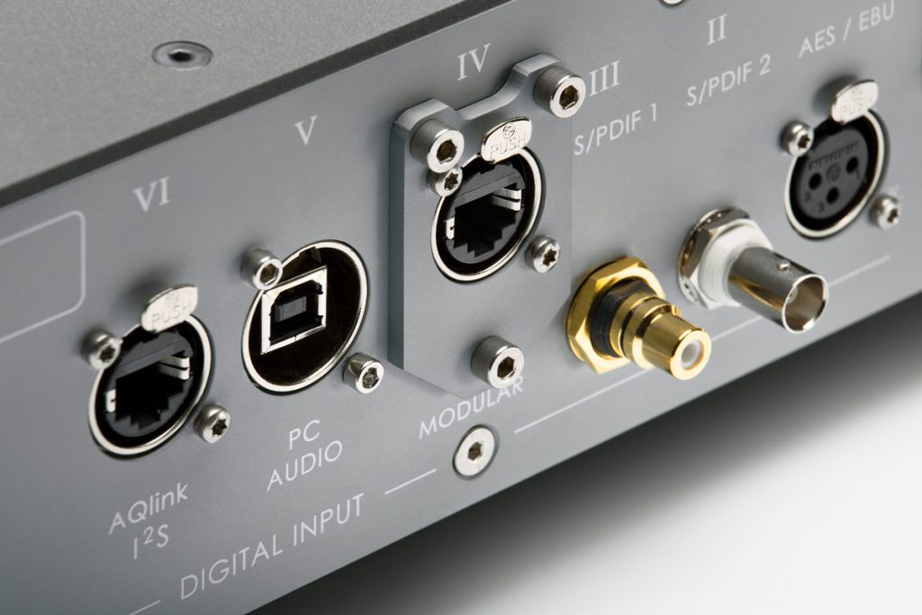 Der Aqua Formula xHD bietet Ein- und Ausgänge nach sämtlichen gängigen Standards. Eine Besonderheit ist ein digitaler Eingang ausschließlich für den Anschluss des hauseigenen CD-Laufwerks La Diva. Diese „AQlink PRO“ getaufte Schnittstelle kommuniziert per I2S-Protokoll, unbestritten der direkteste und am wenigsten mit Jitter belastete Weg für das digitale Musiksignal. Daneben kann einer der sechs vorhandenen Digitaleingänge nach Kundenwunsch bestückt werden, etwa mit einer optischen Schnittstelle, die unter den serienmäßig vorhandenen Inputs nicht zu finden ist.