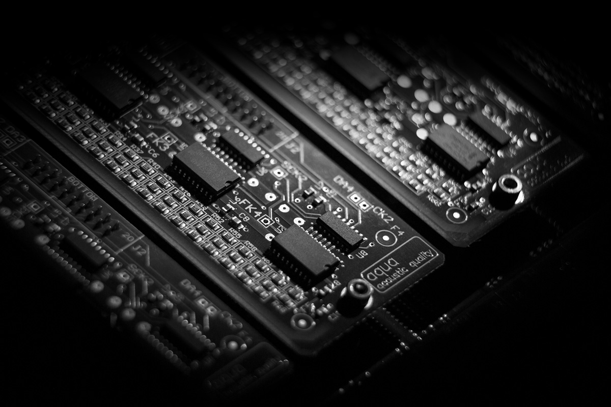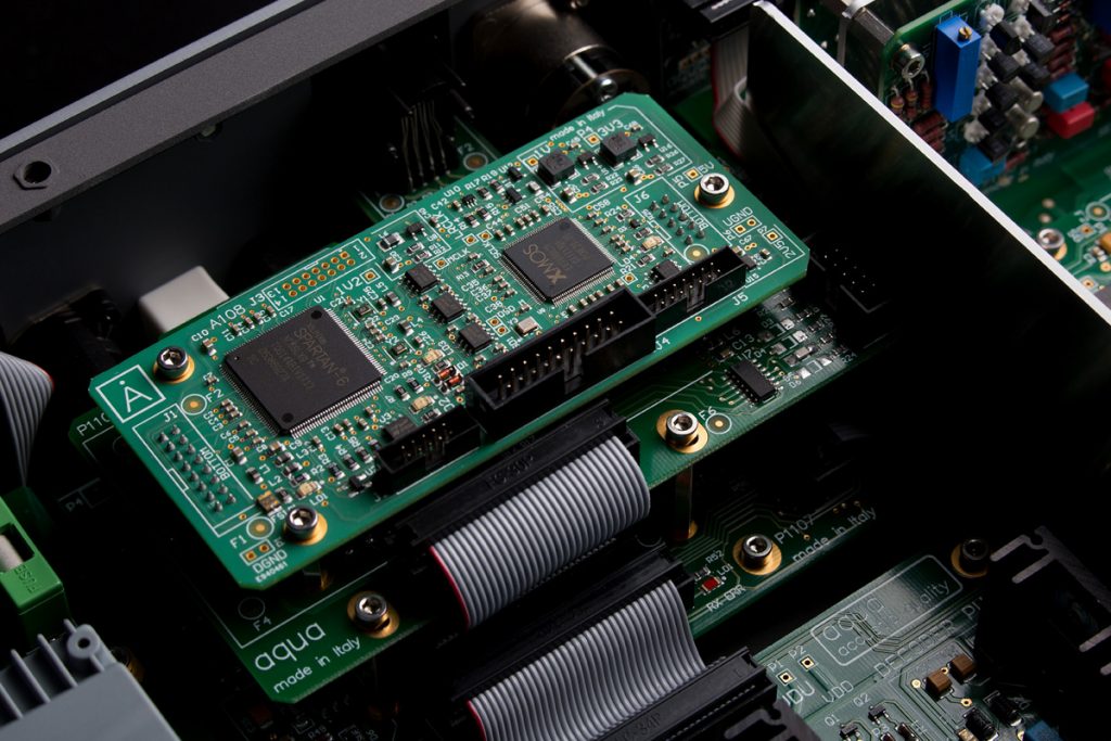 Die Steuerung erfolgt durch eigens programmierte Software, die in einem FPGA-Chip abgelegt ist. Aquas Kniff bei der Realisierung des Ganzen liegt in der galvanischen Trennung von FPGA mitsamt der ganzen digitalen Peripherie, inklusive taktgebendem Quartz, und den als schon der analogen Welt zugehörig verstandenen Widerständen. Auf die Weise soll die elektrische Masse frei von jeglichen Störungen gehalten und eine perfekte Symmetrie der Wandlersektion erreicht werden. Das Ziel lautet: bestmögliche Klangfarbentreue und Natürlichkeit. Selbstverständlich sind die Netzteile für den digitalen und den analogen Part getrennt und wurde bei der Wahl der Bauteile auf klangliche Qualität ebenso geachtet wie auf langfristige Stabilität und Zuverlässigkeit. Der Signalweg ist direktgekoppelt und frei von Kondensatoren.