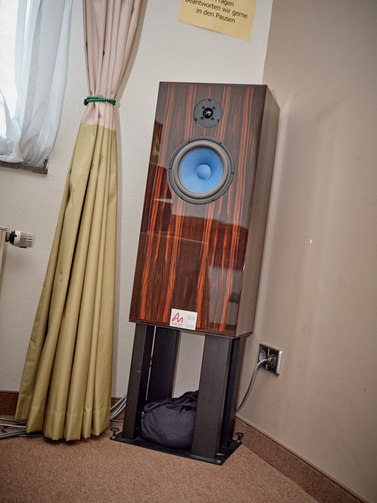 Wie schaffen die Engländer das nur mit in die Ecke gequetschten Zwei-Wege-Lautsprechern – das mir altbekannte Modell AN-E – und unter modernen Gesichtspunkten geradezu lächerlicher Verstärkerleistung einen so gewaltigen Eindruck zu hinterlassen, der einen immer völlig von den technischen Aspekten der Wiedergabe wegführt. Regelmäßig ertappe ich mich bei der Messenachlese dabei, wie es mich bei Audio Note wieder einmal nicht interessiert hat, ob und was genau neu und noch besser als vorher schon war, dass ich erneut nicht nachgeschaut habe, ob der 2.1x-Signature-DAC einen USB-Eingang hat (natürlich nicht, wo denken Sie hin) oder auf Sicht geprüft habe, ob der Nadelazimut des Plattenspielers korrekt wirkt. Audio-Note-Vorführungen sind für mich so etwas wie Kurzurlaube vom Messeurlaub. Der Plattenspieler spielte übrigens in der Standardausführung, jedoch mit großem Netzteil 3 und kostet in dieser Konfiguration 12000 Euro.