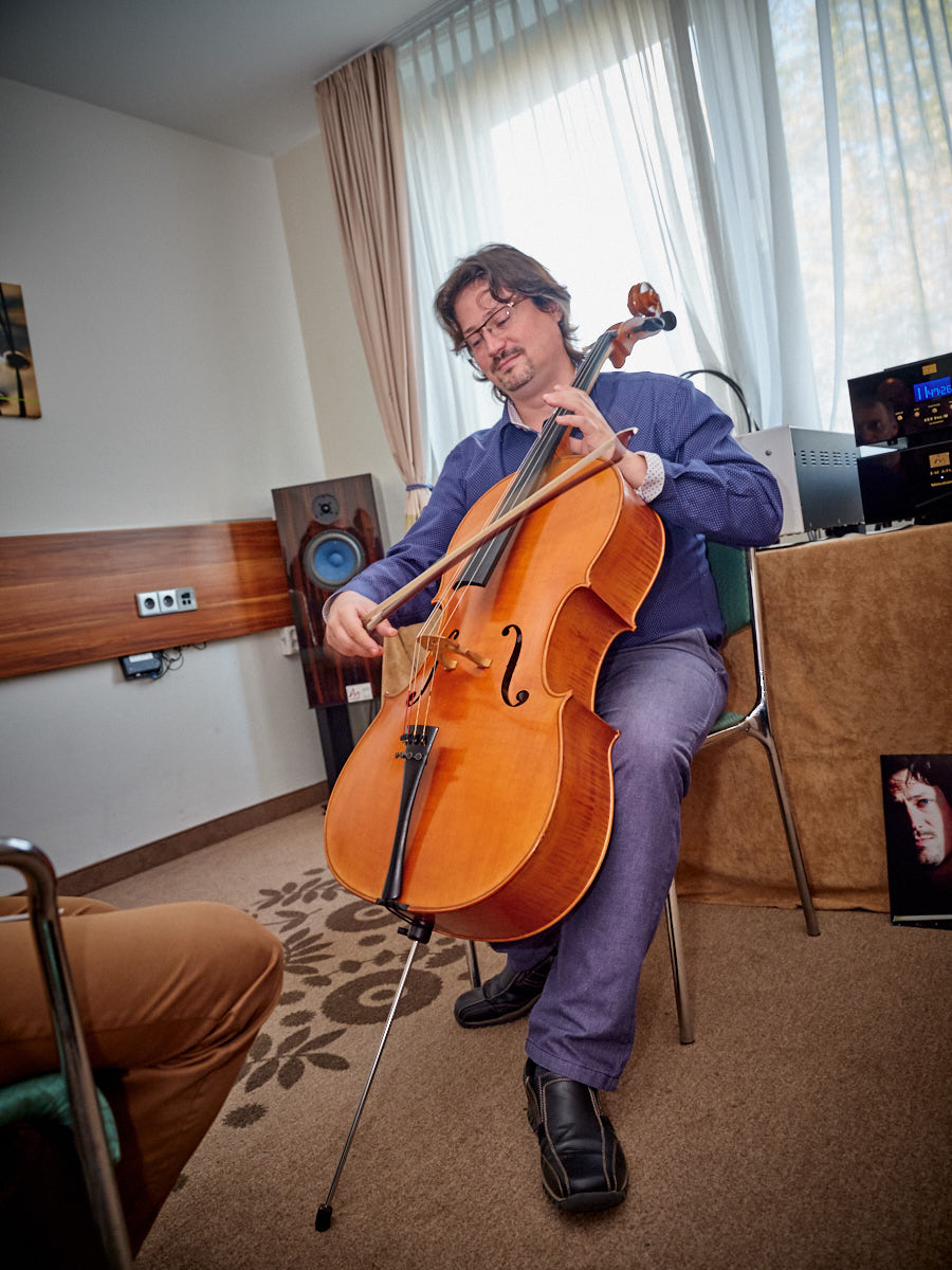 An beiden gut besuchten Messetagen schloss Alexander Voigt die Tür von Zimmer 151 rigoros mehrmals täglich für eine Viertelstunde, denn dann gab sich die heimliche Attraktion Vincent Bélanger die Ehre, live und im direkten Vergleich zur Audio-Note-Kette aufzutreten. Nach einer kurzen Einführung griff sich der kanadische Cellist, der beim Audio-Note-Label unter Vertrag steht, seinen Bogen und strich dem kleinen Hotelzimmer angemessen sanft über die Saiten seines Instruments. An der Echtheit dieses Tons besteht in anderthalb Metern Entfernung nicht der geringste Zweifel, das Cello füllt den Raum mit sonorer Energie wie es wohl nur der Resonanzkörper eines echten Instruments kann. Es geht bei dieser für einen Audio-Hersteller sehr mutigen Vorführung aber auch nicht darum, die Kongruenz zwischen Live und Wiedergabe zu beweisen, damit wären wir wieder bei den eingangs kurz erwähnten Blendern, sondern darum, den Täuschungsgrad der Illusion zu bewundern. Jener zeigte sich direkt im Anschluss, als eine Aufnahme von Vincent Bélanger erklang.