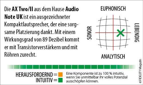 Die Audio Note AX Two/II ist ein ausgezeichneter Kompaktlautsprecher, der eine sorgsame Platzierung dankt. Mit einem Wirkungsgrad von 89 Dezibel kommt er mit Transistorverstärkern und mit Röhren zurecht.