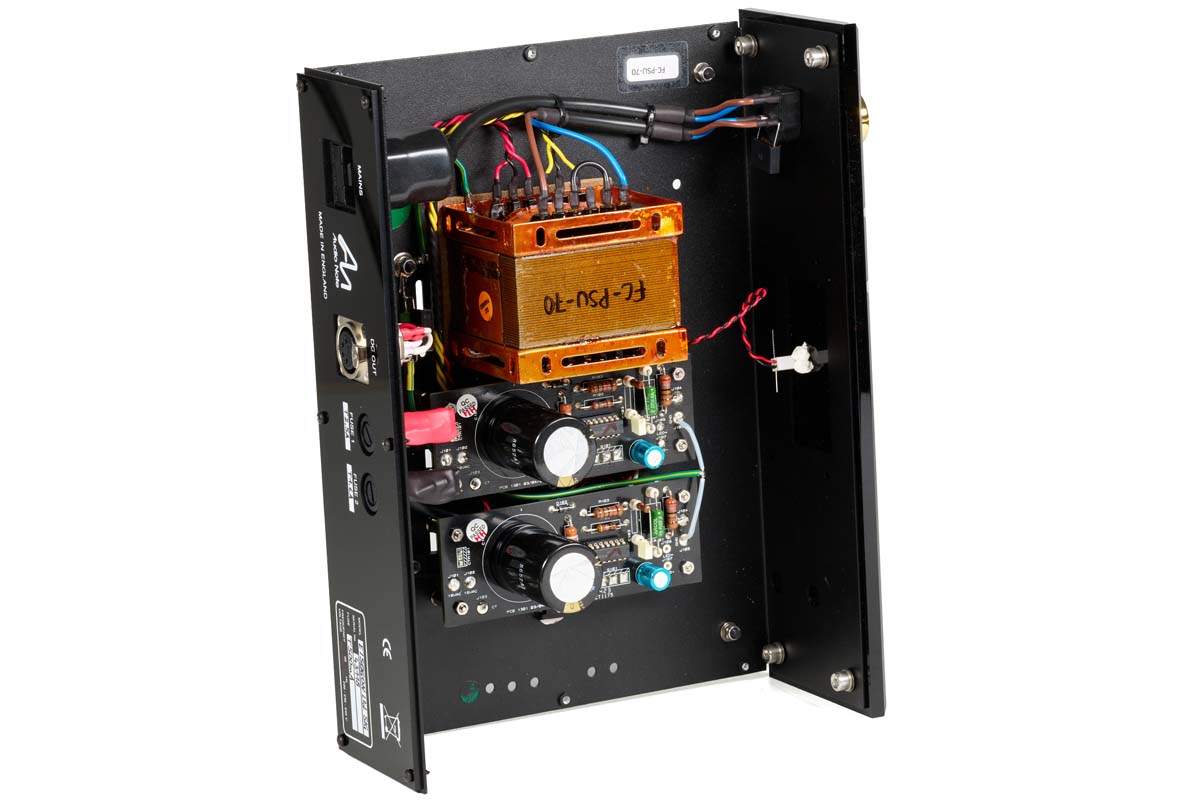 Die Entwicklung der zugehörigen Speiseteile war verglichen damit ein Spaziergang, was nicht heißt, dass es keine Stolperfallen gab. Wie Andy Grove uns erzählte, versuchte er es zunächst mit bewusst reduzierten passiven Netzwerken. Das funktionierte am Labor-Netzteil noch recht gut, doch offenbarten sich im freien Feldversuch zwei entscheidende Haken. Zum einen ist das Stromnetz nicht stabil: Schon leichte Schwankungen (hierzulande zappelt der Strom je nach Netzbelastung zwischen 220 und 240 Watt) führen dazu, dass ein passives Netzwerk von den vorgesehenen Arbeitsparametern abweicht. Außerdem erzeugt auch das Magnetfeld einer Spule unerwünschte Effekte, die sich über ein aktives Speiseteil aber größtenteils ableiten lassen. Und so entwickelten Grove und sein Team einen Spannungsgenerator mit eigenem Trafo und allem Drum und Dran. Um zumindest die Rahmenbedingungen simpel zu halten, verstauten sie alles elegant in einem kleinen schwarzen Kästchen.