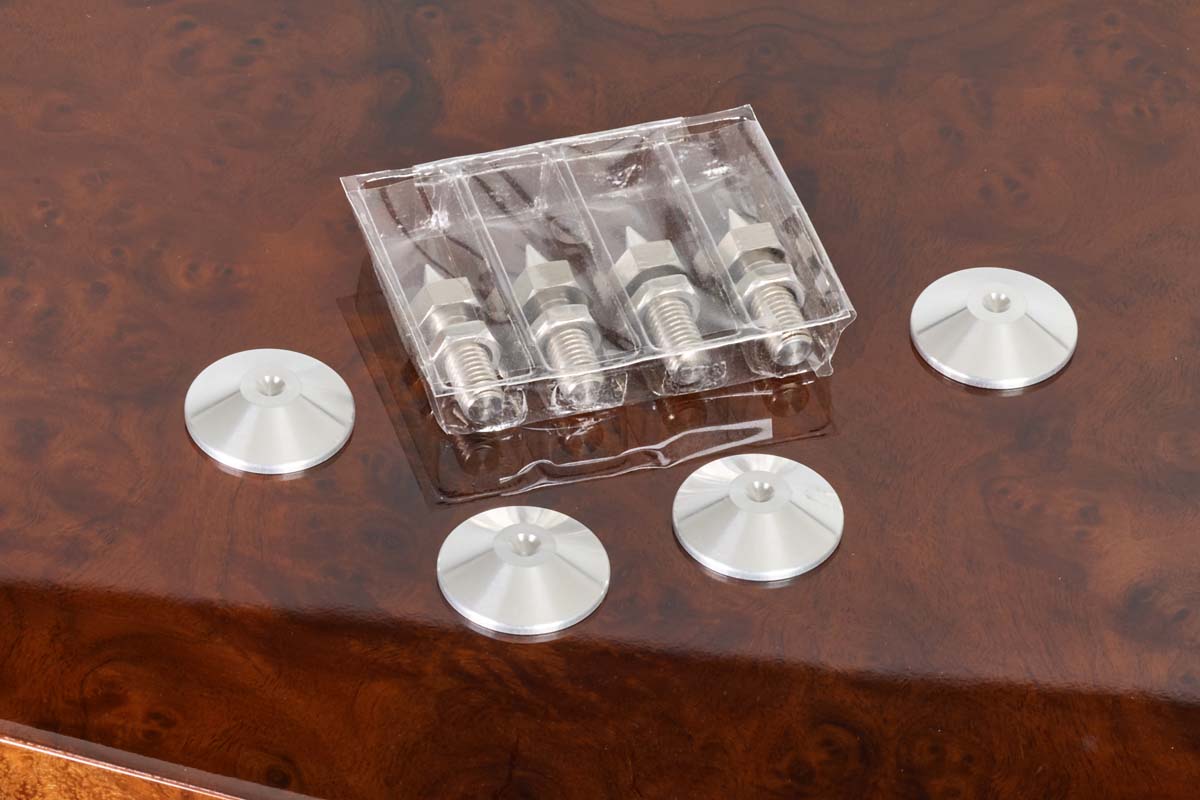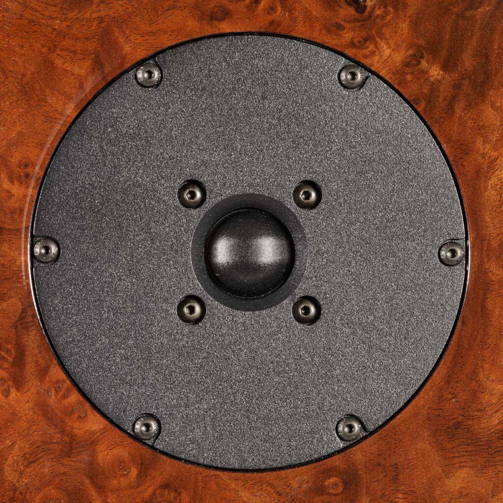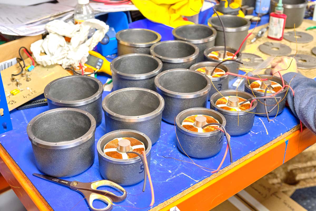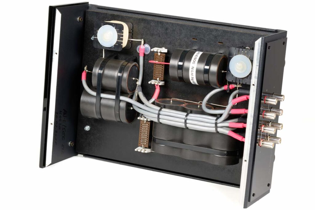 Wie uns Andy Grove erzählte, vermittelten ihm die Metallexperten in der Folgezeit tiefgreifendes Wissen über Legierungen, deren minimale Materialstärken, die jeweiligen magnetischen Wechselwirkungen und den optimalen Umgang mit all diesen Parametern. Grove entschied sich während der Zusammenarbeit für eine Abkürzung, indem er Proben der empfohlenen Metalle besorgte und sie von einem Betrieb im Umland von Brighton in Form fräsen ließ. So musste er die Midland-Mannen nur dann bemühen, wenn der kostenintensive Aufwand auch aussichtsreich schien. Auf diese Weise tastete er sich schrittweise an die endgültigen Treiber heran und verdreifachte unterwegs den Wirkungsgrad: Schluckten frühe Exemplare der AN-E Ltd 45 Watt Speisespannung, sind es beim aktuellen Modell nur noch 15 Watt – die Temperaturprobleme erübrigen sich dadurch. Und ehe ich vergesse, es zu erwähnen: Nicht nur der Tiefmittelton wird via Field Coil angetrieben, sondern auch der Tweeter.