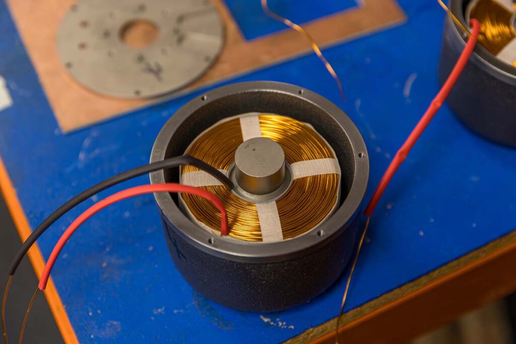Vermutlich genau deshalb greift der Audio-Note-Entwickler (wie etliche andere auch) lieber zu Alnico-Magneten, bei denen es weniger zu kaschieren gibt. Denn die sind schwächer und musizieren sauberer sowie entspannter, was man am Ende nicht nur hören, sondern auch fühlen kann. Mit dieser Erkenntnis im Hinterkopf wuchs Andy Groves Interesse, auch den Archetypen aller Lautsprecherantriebe auszuprobieren: die Feldspule.