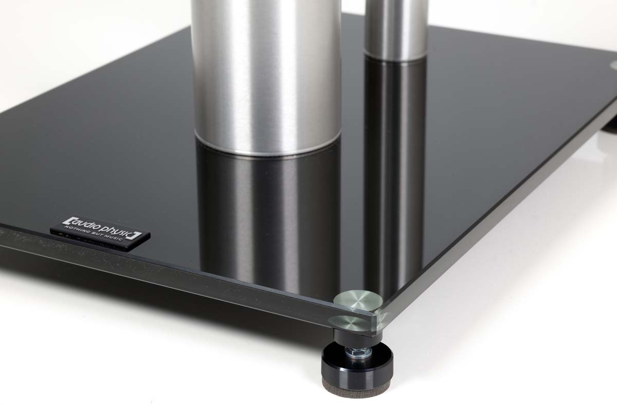 Kommen wir zu den Ständern: Die Kopfplatte der Sherpa M wird von zwei mit Sand befüllbaren Alu-Rohren getragen. Die Bodenplatte besteht aus schwarzem gehärtetem Glas, der Kontakt zum Fußboden wird mit speziell angepassten Entkopplungsfüßen hergestellt. Die Montage wirft keinerlei Fragen auf, über innen liegende Gewindestangen werden die Elemente miteinander verschraubt. Auf die Befüllung der Rohre mit Sand habe ich aufgrund der weiteren Transportwege verzichtet, was sich aber im Verlauf des Tests als unvorteilhaft herausstellen sollte.