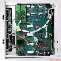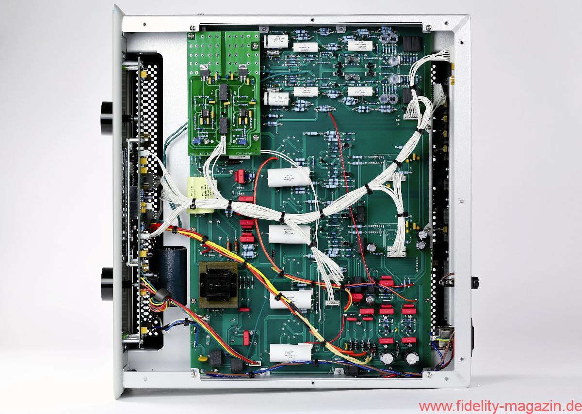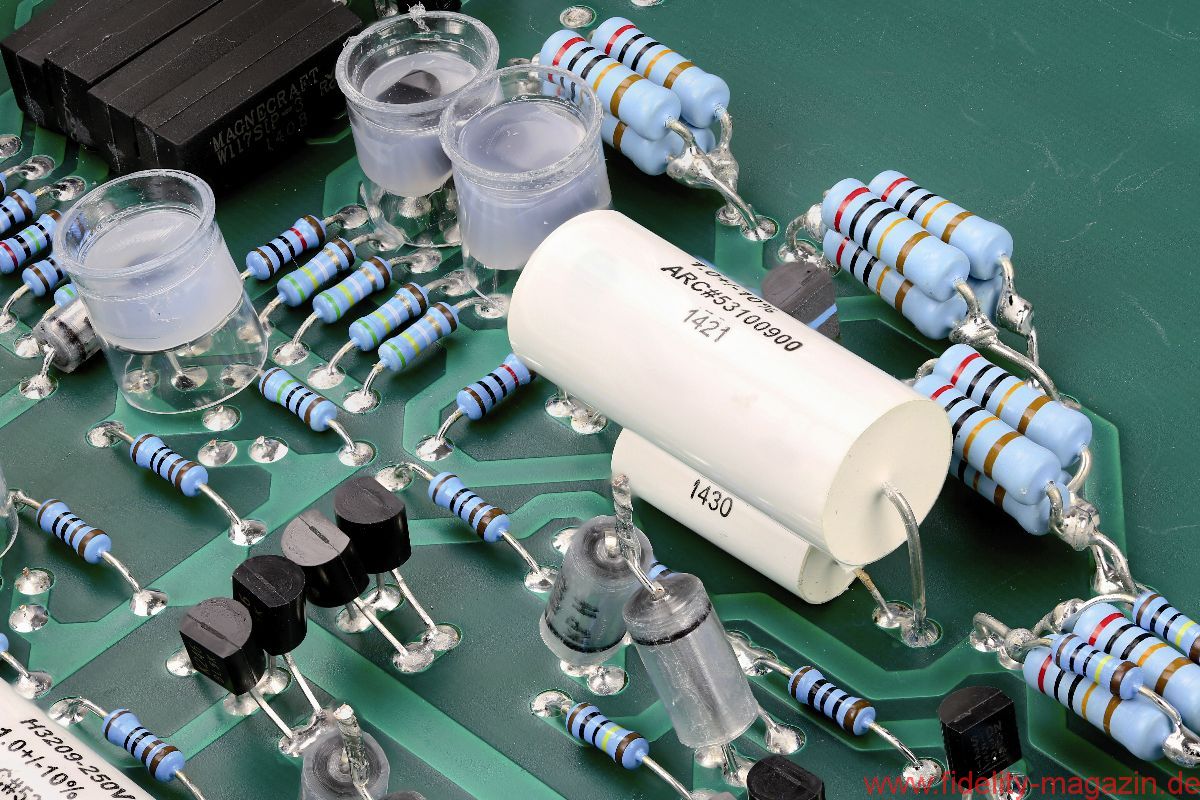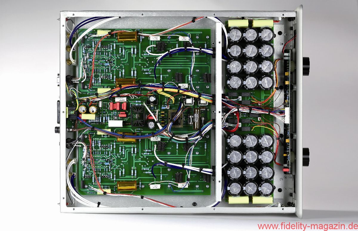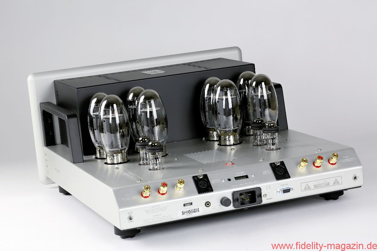 Eier aus Käfighaltung sind verpönt, aber wer mag, darf getrost die Haube auf dem KT150-Ensemble belassen. Zwei flüsterleise Ventilatoren im Heck des Käfigs verhindern zuverlässig einen Hitzestau beim Brüten. Drei große Zeigerinstrumente auf der Front der Endstufe informieren den Besitzer erstens über die abgegebene Leistung, zweitens darüber, wie genau die vorgesehene Betriebsspannung eingehalten wird, und drittens über den Ruhestrom jeder einzelnen Endröhre. Letzterer sollte von Zeit zu Zeit überprüft und gegebenenfalls korrigiert werden. Dazu wähle man über die Drehregler eine der durchnummerierten KT150er an und justiere mit dem beigepackten Werkzeug an den seitlich hinter der Front angebrachten kleinen Potentiometern den Ruhestrom auf den im Display mit „Bias“ markierten Sollwert – ein Kinderspiel.