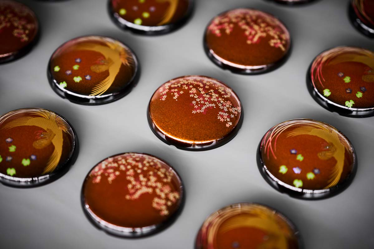 - Sakura- (Kirschblüten) und Hou-ou-Phönix-Motive werden in der japanischen Maki-e-Lacktechnik von Hand auf die Gehäuse gemalt