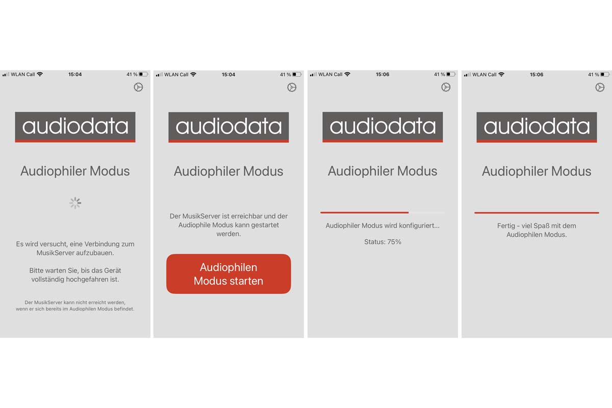Der Audiophile Modus ist explizit als Werkzeug für engagierte Audiophile gedacht, die es wirklich wissen wollen und darauf aus sind, das absolute Maximum aus ihren Aufnahmen herauszukitzeln. Im Normalbetrieb steuert sich der Audiodata MusikServerĀ MSĀ II per Smartphone über die gƤngigen Streaming-Apps wie jeder andere Streamer oder Server. Im Audiophilen Modus Ƥndert sich abgesehen von der fünfminütigen Aktivierungsphase und der Tatsache, dass man ihn nur durch physisches Ausschalten des Servers wieder verlassen kann, nichts Wesentliches. Der Klanggewinn ist allerdings klar greifbarĀ ā ich würde den MSĀ II gar nicht andersĀ benutzen.