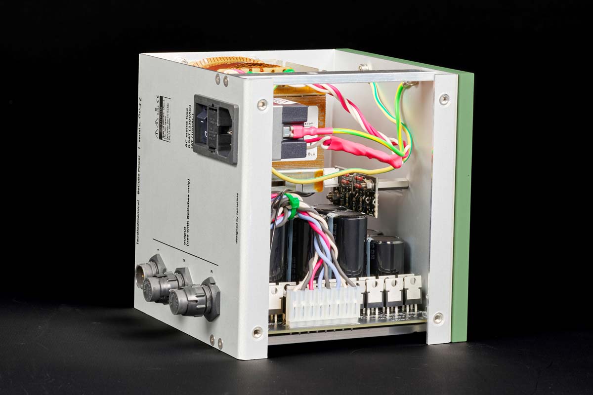 Das Netzteil ist sicher das ungewöhnlichste Gerät in diesem Ensemble. Es eignet sich ausschließlich für BeCube-Geräte und ist mit vier Kilogramm die „schwerste“ Komponente der Testanlage. Der Transformator hat mehrere sekundäre Wicklungen und einen geringen Magnetfluss, kann also mehrere Ausgangsspannungen bereitstellen und entwickelt kaum Wärme. Analoge und digitale Output-Stage sind voneinander getrennt, wobei im Analogen Leistungs-MOSFETs zum Einsatz kommen. Man darf also einen geringen Rauschpegel bei der Spannungsumwandlung erwarten. Wie alle BeCubes ist auch der Power-Cube aus Aluminium. Die Gehäuse bestehen aus vier einzelnen Elementen, für deren Zusammenhalt nur vier Schrauben benötigt werden. Die Frontplatten lassen sich jeweils austauschen und auf Wunsch farblich oder mittels Laserprinting auch motivisch personalisieren. Wem die Farbpalette aus Silber, Schwarz, Weiß, Grün, Rot und Blau nicht ausreicht, dem steht gegen Aufpreis (um die 100 Euro) die gesamte RAL-Palette an Farben zur Verfügung.