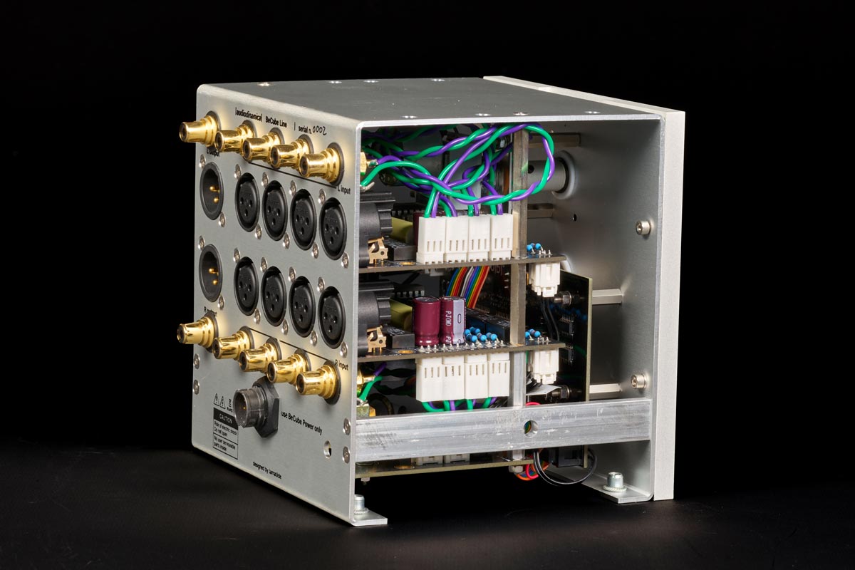 Besonders eng geht es in der Vorstufe BeCube Line zu. Die Schaltung ist ebenso kompakt wie aufwendig: Das differenzielle Layout unterbindet symmetrische Störeinflüsse. Auf der Rückseite findet sich gerade so Platz für die vier Line-Level-Eingänge sowie die Ausgänge, die jeweils in XLR und Cinch ausgeführt sind.