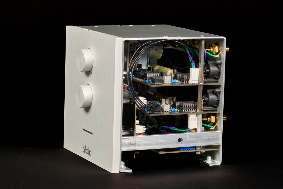 Das ist nicht nur ein ordentlich sortierter Gerätepark, sondern angesichts des Innenlebens eine ziemliche Kampfansage. Denn die kleinen Kuben sind angetreten, so manch größeres und teureres Gerät in den Schatten zu stellen. Viel Platz steht für die Bestückung nicht zur Verfügung, da braucht man Ideen und erstklassige Bauteile. So ist der Vorverstärker nicht diskret aufgebaut, sondern differentiell. Transistorseitig kommen pro Kanal konsequenterweise je zwei jFETs zum Einsatz, die symmetrisch arbeiten. Damit vermeidet Audiodinamica die Entstehung von Rauschen in der Signalverarbeitung.
