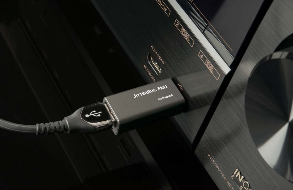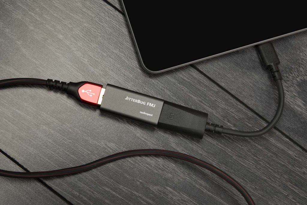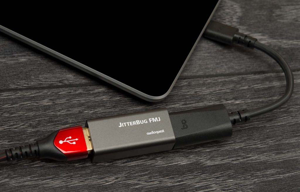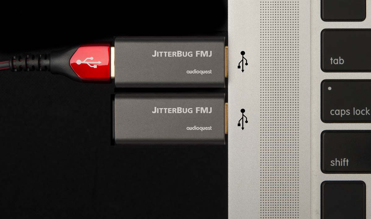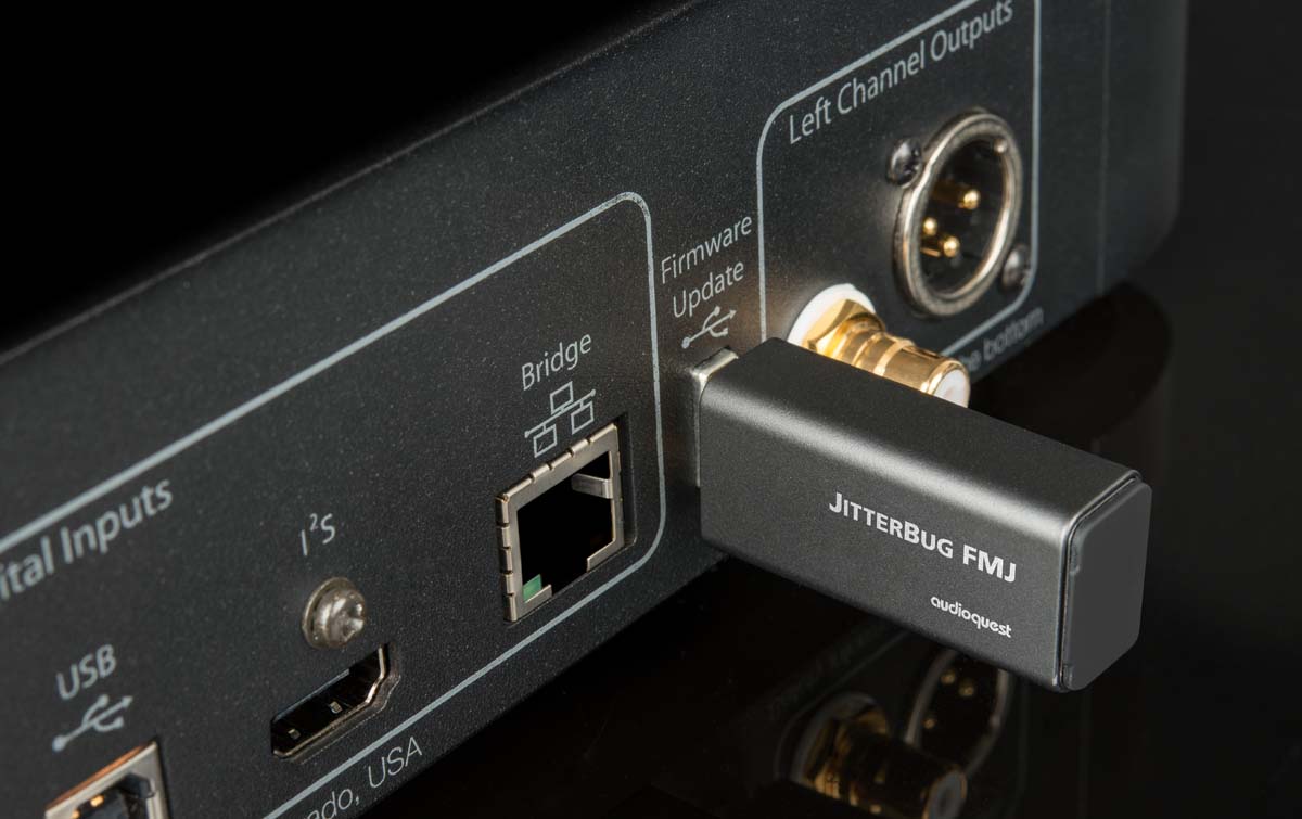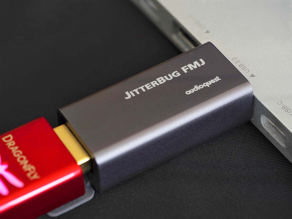 Der jüngst vorgestellte Jitterbug FMJ soll die Erfolgsgeschichte nun fortschreiben. Er entspricht prinzipiell seinem Vorgänger, kostet gleich viel und ist doch anders. Zunächst ist er in ein dunkelgraues Metallgehäuse – „Full Metal Jacket“, das erklärt auch den Namenszusatz „FMJ“ – gewandet, während der alte noch Kunststoff trug. Die Abdeckung für den USB-Anschluss, der nur in Reihenschaltung (für den Anschluss eines USB-DACs) offen liegen muss, wurde neugestaltet: Laut AudioQuest halte das carbonhaltige, gummiartige Material hochfrequente Störsignale fern, die von außen in das kleine Gehäuse eindringen könnten.