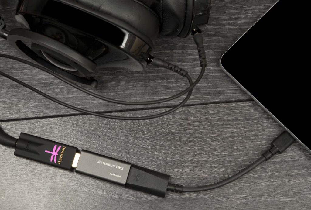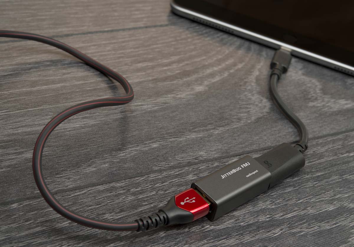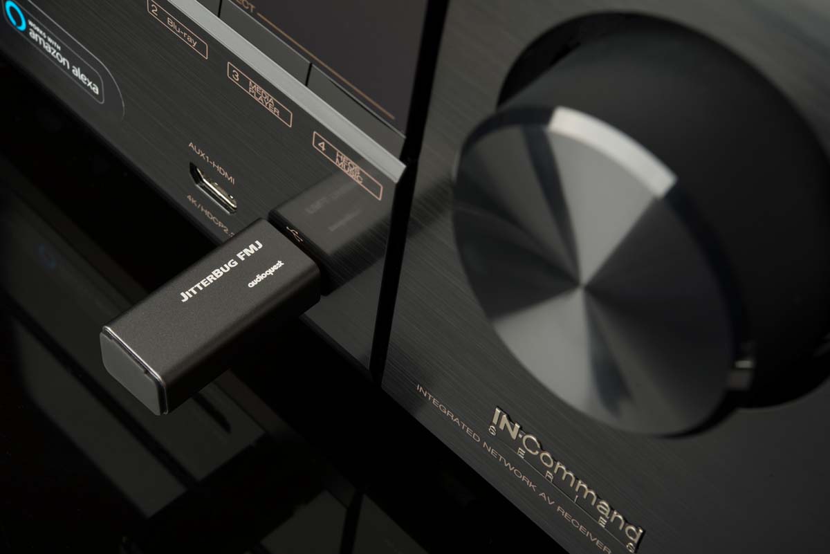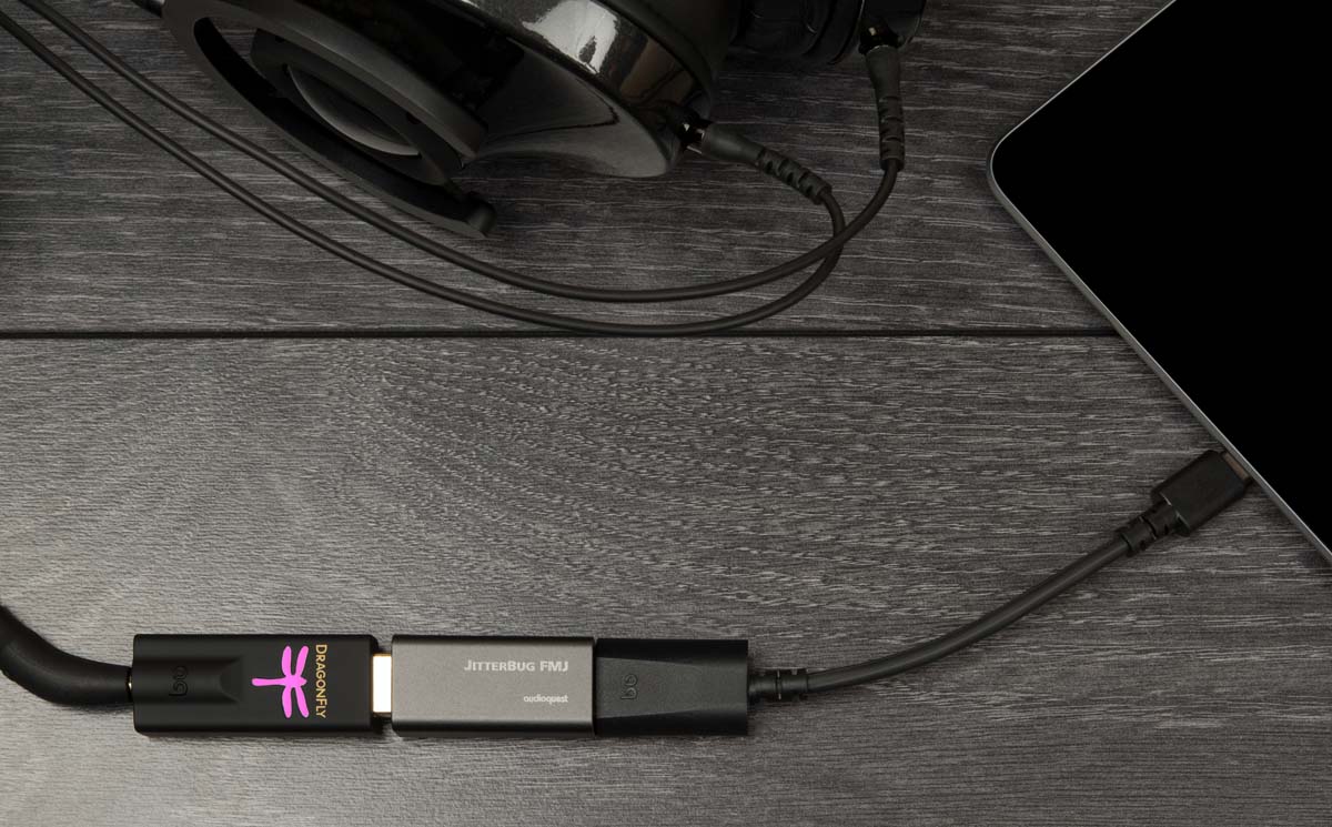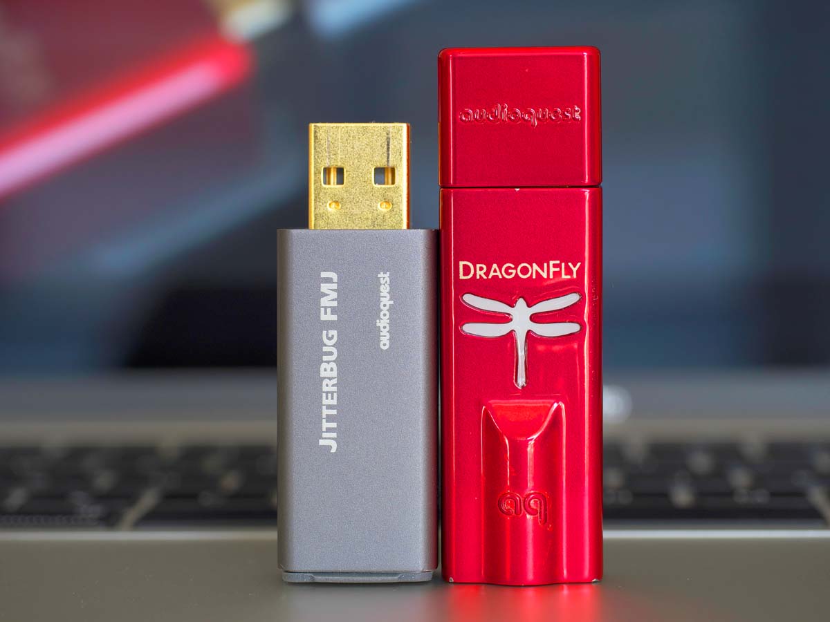 Der jüngst vorgestellte Jitterbug FMJ soll die Erfolgsgeschichte nun fortschreiben. Er entspricht prinzipiell seinem Vorgänger, kostet gleich viel und ist doch anders. Zunächst ist er in ein dunkelgraues Metallgehäuse – „Full Metal Jacket“, das erklärt auch den Namenszusatz „FMJ“ – gewandet, während der alte noch Kunststoff trug. Die Abdeckung für den USB-Anschluss, der nur in Reihenschaltung (für den Anschluss eines USB-DACs) offen liegen muss, wurde neugestaltet: Laut AudioQuest halte das carbonhaltige, gummiartige Material hochfrequente Störsignale fern, die von außen in das kleine Gehäuse eindringen könnten.